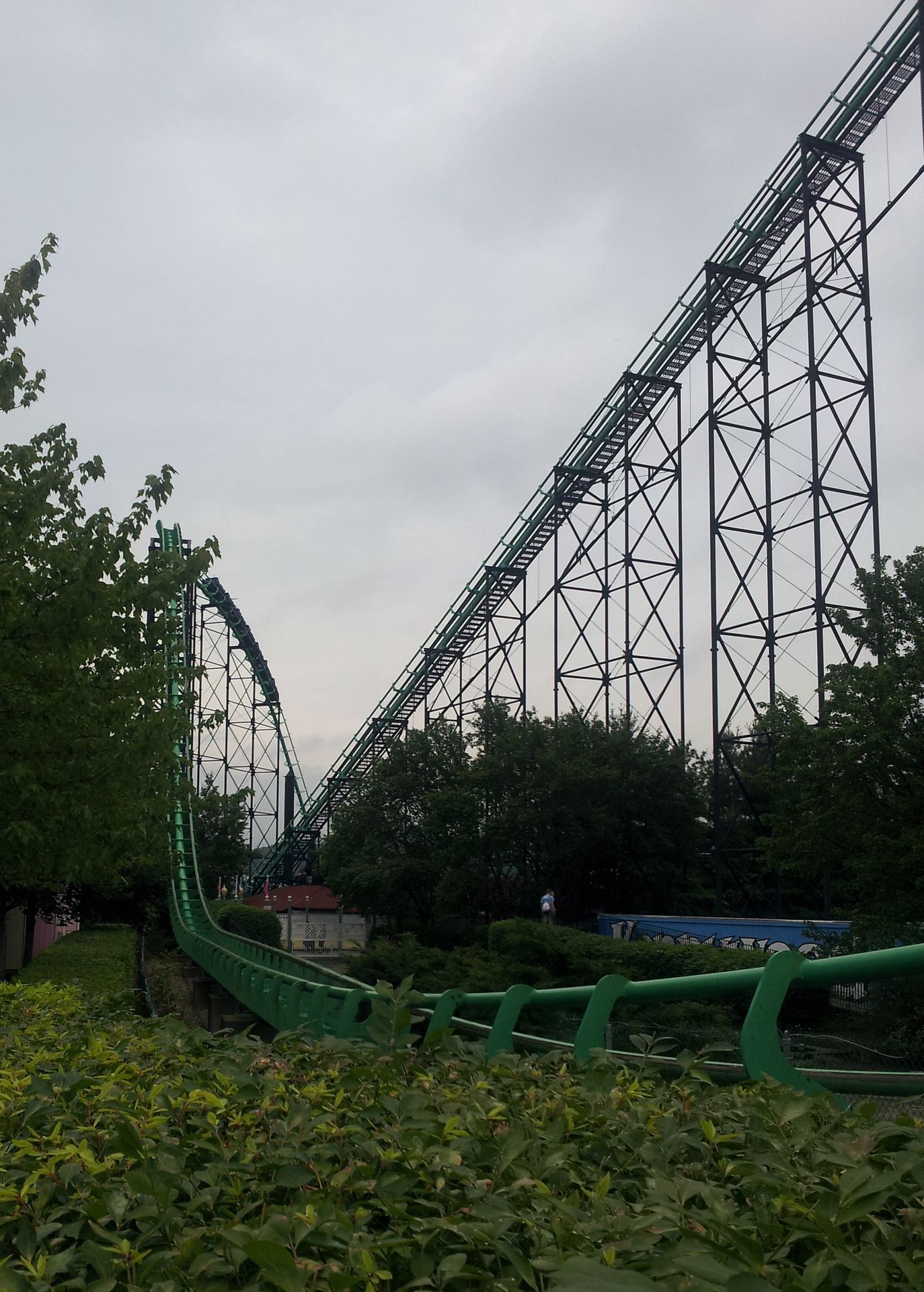 Wie man schön sieht, sind hier noch Schienen von Arrow verbaut. Denn die bauten 1991 die damals schnellste Stahlachterbahn der Welt mit dem Namen Steel Phantom. Neben der Geschwindigkeit sollten vor allem vier Inversionen für Begeisterung sorgen. Allerdings kennt ja jeder von uns die typischen Fahreigenschaften von Arrow. So sorgten wohl besonders die Inversionen eher für Ohrfeigen als für Spaß. Trotzdem war die Bahn noch recht beliebt, als der Park im Jahr 2000 ihren Abriss bekanntgab. Letztendlich hatte man aber einen genialen und doch riskanten Plan. Denn statt eine komplett neue Bahn zu bauen, wollte man das beste von Steel Phantom beibehalten und mit neuen Elementen aufwerten. Insbesondere der Verzicht auf Inversionen sollte dafür sorgen, dass die Bahn noch beliebter wird als zuvor.