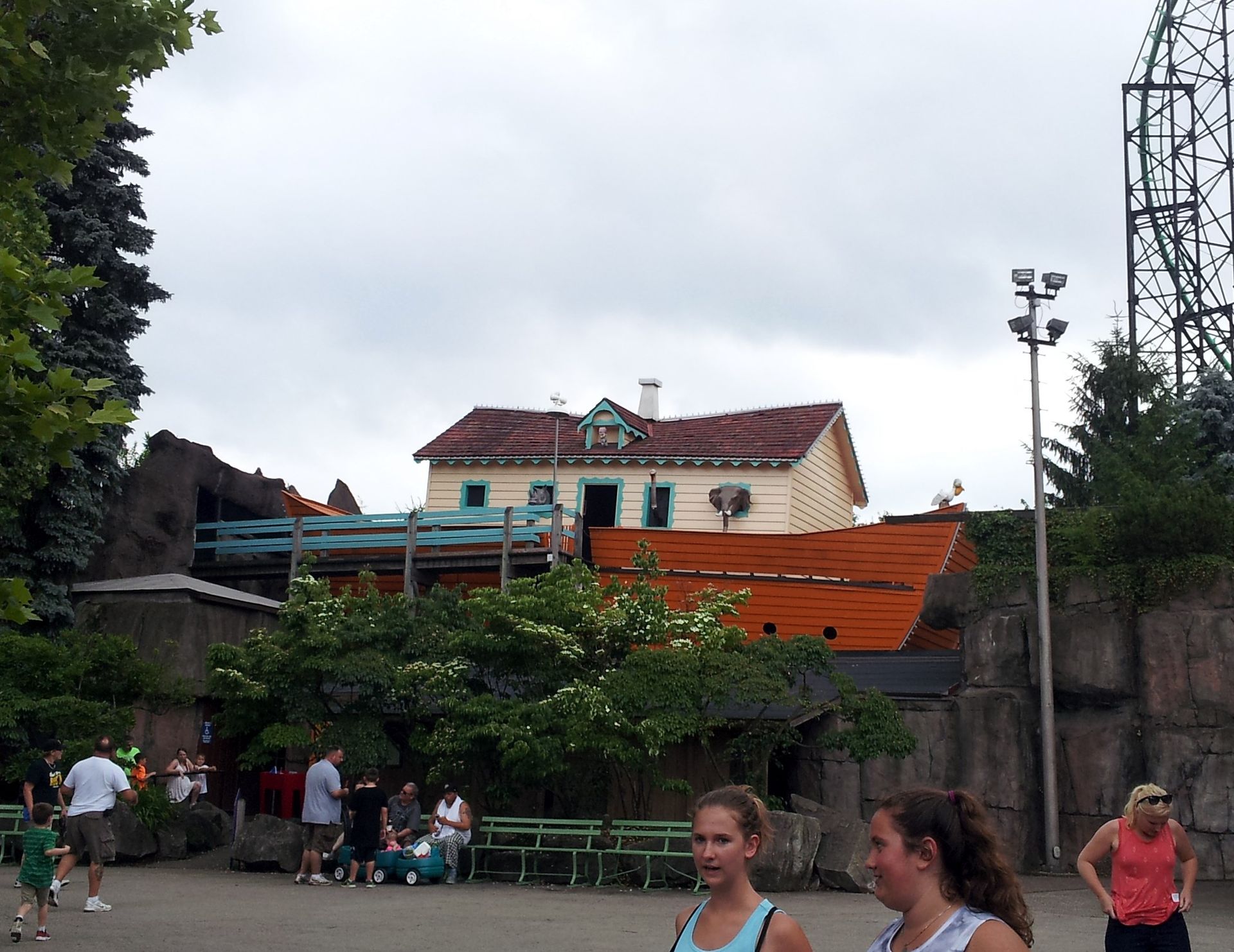 Wir dachten eigentlich, es gäbe so gut wie keine Wartezeit. Dass der Eingang erst auf der anderen Seite des "Berges" liegt und eine Schlange durchaus vorhanden war, hatten wir dabei natürlich nicht gesehen. Und da es sich bei Noah's Ark um einen Walkthrough aus dem Jahre 1936 handelt, wurden die Besucher nur in kleinen Gruppen eingelassen, was die Wartezeit erheblich in die Länge zog.