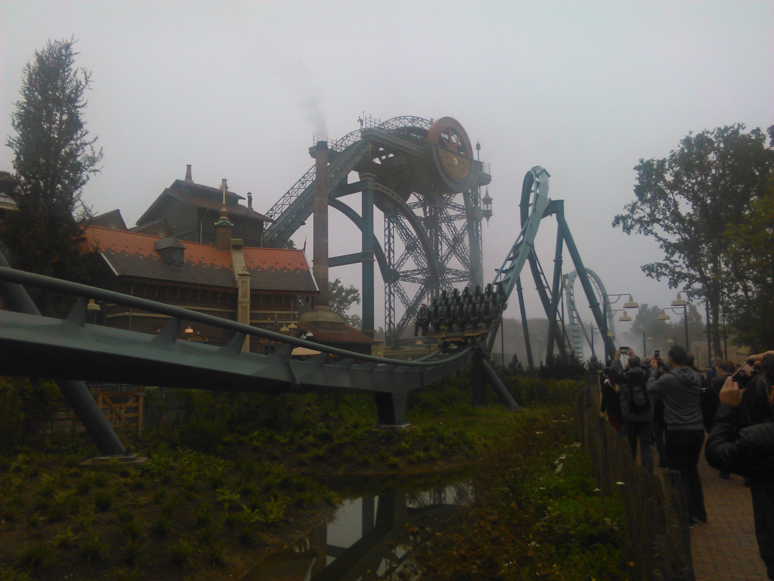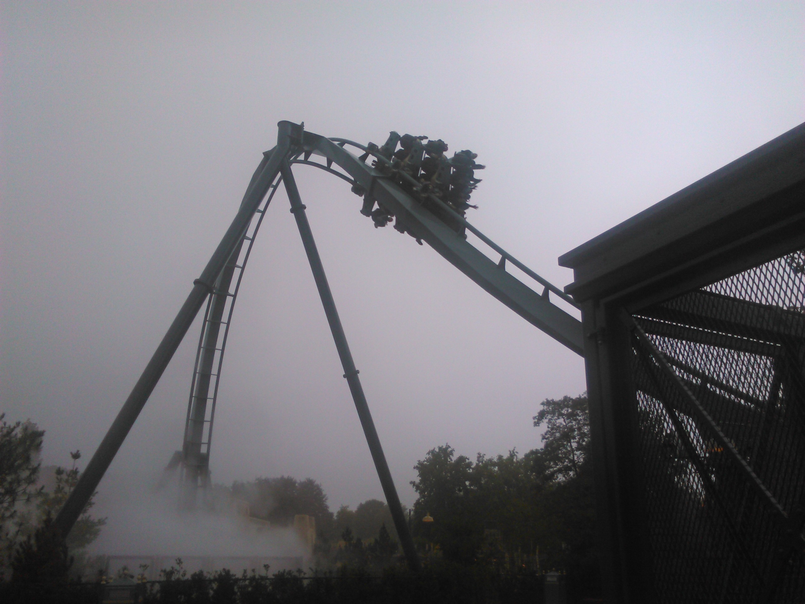 First Drop wurde mit Blickrichtung Pirana und See angelegt. Über der Kuppe wird der Zug angehalten und wir hängen in der ersten Reihe nun mit baumelnden Füssen mit Blickrichtung wo die Schine im Nebel in einem Loch verschwindet. Was dann folgt ist ein wilder Ritt mit zwei Inversionen.