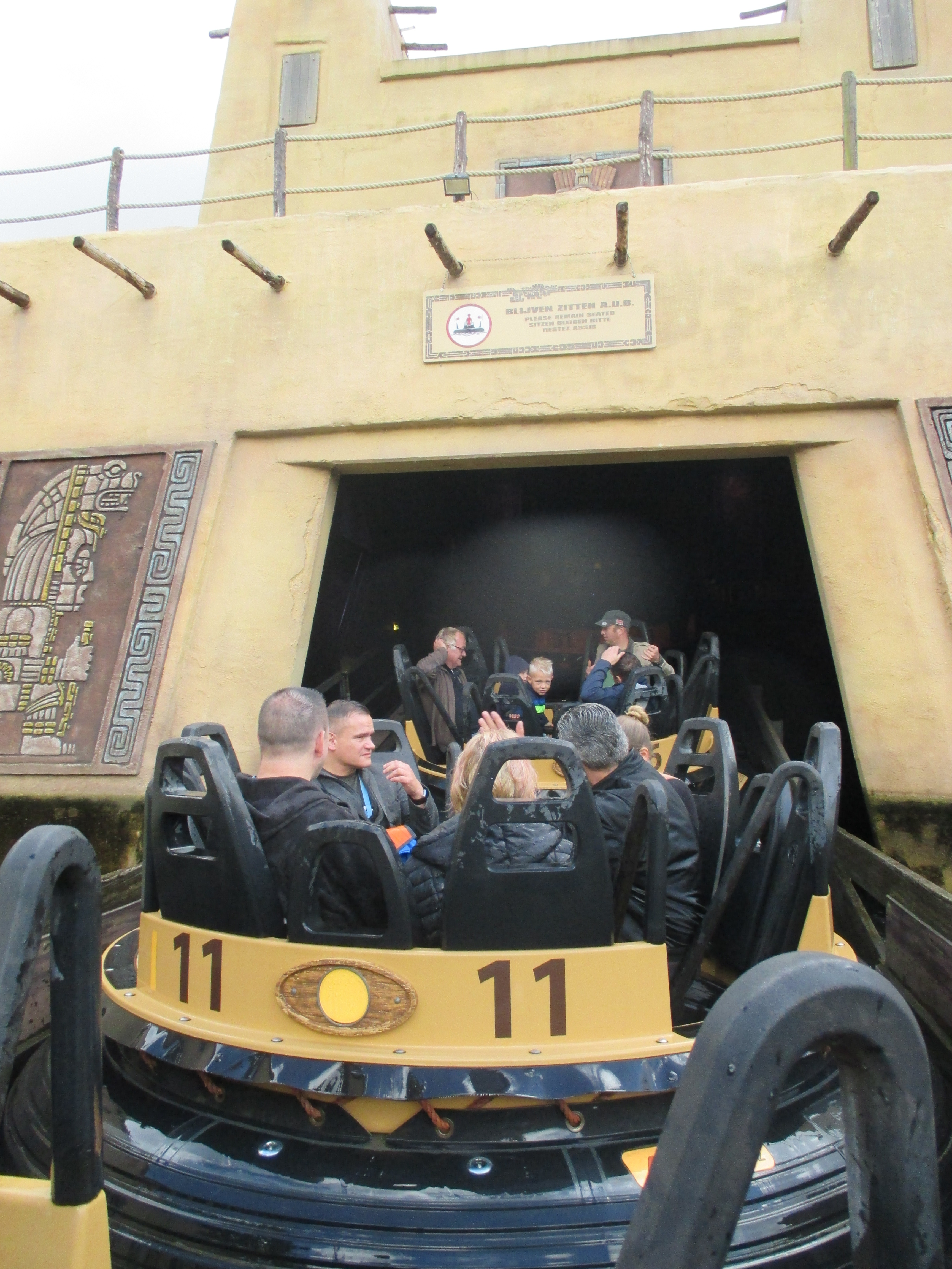 Im nächsten Preshowraum wird man auf die Sitzreihen verteilt während der Baron-Animatronic auf Holländisch erzählt. Aus den Worten bleiben mir Fetzen hängen: Glück auf! Wir sollen Gold für ihn schürfen und sein Name sei Hochmut - der kommt ja bekanntlich vor dem Fall. Und schon öffnen sich die drei Zugangstüren und wir stehen im Eingangsbereich zu den Achterbahnzügen. Derer gibt es wohl drei.