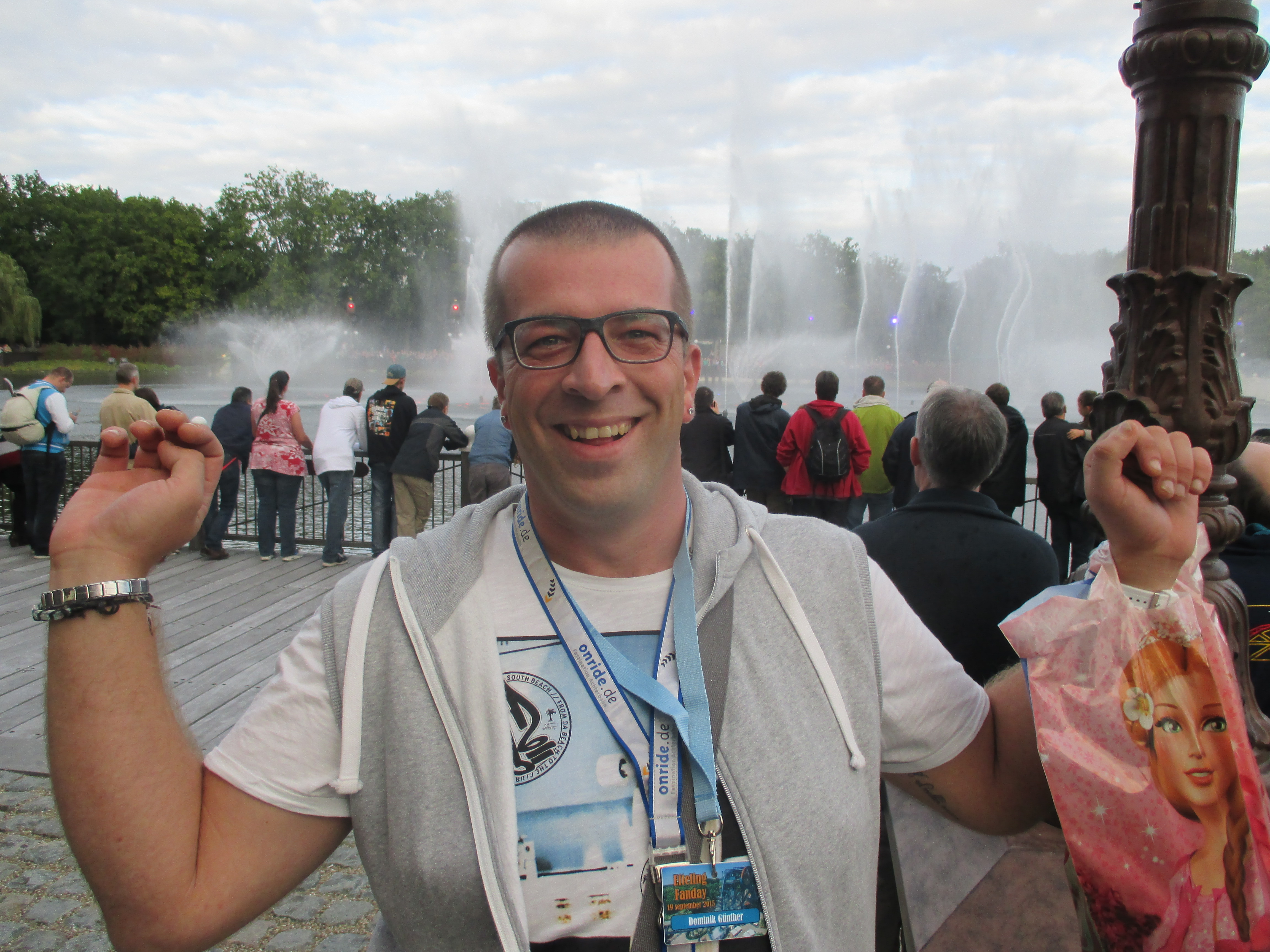 Es folgen Droomfluch, Villa Volta, Volk van Laaf (hier steigen Bruno und Anita aus, da Bruno durch Erkältung lädiert ist - Gute Besserung an dieser Stelle!), Carousselpalais, Vogel Rok, Familie Weinreich, Fata Morgana, Essen aus der Wand, Bobbahn, Piarana, Rave-Ritterdrama, Vogel Rok, Schiffschaukel und schwupp ist schon 18:00 Uhr und wir treffen auf alle anderen Teilnehmer, um uns die Wasserschau im extra reservierten Teil des Sees anzusehen.