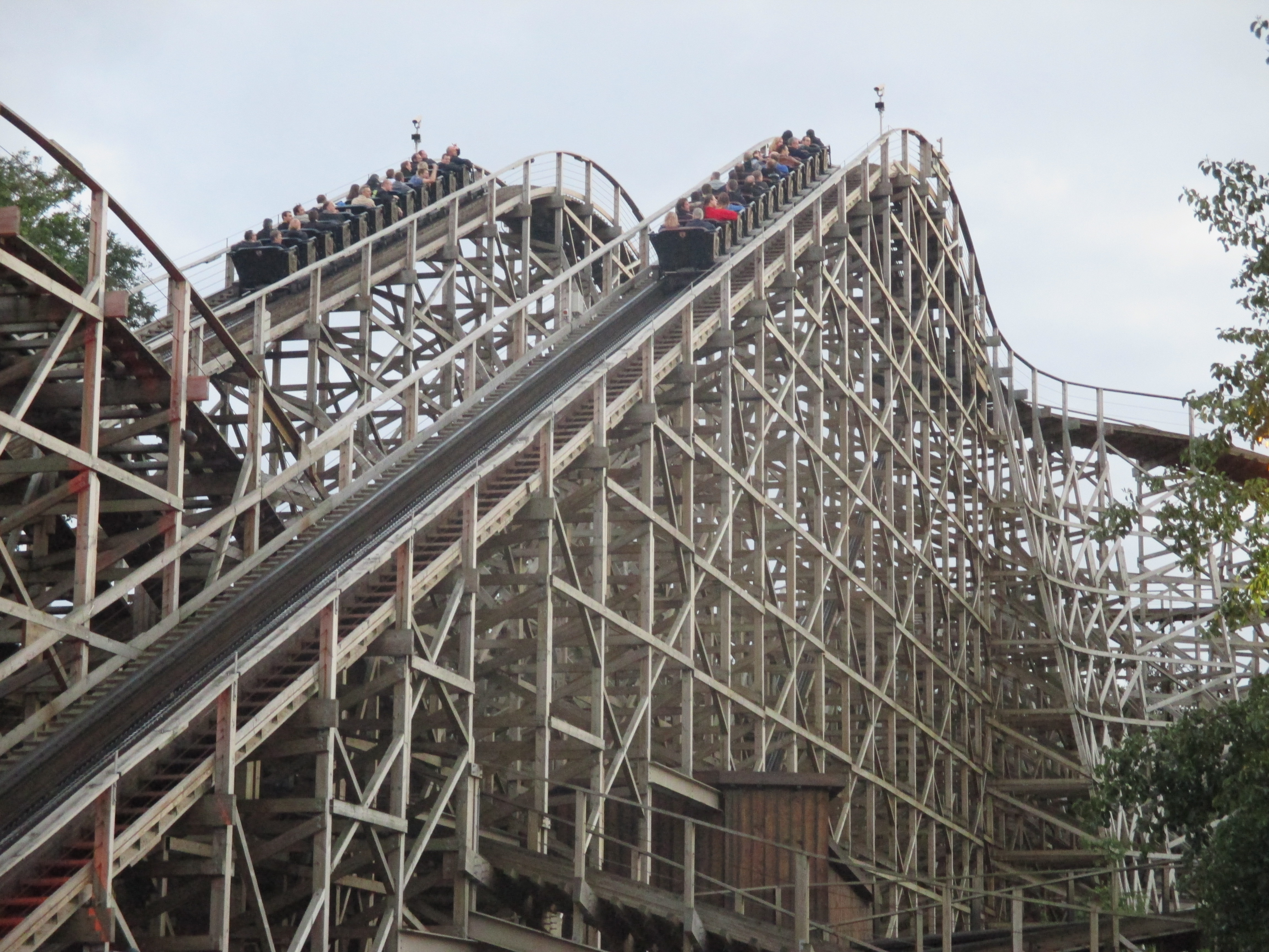 Mir reichen zwei Fahrten am Stück auf der Python - ein drittes Sitzenbleiben winke ich dem Ride-OP ab. Danach geht es nur nochä über Holz. Wieder und wieder sitzen Thomas und ich entweder im Gewinner- oder Verliererzug. Und langsam geht dabei über Kaatsheuel die Sonne unter.