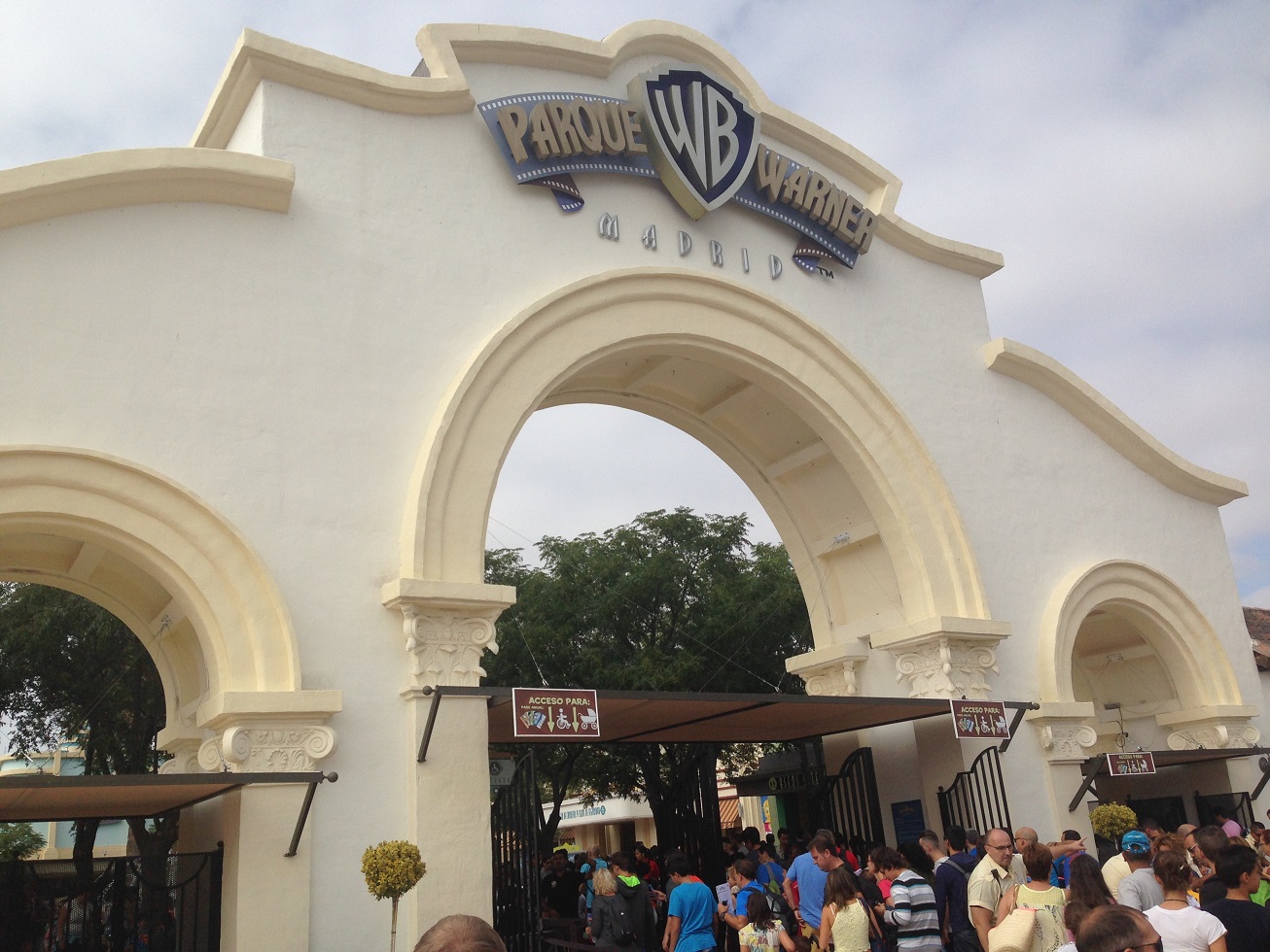 Parquue Warner Madrid ist einer der zwei großen Themenparks in Madrid und zudem der größere von beiden. Der 2002 eröffnete Park gliedert sich in fünf Themenbereiche, welche ich mit Stormrunner am 5.9.2015 besucht habe. Eines vorweg: im folgenden Bericht werde ich auf Beschreibungen jeglicher Streckenverläufe verzichten, da man sich diese, falls man interessiert ist, auch selber in diversen POVs angucken kann. Vielmehr werde ich meine persönliche Meinung kundtun und mit mir bekannten Attraktionen vergleichen. Beginnen wir mit unserem Rundgang durch den Park, wie jeder Besucher auch, am Haupteingang. Hinter dem riesigen Parque Warner Tor sollte einer der interessantesten Parks auf mich warten. Das Tor erinnert mich stark an den Eingang des Movie Parks Germany, ist jedoch viel gewaltiger und beeindruckender.
