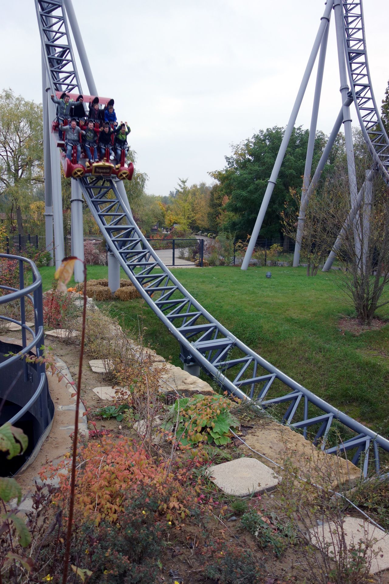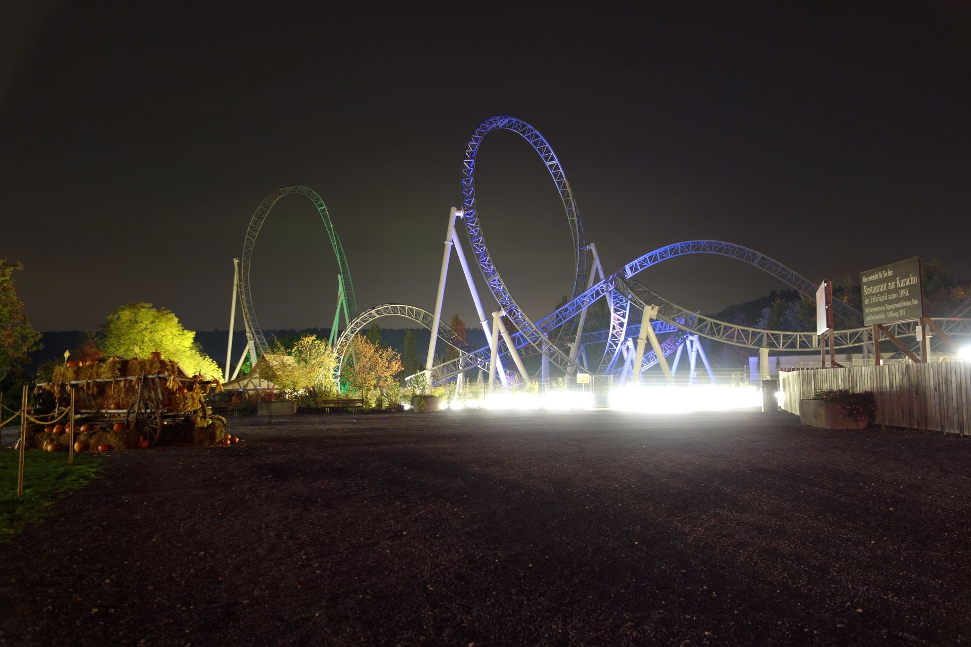 Die meisten Besucher hatten natürlich nur das vergünstigte Abendticket in Anspruch genommen, sodass erst zu den schaurigen Altweibernächten ab 18 Uhr der Park etwas voller wurde. So reichte die Warteschlange bei Karacho nun bis an die Tafel mit den technischen Daten. Doch etwa 3-4 Züge bevor wir an der Reihe gewesen wären, ließ man die Gates geschlossen. Die Besucher aus dem dahinter wartenden Zug befreite man dort mit dem mobilen Evakuierungsgerät (wie auch immer das richtig heißt). Den dritten Zug konnten wir nicht sehen, dessen Fahrgäste kamen allerdings wenig später im Untergeschoss zurück in die Station und holten dort ihre Sachen aus dem Schrank. Nachdem die Mitarbeiter einige Zeit herumtelefoniert hatten, schickte man uns schließlich alle raus.