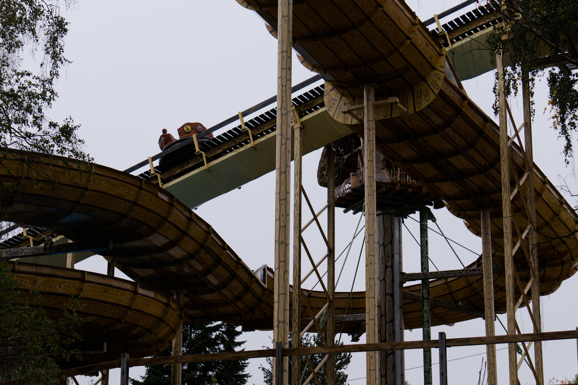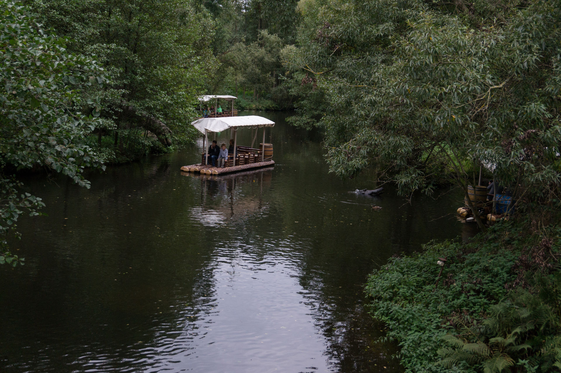 Auf der anderen Seite des großzügig ausgelegten Platzes befindet sich der Zugang zur Wildwasserbahn mit Geisterbahn, wobei sich der Geisteranteil wahrscheinlich nur zu Halloween wirklich zeigt. Nachdem man die Station verlassen hat führt der Kanal das Boot durch eine kleine Themenpassage in Richtung des ersten Lifthügels. Oben angekommen erfolgt auch sogleich die erste Schussfahrt, welche einen ein wenig befeuchten kann. Nach einer Wende und einer Rechtskurve verlässt man das Plateau und kurvt ein wenig in Zickzackbewegungen durch die Baumwipfel und über das zweite Gefälle hinweg bis nach einer weiteren Rechtskurve der zweite Lift erreicht wird. In luftiger Höhe vollführt man nun eine weitere Wendekurve woraufhin man sich langsam aber sicher der großen Abfahrt nähert. Ohne großen Schnickschnack geht es nun die Schussfahrt hinunter an dessen Ende das kühle Nass wartet und dabei ordnungsgemäß befeuchtet. Es folgt die Rückfahrt zur Station dieser recht ordentlichen Wildwasserbahn.