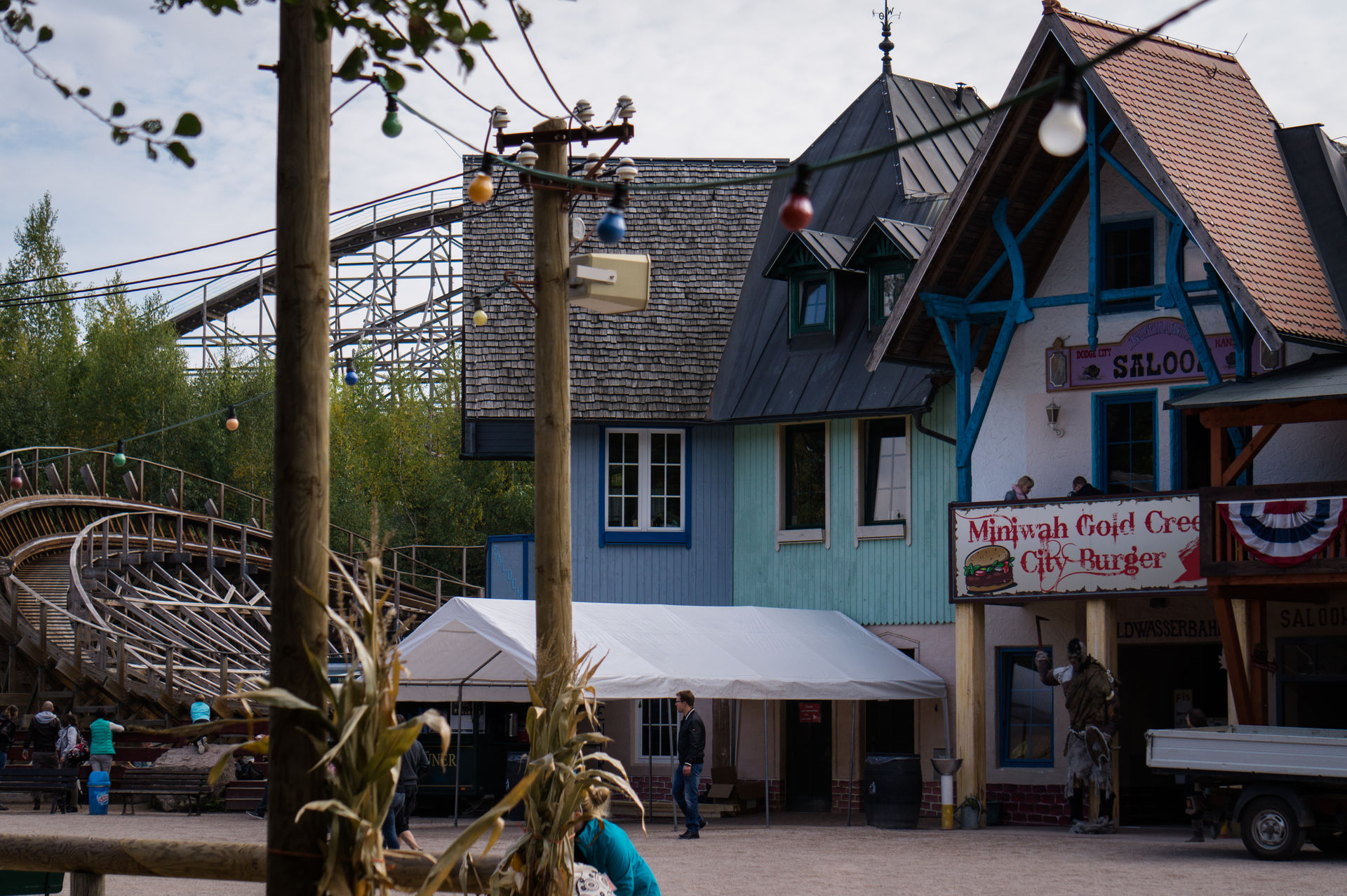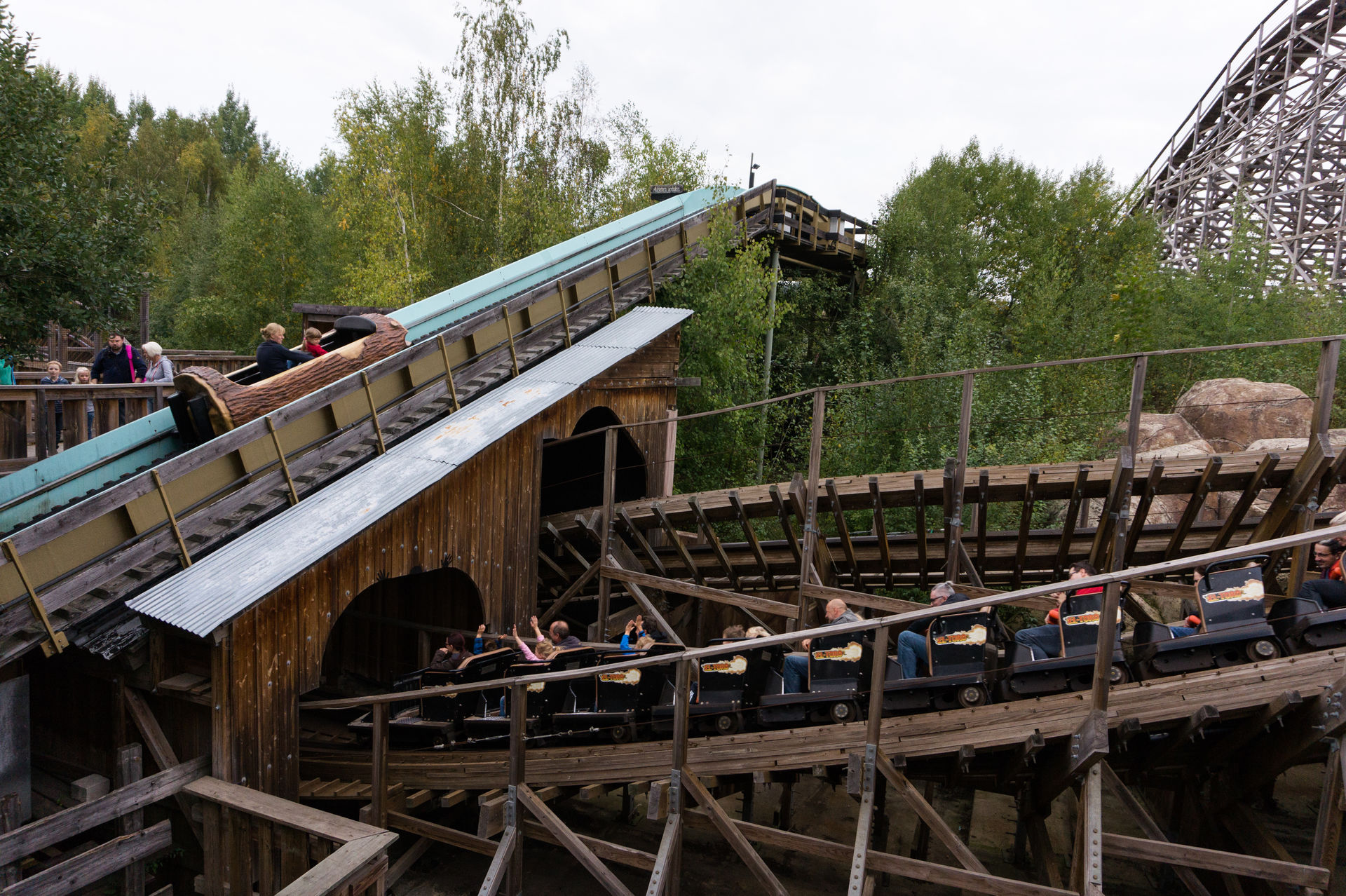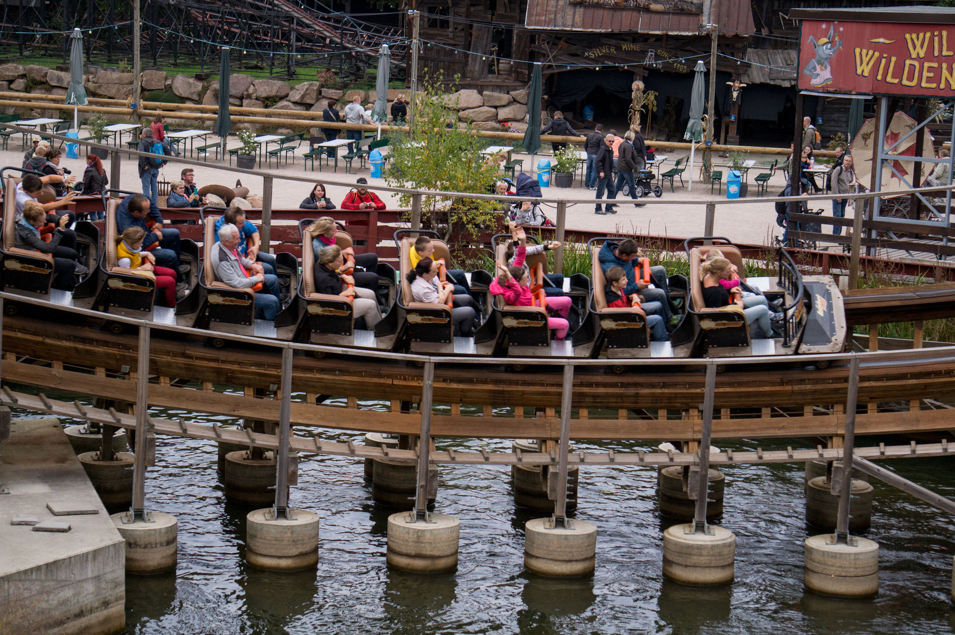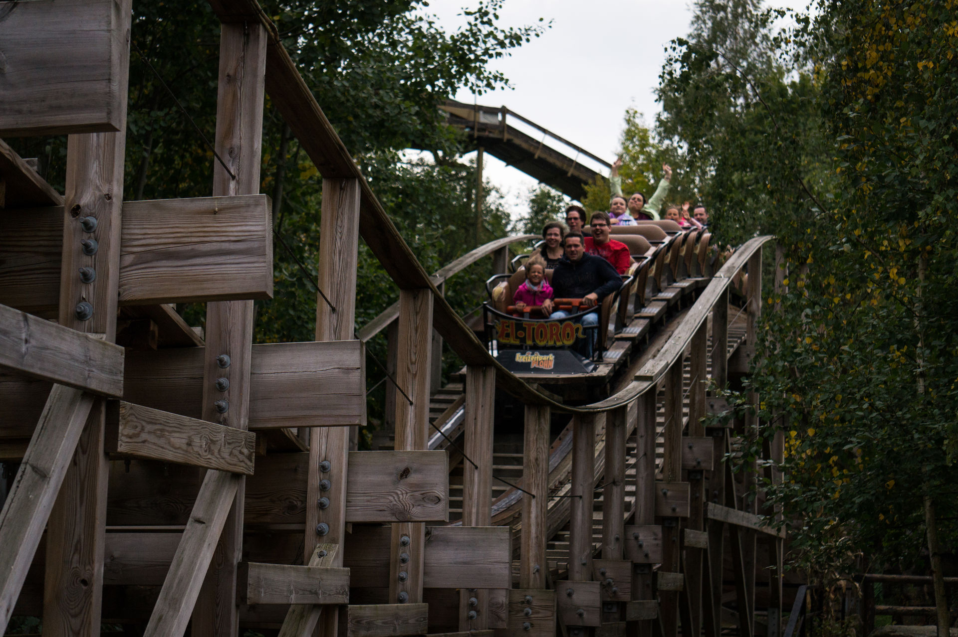 Durch einen Durchgang gelangt man in der Westernstadt, dem Westernbereich des Parks und steht sogleich vor der Holzachterbahn El Toro des amerikanischen Herstellers Great Coaster International. Entlang der hinteren Wende der Achterbahn kann man, ebenso von der anderen Seite kommend, zum Zugang der Holzachterbahn gelangen. Nach einer kleinen Rampe steht man sogleich in der Station und hat nun mehr oder weniger freie Platzwahl, denn viel los war hier trotz des anlagenbedingten Einzugbetrieb nicht.