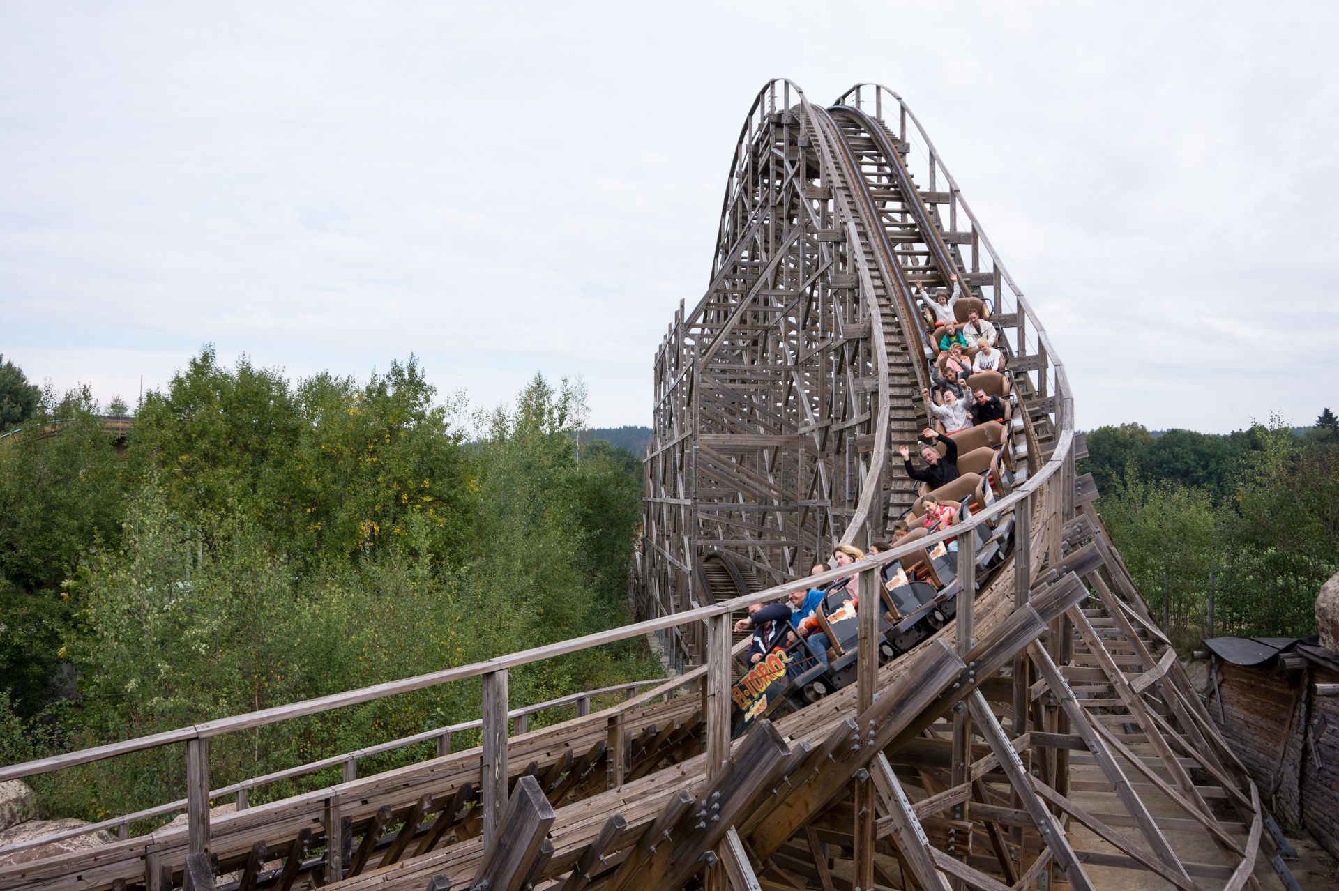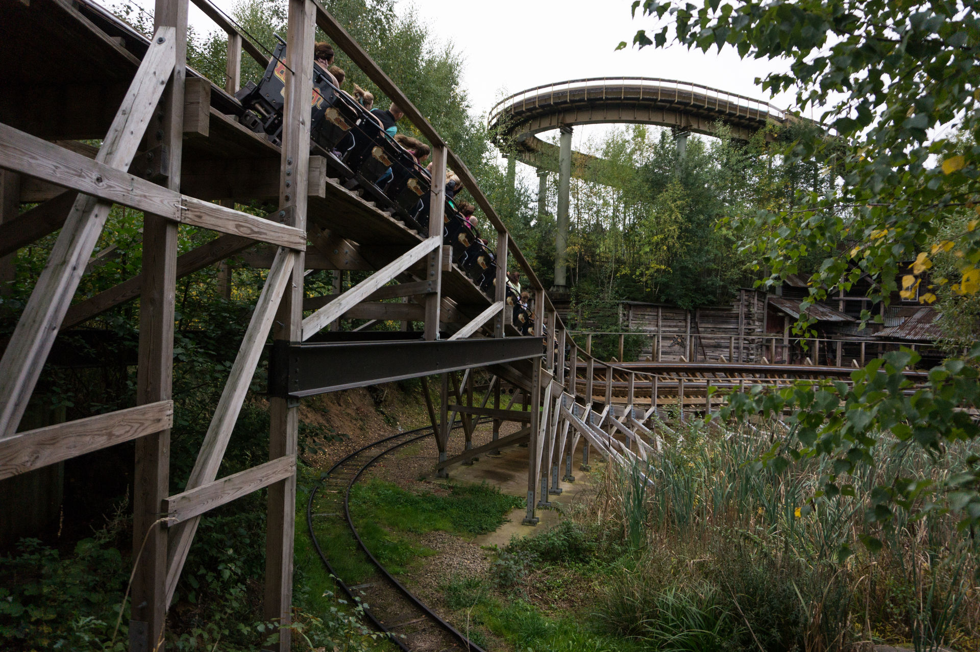 Nachdem der Zug endlich abgefertigt wurde befördert einen die Liftkette in eine Höhe von etwa 25m. Mit ordentlichen Schwung vollzieht man nun das erste Gefälle, welches recht geradlinig eingeleitet wird ehe es in eine Steilkurve übergeht. Im Tal unterfährt man zum ersten Mal den Lifthügel der Wildwasserbahn und vollzieht währenddessen sogleich einen Richtungswechsel. Eine aufwärtsführende Linkskurve schließt sich an, wechselt aber relativ flott ihre Richtung. Nun führt eine weite Kurve den Zug an den tiefsten Punkt des Layouts, doch auch hier verweilt man nur kurz. Über einen Hügel hinweg drischt der Wagenverbund erneut unter den Lifthügel der Wildwasserbahn hindurch und kurz darauf durch eine Kurve parallel zum