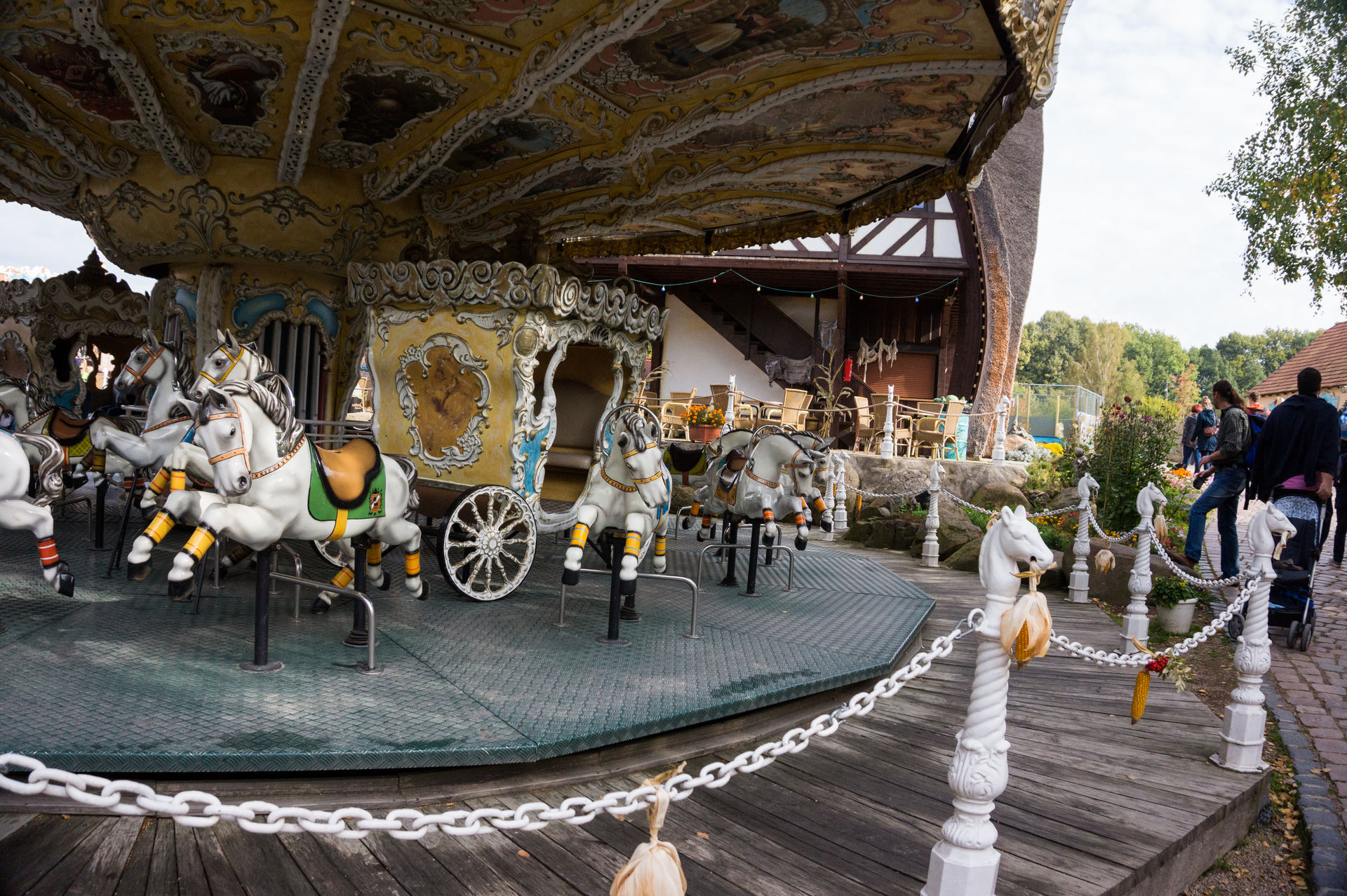 So überzeugend und stimmig die Westernstadt doch ist, so unschön ist der Oldtimerpark auf der anderen Seite des Weges mit seiner Seebühne und kleineren Kinderattraktionen. Hier befindet sich auch die letzte Achterbahn des Parks, die Kinderachterbahn Raupe, ein Big Apple des Herstellers