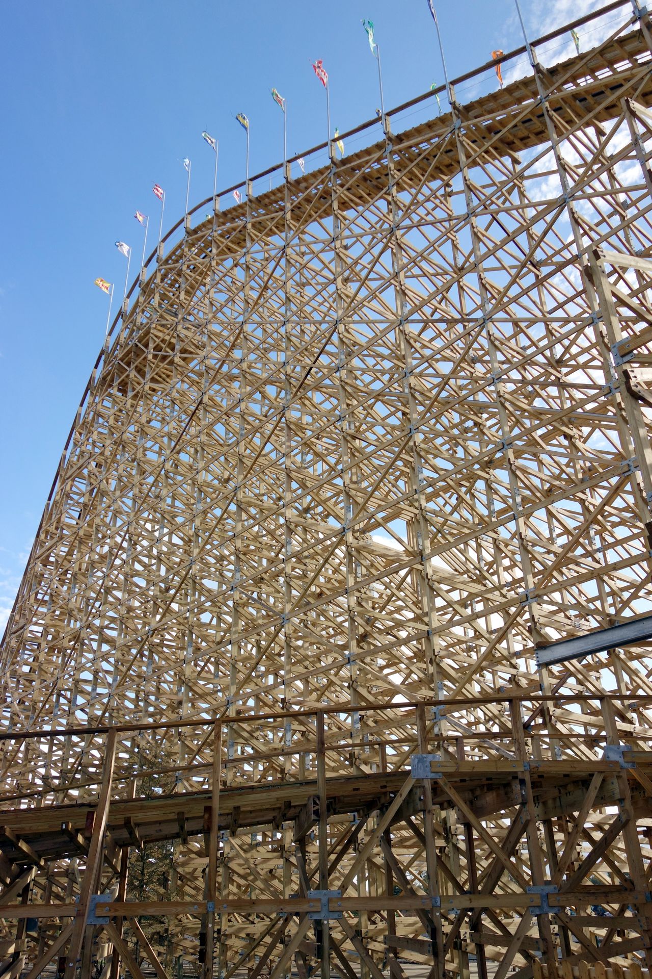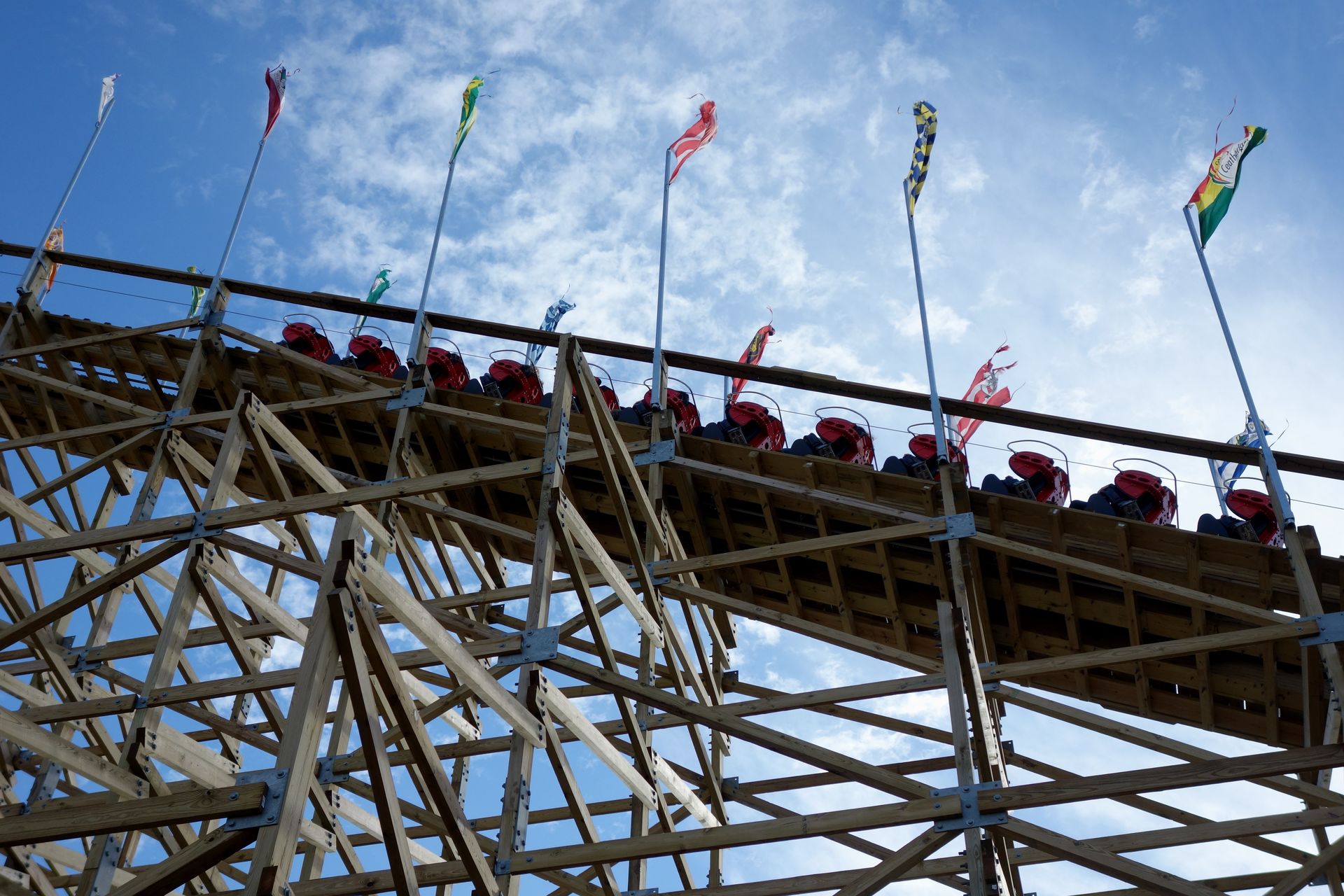 So ein bisschen Höhenangst habe ich ja schon. Die war auf der Treppe nach oben aber tatsächlich größer als direkt vor dem Abgrund stehend. Denn dort ist man ja an dem Stahlseil gesichert. Einzig die Tatsache, dass das Gurtzeug offenbar nicht ganz korrekt saß, verunsicherte mich kurz. Ich ging eigentlich davon aus, mich mehr oder weniger in den Gurt hineinsetzen zu können. Das funktionierte aber nur bedingt, sodass ich letztlich doch eher an meinen Händen hing. Ansonsten ist so eine Zipline aber nicht unbedingt sehr aufregend. Man kann halt ein bisschen abhängen und sich den Fahrtwind um die Nase wehen lassen. Man muss sich nur trauen, abzuspringen (was bei weitem nicht alle schaffen). Auf der anderen Seite angekommen wird man ein wenig ruppig abgebremst, ausgeklinkt und darf den Weg zurück per Pedes antreten, um dort die Sachen wieder abzulegen. Eigentlich wollte ich dabei noch kurz das quasi angrenzende Dinosaurs Alive! durchschreiten, welches hier im Gegensatz zu den Cedar Fair Parks wenige Monate zuvor bereits im Eintrittspreis enthalten ist. Beim Blick auf die Uhr verzichtete ich aber darauf, denn die Zipline hatte mich fast eine ganze Stunde gekostet. Also begab ich mich schnellstmöglich zum Woodie und zu Nicolas, um bestenfalls noch eine letzte Fahrt auf meiner 400 zu machen. Ich war aber leider nicht der einzige, der noch eine Abschlussfahrt wollte, sodass die Schlange nun wieder deutlich länger war. Das wäre bis zur Abfahrt des Buses zu knapp geworden.