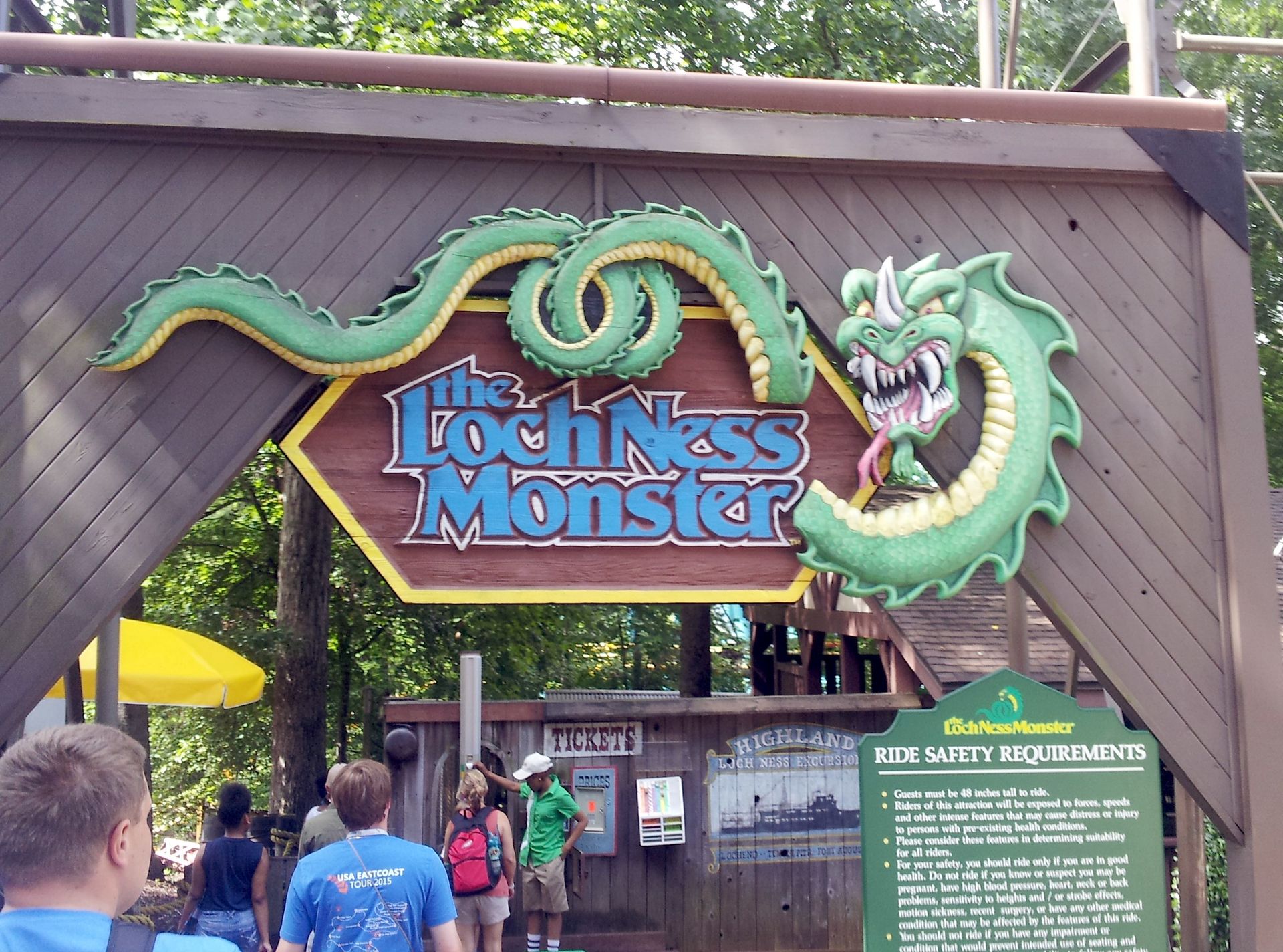 Das Monster von Loch Ness zog 1978 als höchste und schnellste Achterbahn der Welt in die Busch Gardens ein. Der 990 Meter lange Arrow-Coaster war und ist seit 2003 wieder die einzige Bahn der Welt mit Interlocking Loops. Und die fand ich optisch irgendwie schon immer sehr lecker. Bei zwei Zügen war die Station nahezu leer, und so konnten wir recht bald Platz nehmen.
