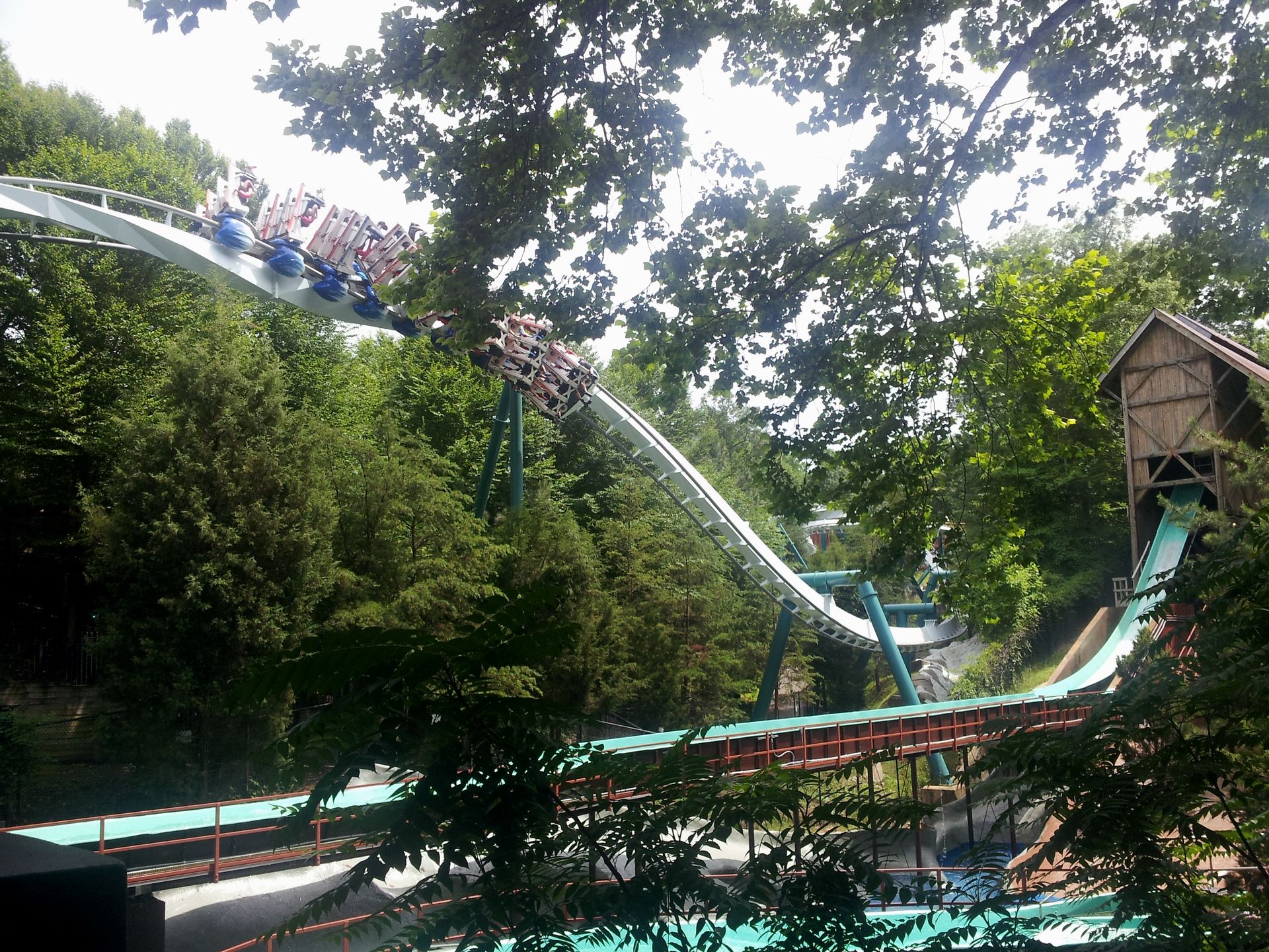 Ein kurzer Drop führt parallel zur Wildwasserbahn in eine Zero-G Roll.