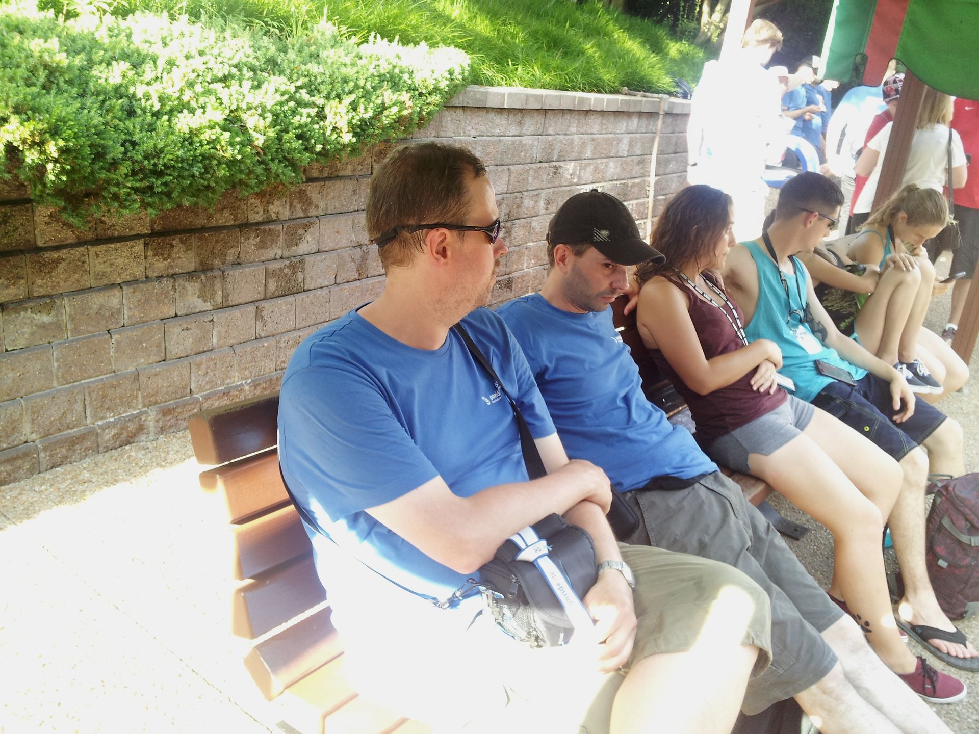 Doch auch als die Queue endlich für uns geöffnet wurde, füllten wir die beiden bereitgestellten Züge nicht sofort auf. Denn es war - wie man auf den Bildern sehen konnte - unser T-Shirt-Day. Und weil er die Shirts entworfen hatte, wurde Vampics³ die Ehre der allerersten Fahrt dieser ERT zuteil. Ganz alleine in diesem riesigen Zug. Muss geil gewesen sein. Im zweiten Zug verteilten sich die drei Organisatoren auf die drei Reihen. Erst danach durfte auch der Rest von uns zusteigen.