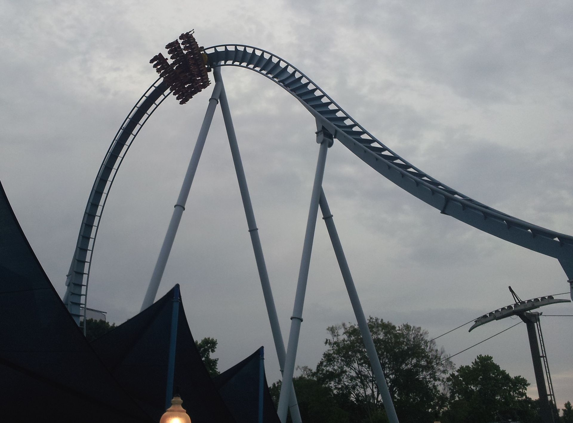 Bei zwei Zügen musste nämlich niemand Angst um seinen Platz haben. Ganz im Gegenteil, es war Sitzenbleiben angesagt. Wir fuhren immer zwei Runden direkt hintereinander, dann wurden Plätze getauscht. Muss von Außen bestimmt super ausgesehen haben, wenn der ganze Zug einheitlich bekleidet in die Tiefe rauscht. Die Stimmung dabei war wirklich erstklassig. Richtig geil. Besonders als es schließlich dunkel wurde. Rundherum war alles still. Noch dazu zogen um den Park herum Gewitter auf. Aus 60 Metern die Wolken am Horizont aufleuchten zu sehen, hat schon was. Und das alles eine ganze Stunde lang.