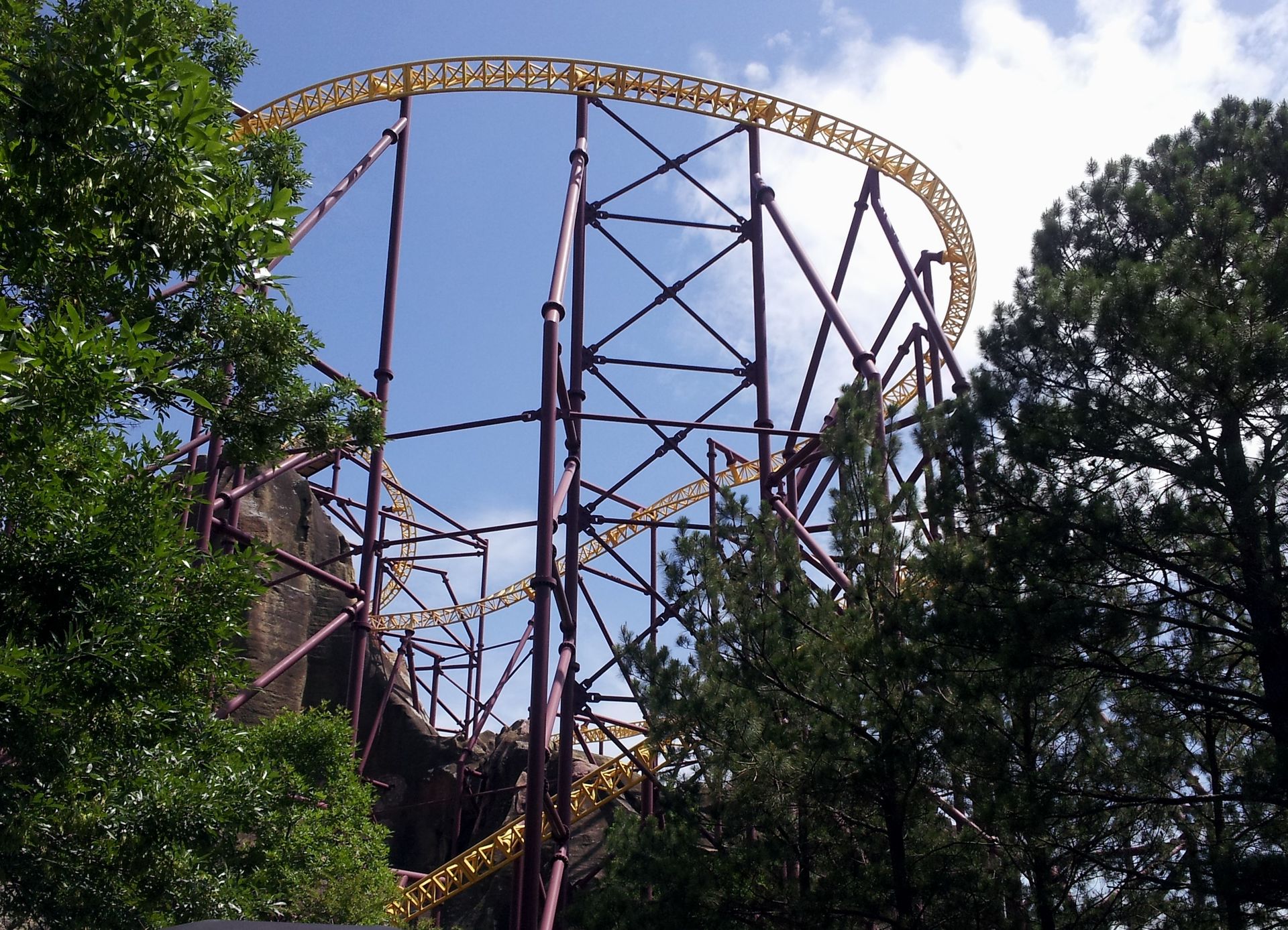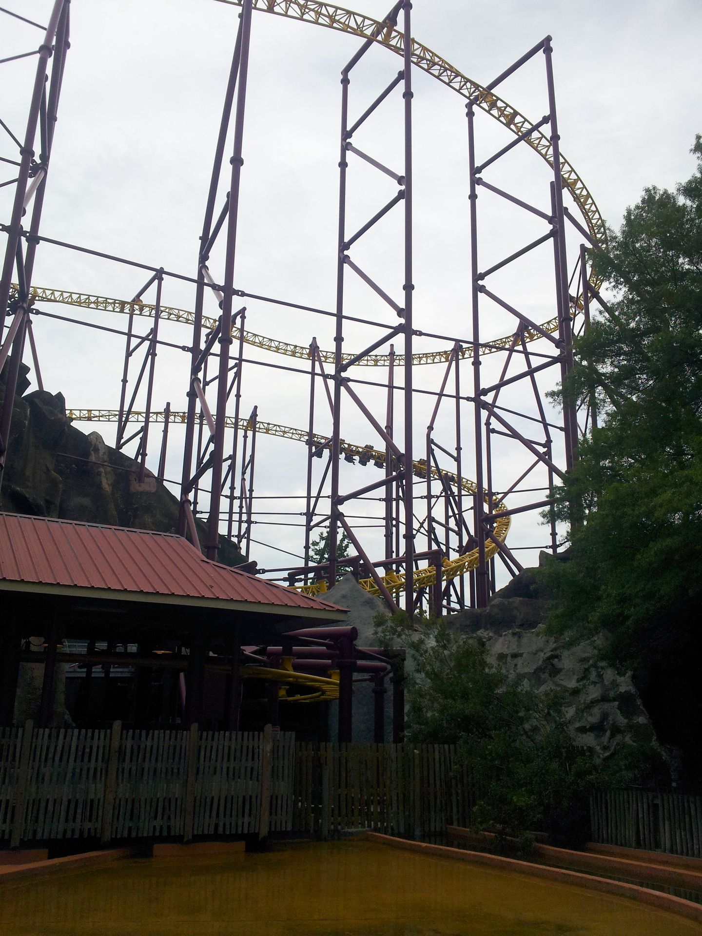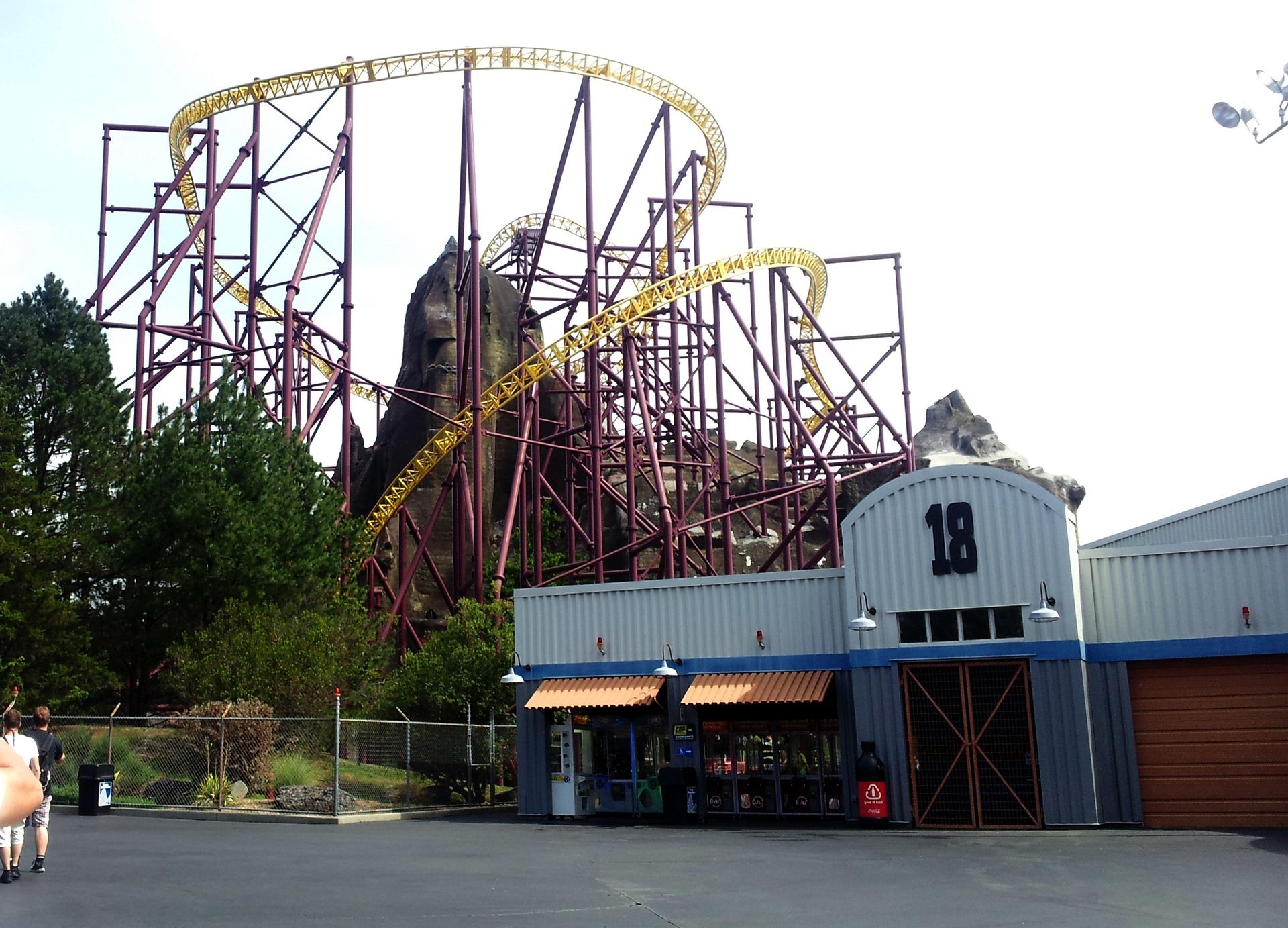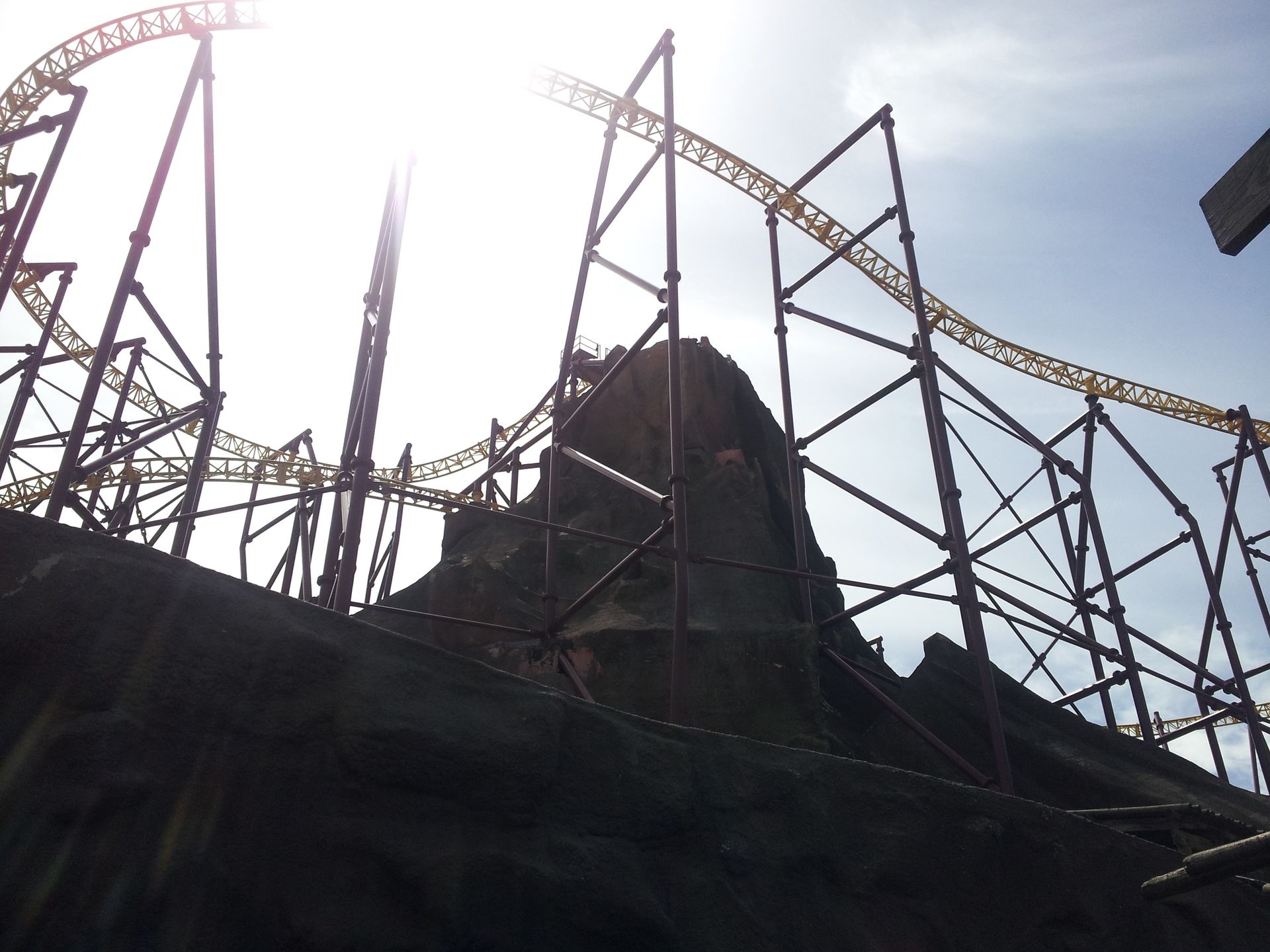Der steht dort allerdings auch schon seit 1979 und beherbergte ursprünglich drei etwas ruhigere Attraktionen. Nämlich eine Bootsthemenfahrt, einen Minen-Darkride und einen Flatride. Aufgrund der nachlassenden Beliebtheit wurden diese aber 1995 endgültig geschlossen und der Berg stand als leere Hülle dort. Bis dann eben Volcano in und um den Berg konstruiert wurde. So führt eine im Freien liegende Kurve den Zug aus der Station in den ersten Launch quer durch den Vulkan. Besonders die vorne sitzenden Passagiere haben dabei zunächst genügend Zeit, sich in der gewaltigen Stahlkonstruktion umzusehen. Denn der Berg besteht natürlich nur aus der Außenhülle, die Innen von diversen Verstrebungen getragen und zusammengehalten wird. Die Achterbahn wurde dort einfach nur reingestellt, ohne dies auch nur ansatzweise verstecken zu wollen. Schließlich beschleunigt der Zug dann durchaus kräftig und schießt auf der anderen Seite des Berges wieder ins Freie. Unter einem hübschen Wellblechdach dauert der Launch noch ein Stück weit an, dann durchfährt man weiterhin am Boden eine weite Kurve, bis man wieder in Richtung des Vulkans in den zweiten Launchabschnitt einfährt. Dieser bringt den Zug schließlich auf die benötigte Geschwindigkeit, um wenig später mitten im Berg senkrecht emporzusteigen und mit dem weltweit einmaligen Roll Out kopfüber aus dem Vulkankrater zu schießen. Das ist tatsächlich richtig cool gemacht, auch wenn der Flammenwerfer da oben an diesem Tag leider nicht in Betrieb war.