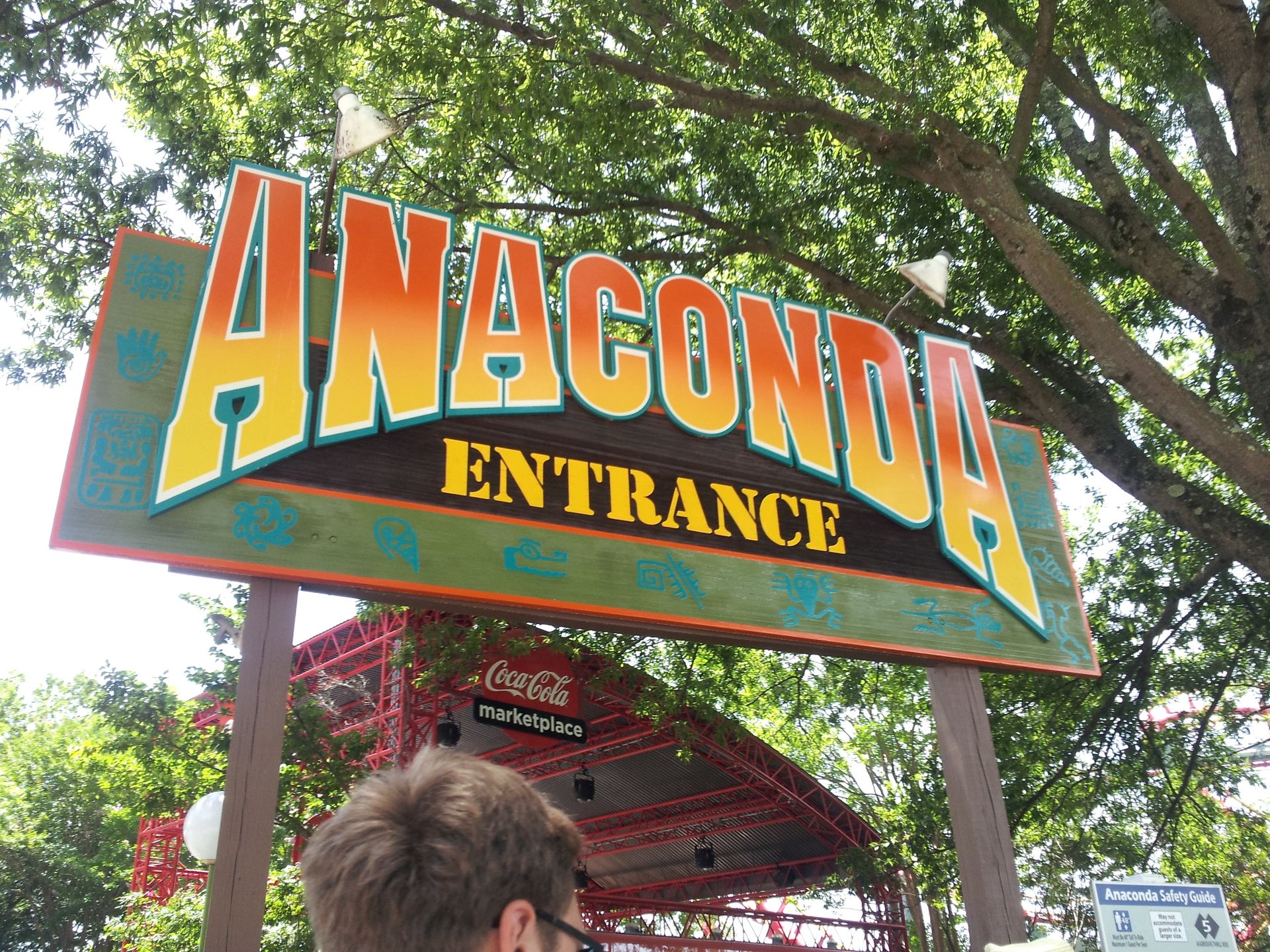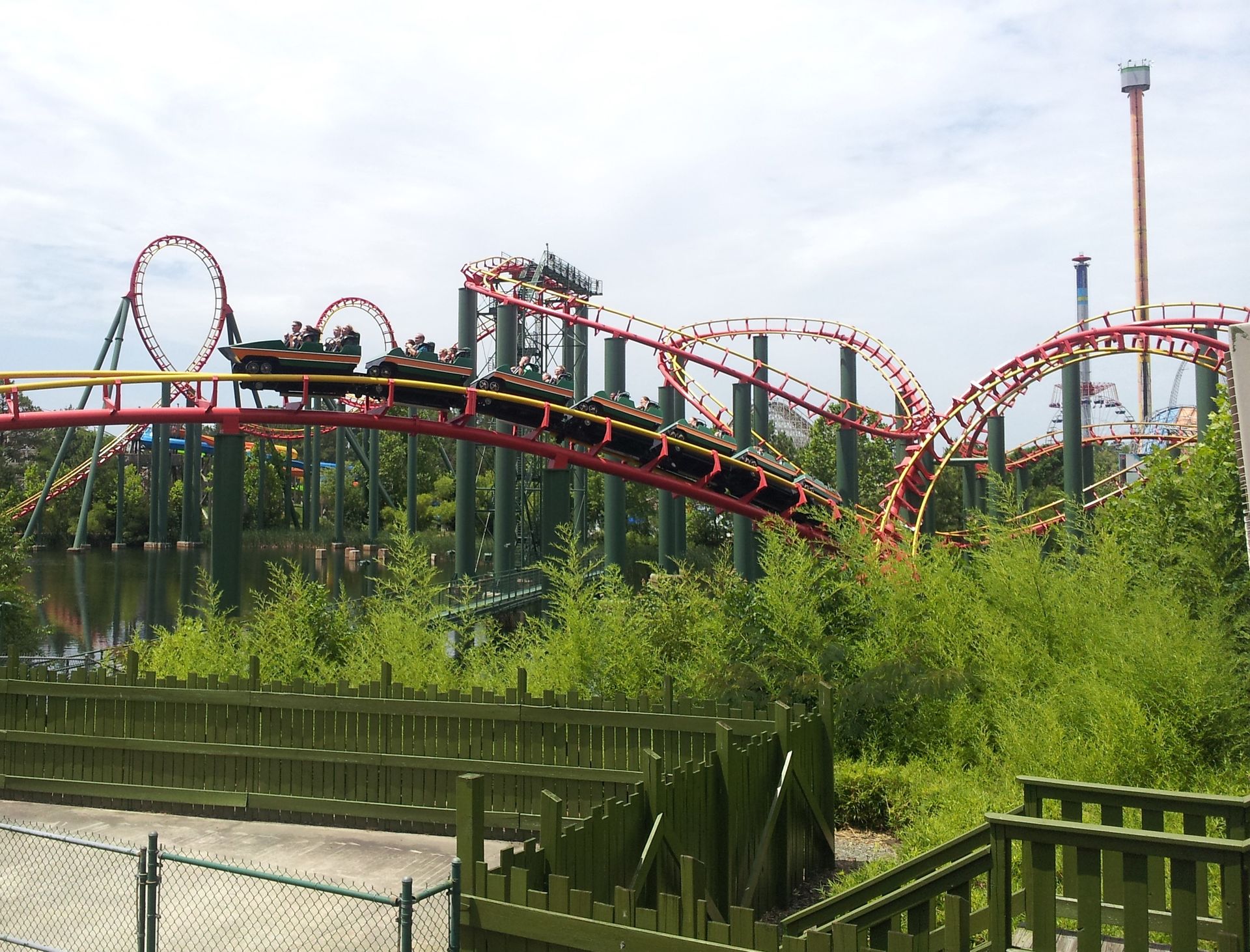 Und nach dem oben zu sehenden Hügelchen taucht man noch kurz unter dem Lifthill hindurch, ehe man auch schon in der Schlussbremse steht. Anaconda wurde im Jahr 1991 eröffnet, also vier Jahre nach Vortex in Kings Island. Die hiesige Auslieferung ist aber kleiner, deutlich kürzer und verfügt über zwei Inversionen weniger. Dafür sind die Fahreigenschaften aber auch erheblich besser. Zwar auch nicht unbedingt butterweich, aber Anaconda fand ich überraschend gut fahrbar. Und die Lage über dem Tümpel (See ist ja fast schon übertrieben) gefällt mir auch.