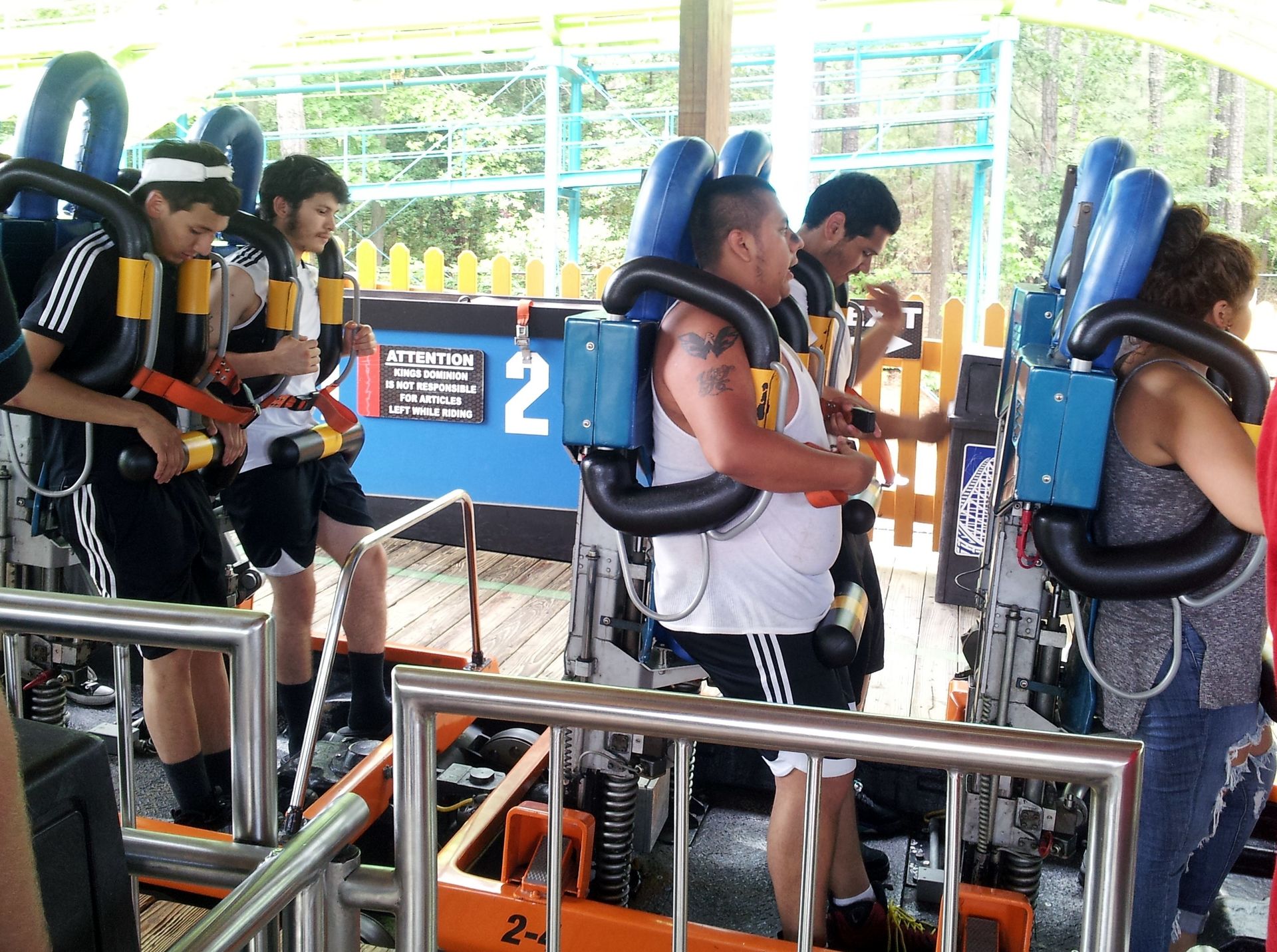 Zunächst muss man diesen Beinbügel vorziehen und sich dahinter stellen, danach werden die Arme durch die Schulterbügel geführt, die schließlich mit einem Gurt zusammengehalten werden. Gleichzeitig muss man natürlich wie auch bei anderen Stand-Up Coastern die Höhe des "Sitzes" einstellen und bis zur Verriegelung halten. Noch dazu wirkt der gesamte Aufbau ziemlich schlank und wackelt auch ein wenig. Aber letztlich muss man sagen, es hält. Und ich finde die Bügel während der Fahrt sogar bequemer als die von