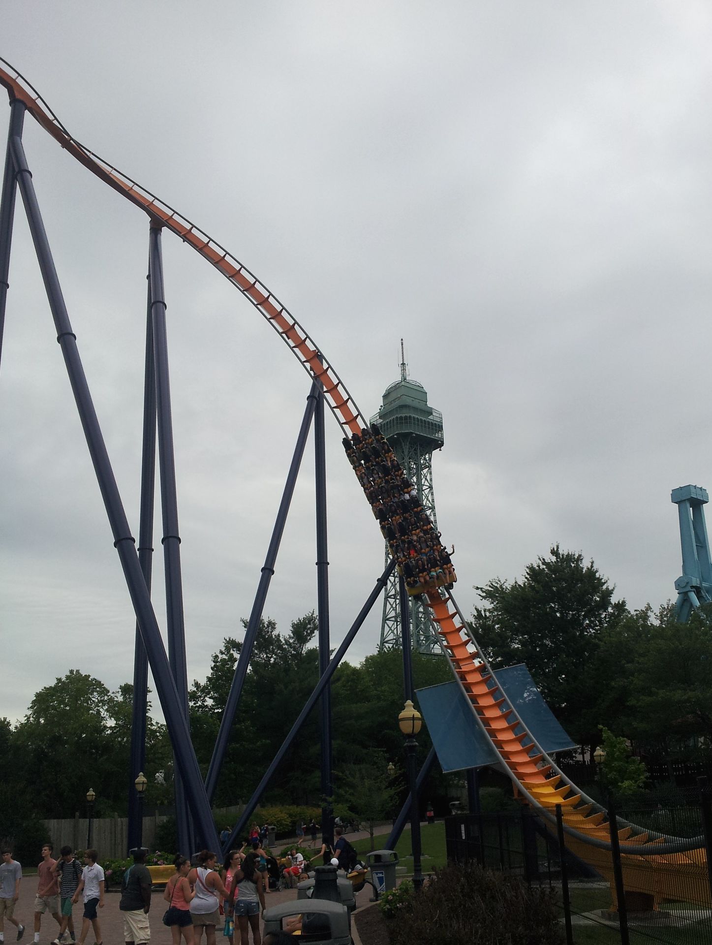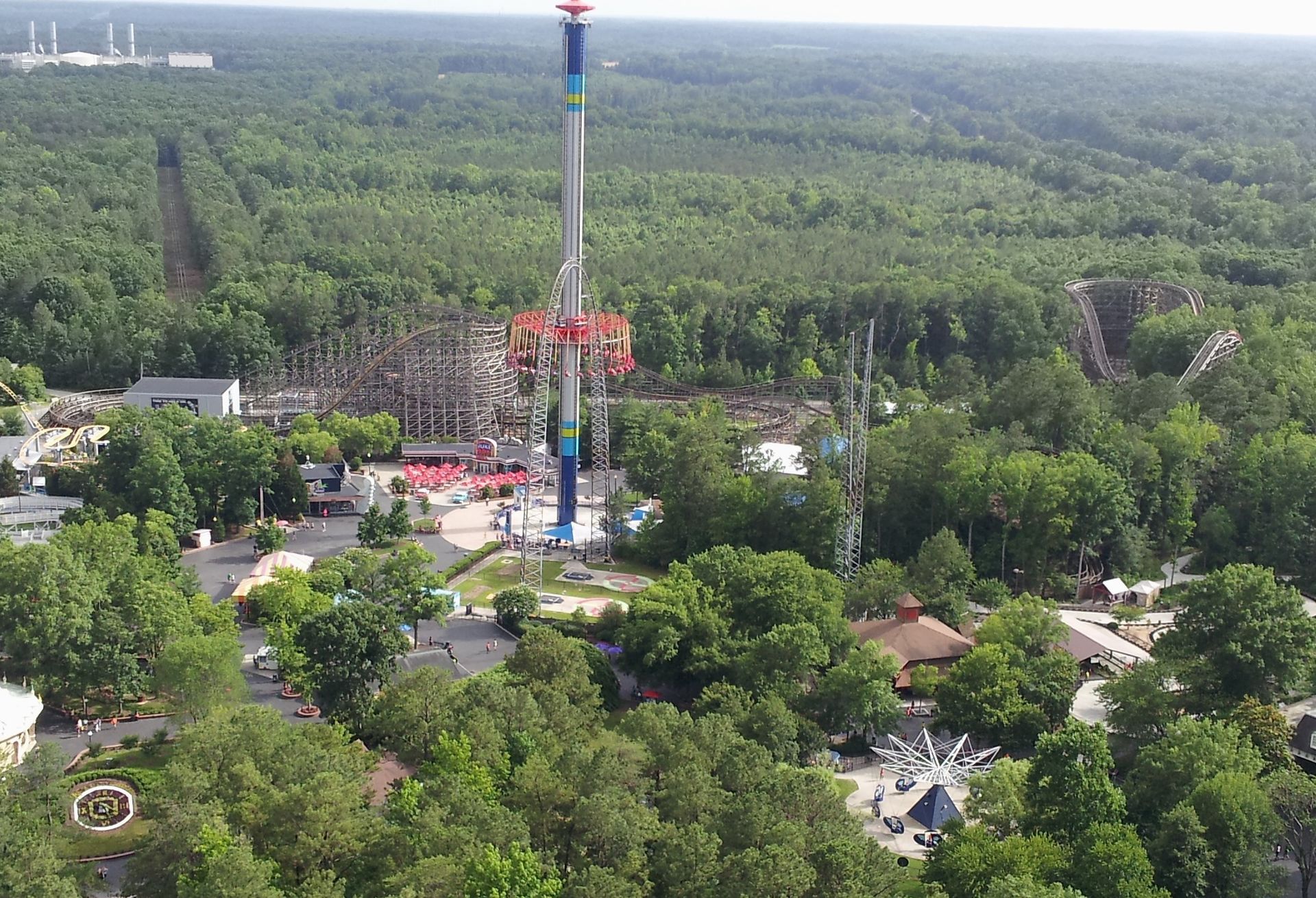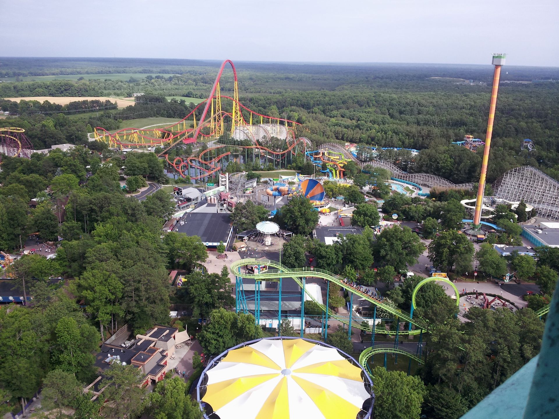 Nachdem die Counts also alle abgehakt waren, war es nun an der Zeit für Wiederholungsfahrten und mehr. Die meisten testeten natürlich auch den Gyro Drop Tower. Der ist zwar etwa drei Meter kleiner als der Rekordhalter in Kings Island, die Bremsstrecke beginnt aber später, sodass der freie Fall dennoch drei Meter länger dauert. Beide Parks werben daher mit dem höchsten Gyro Drop Tower der Welt. In Kings Island auf die Turmhöhe, in Kings Dominion auf die tatsächliche Fallhöhe bezogen. Mich interessierte das aber nur am Rande, ich habe nämlich beide Türme ausgelassen.