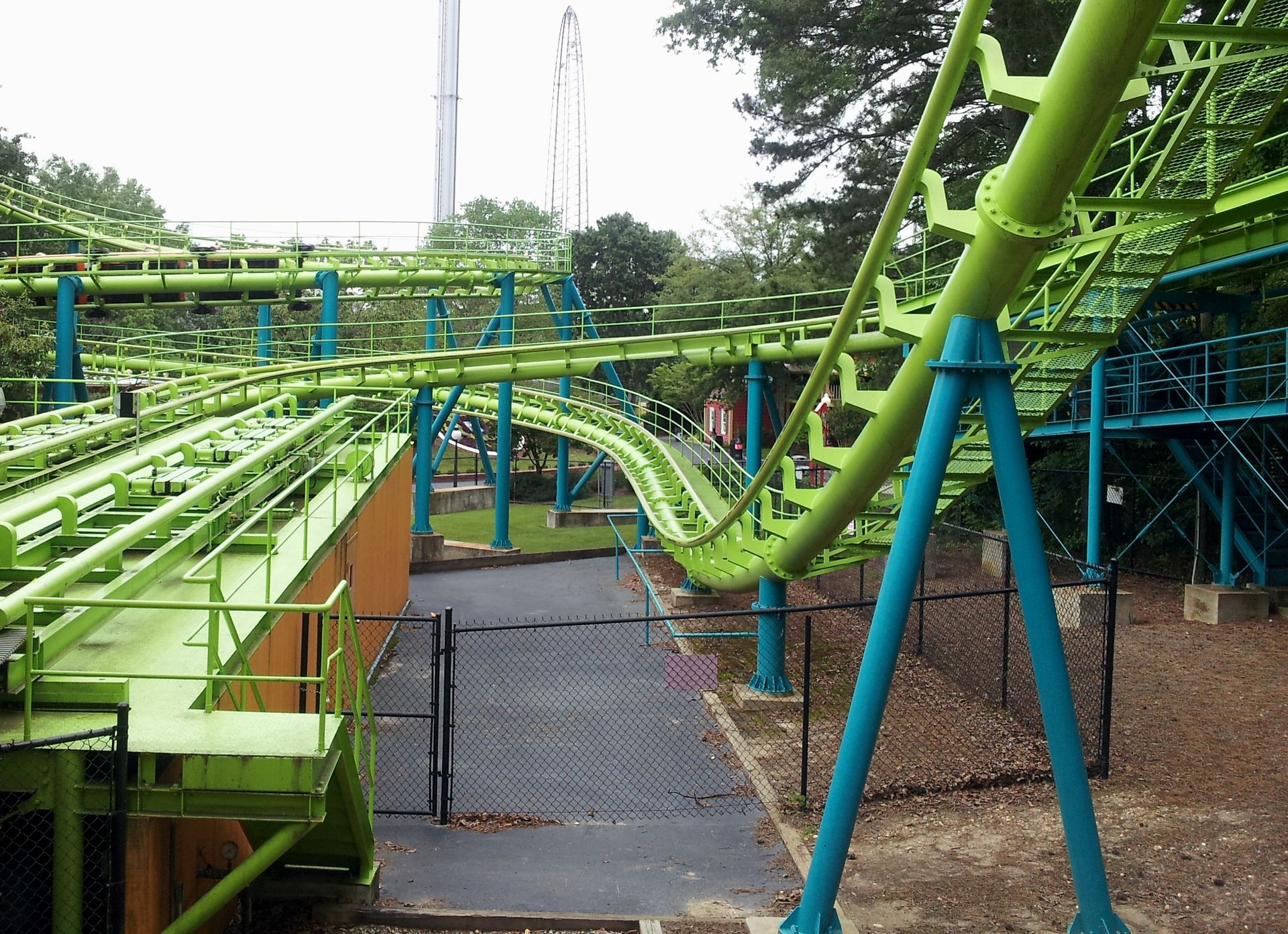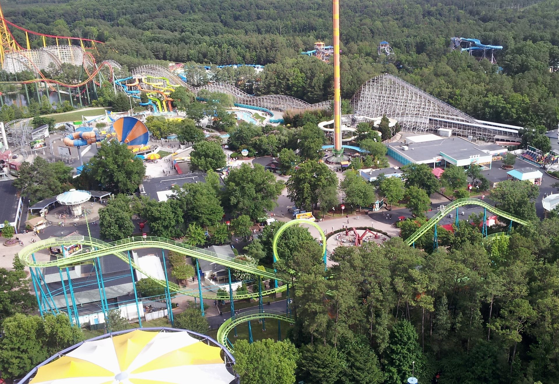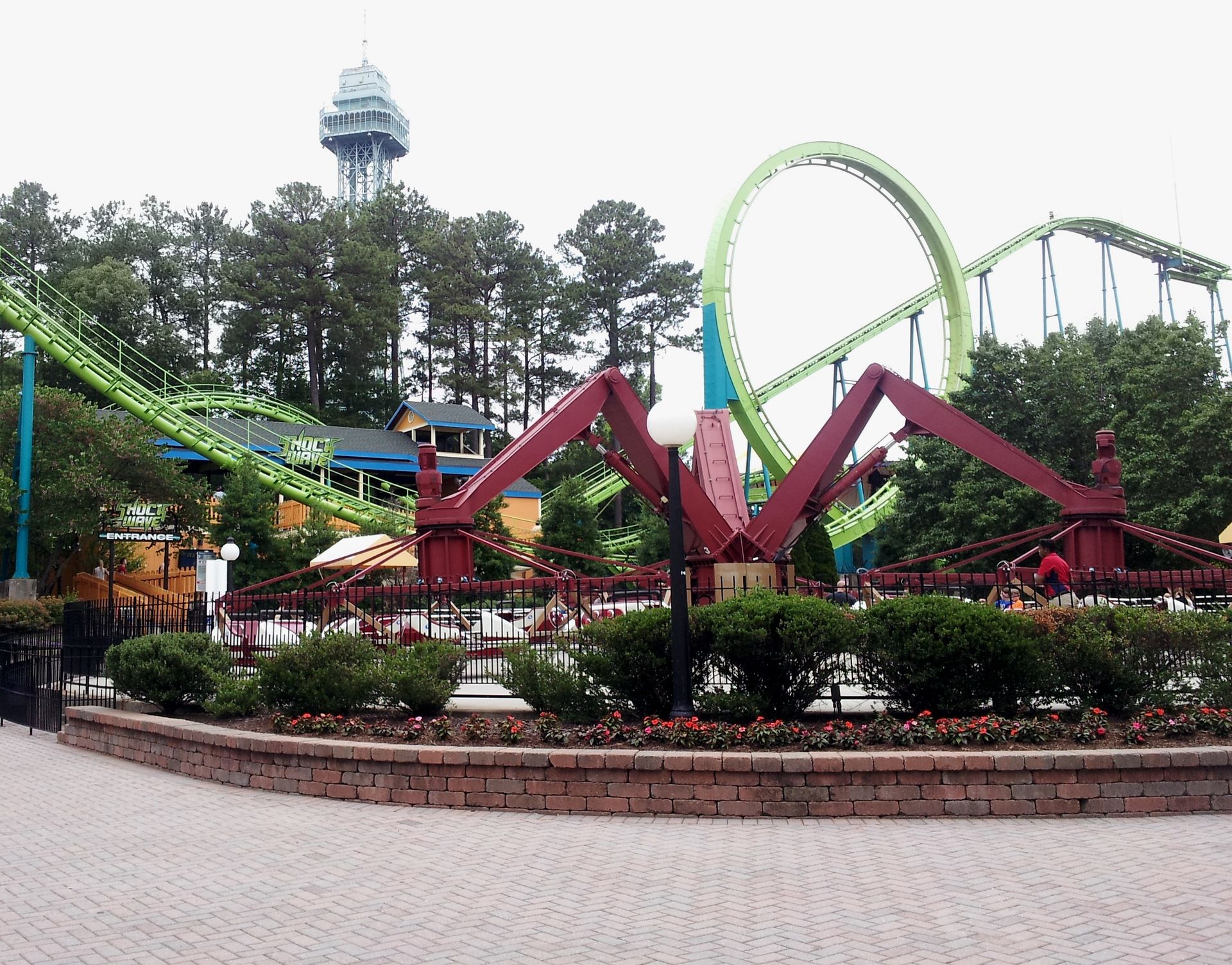 Nachdem die Counts also alle abgehakt waren, war es nun an der Zeit für Wiederholungsfahrten und mehr. Die meisten testeten natürlich auch den Gyro Drop Tower. Der ist zwar etwa drei Meter kleiner als der Rekordhalter in Kings Island, die Bremsstrecke beginnt aber später, sodass der freie Fall dennoch drei Meter länger dauert. Beide Parks werben daher mit dem höchsten Gyro Drop Tower der Welt. In Kings Island auf die Turmhöhe, in Kings Dominion auf die tatsächliche Fallhöhe bezogen. Mich interessierte das aber nur am Rande, ich habe nämlich beide Türme ausgelassen.
