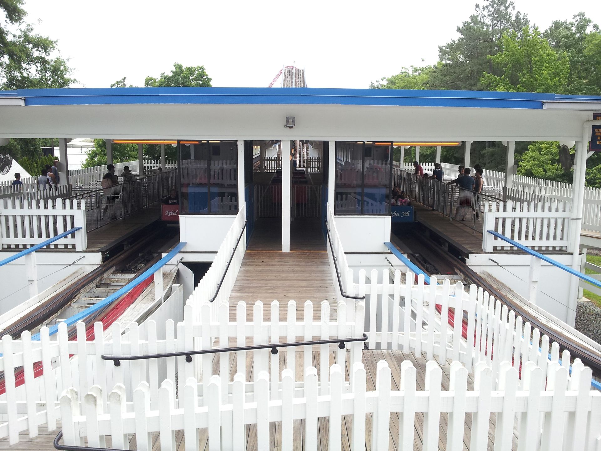 Anders als in Kings Island befindet sich der Einstieg an den Seiten. Der Wartebereich teilt sich daher recht bald auf und man muss sich für eine Seite entscheiden.
