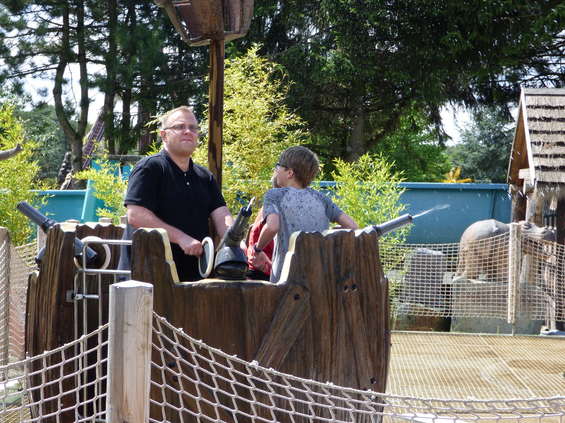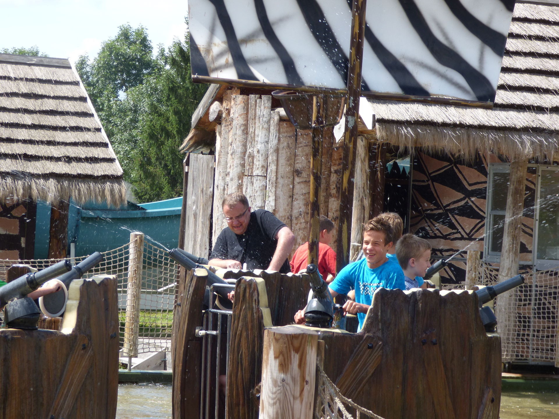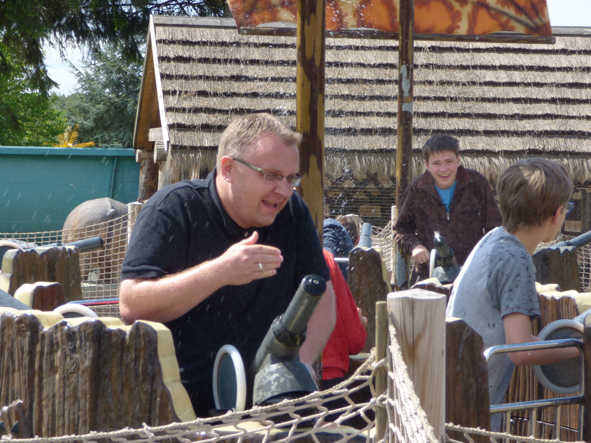 Schön ist auch die Tatsache, dass man während der Fahrt die Zuschauer auf der Terasser vor der Attraktion auch gnadenlos erwischen kann. Und auch die Warteschlange liegt in Reichweite der Kanonen. Eine geniale Spaßmaschine!