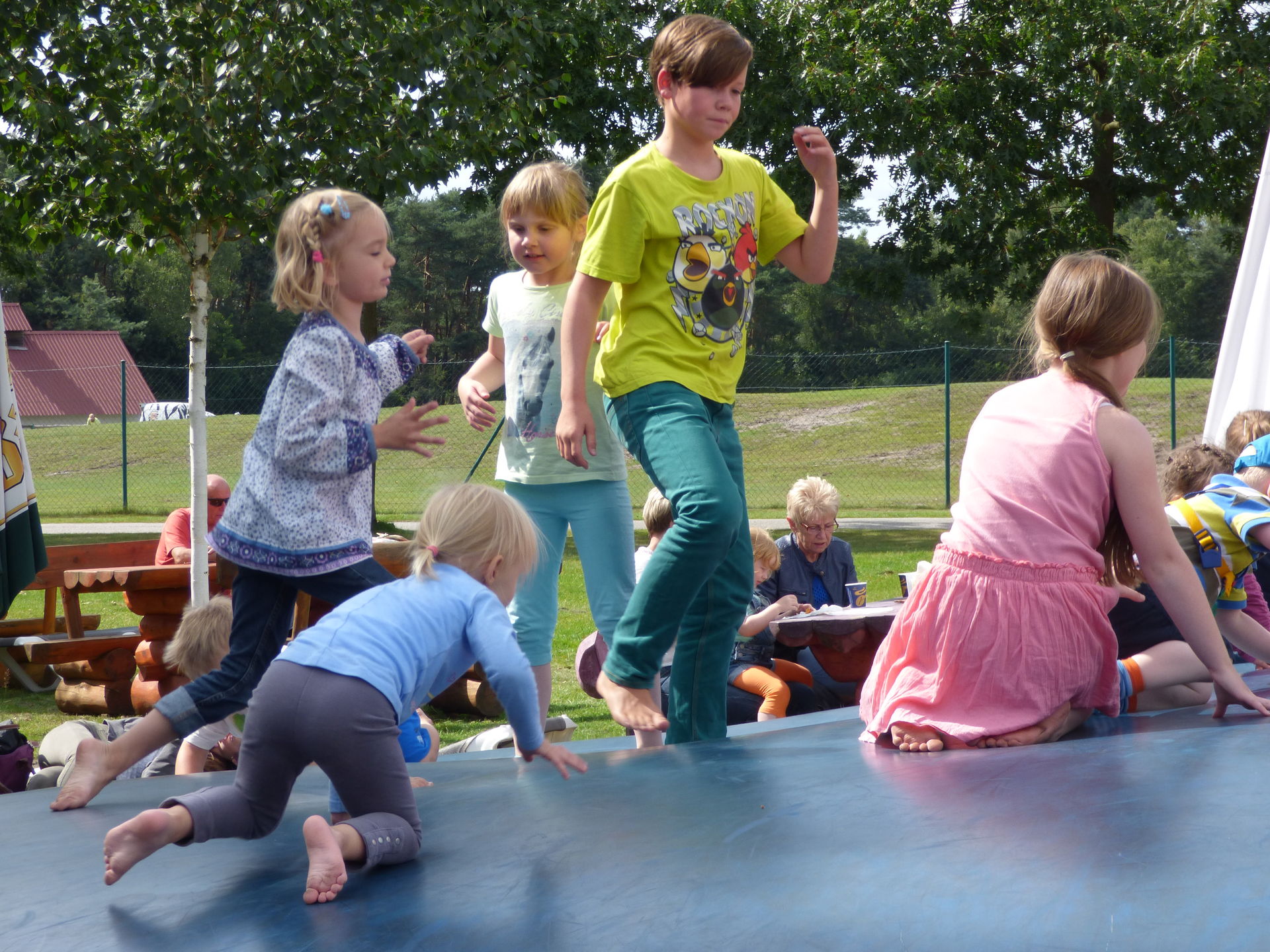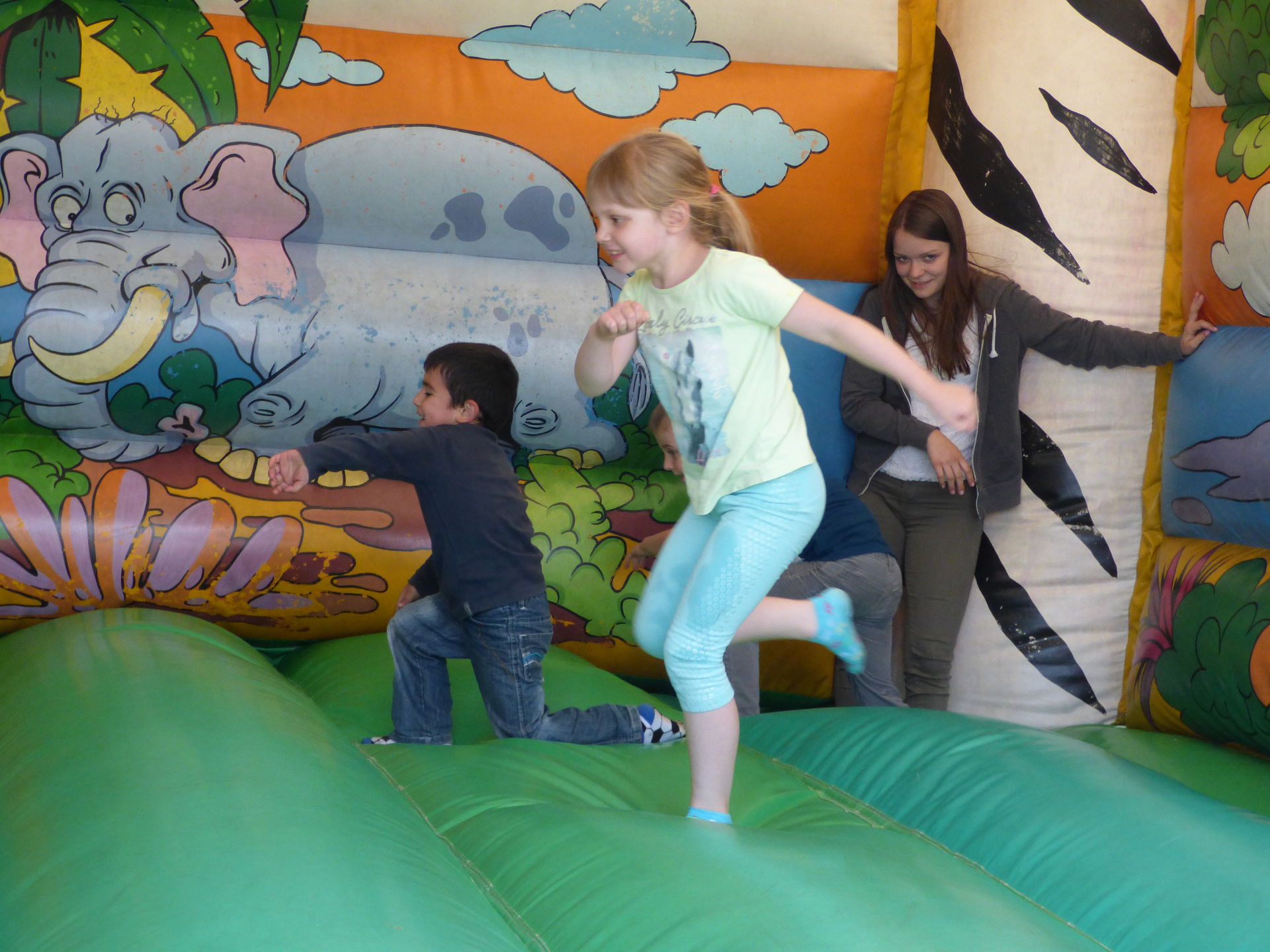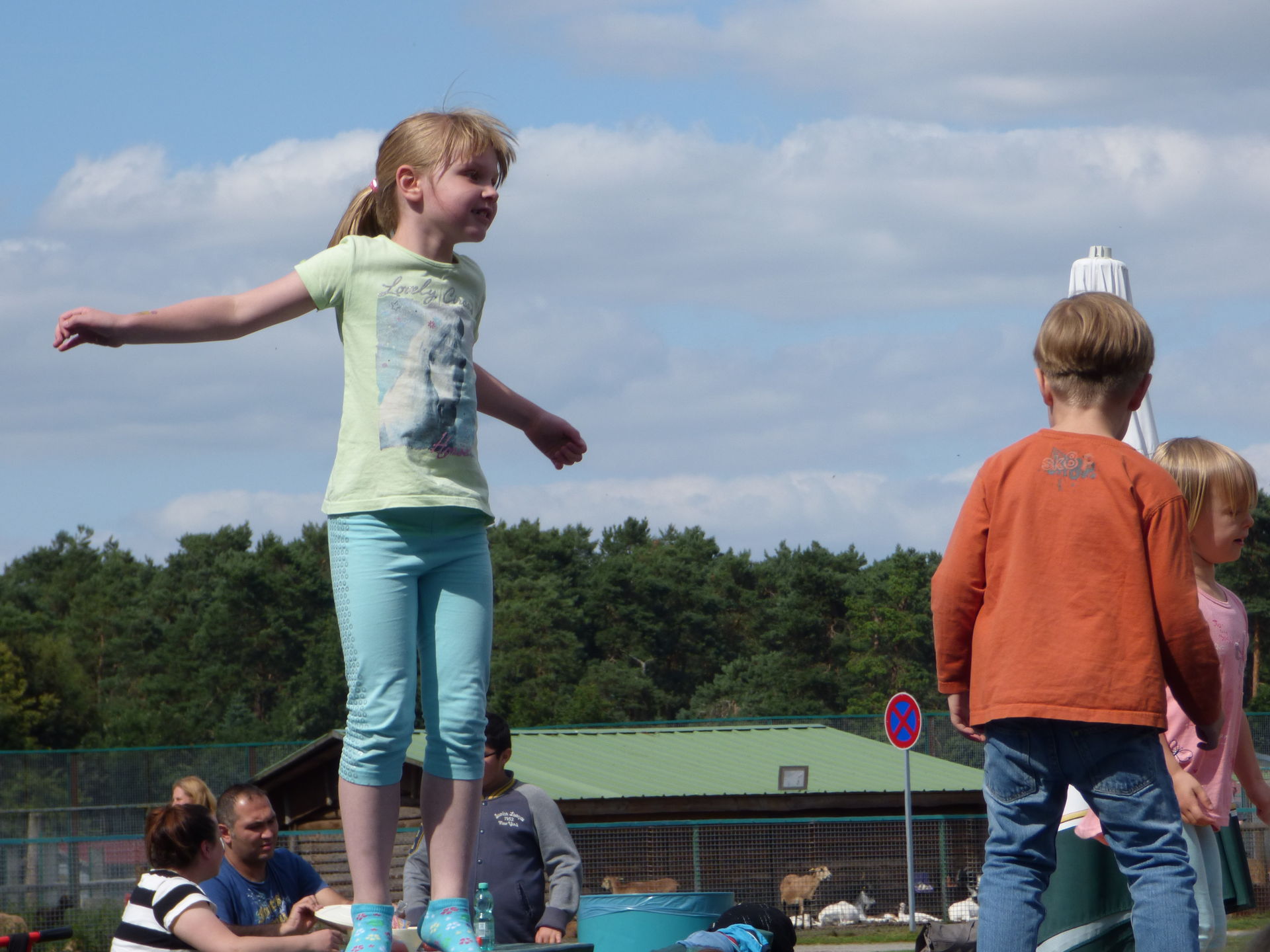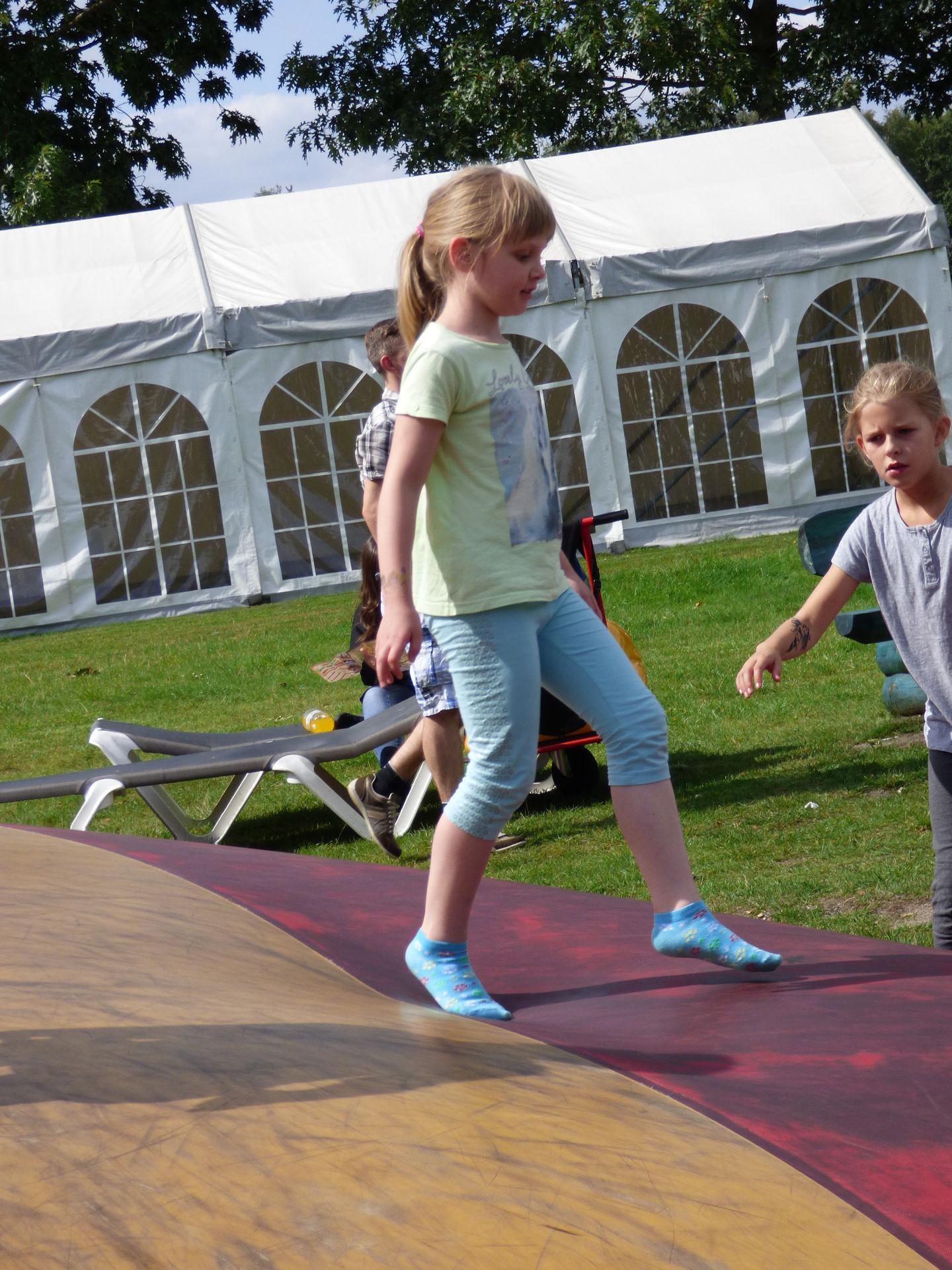 Nach dieser Wasserschlacht mussten wir dann erstmal in der Sonne trocknen und nutzten die Zeit für eine kleine Pause. Mia hatte natürlich direkt wieder Hummeln im Hintern und vergnügte sich auf den Hüpfkissen nahe unserer Pausenstätte.