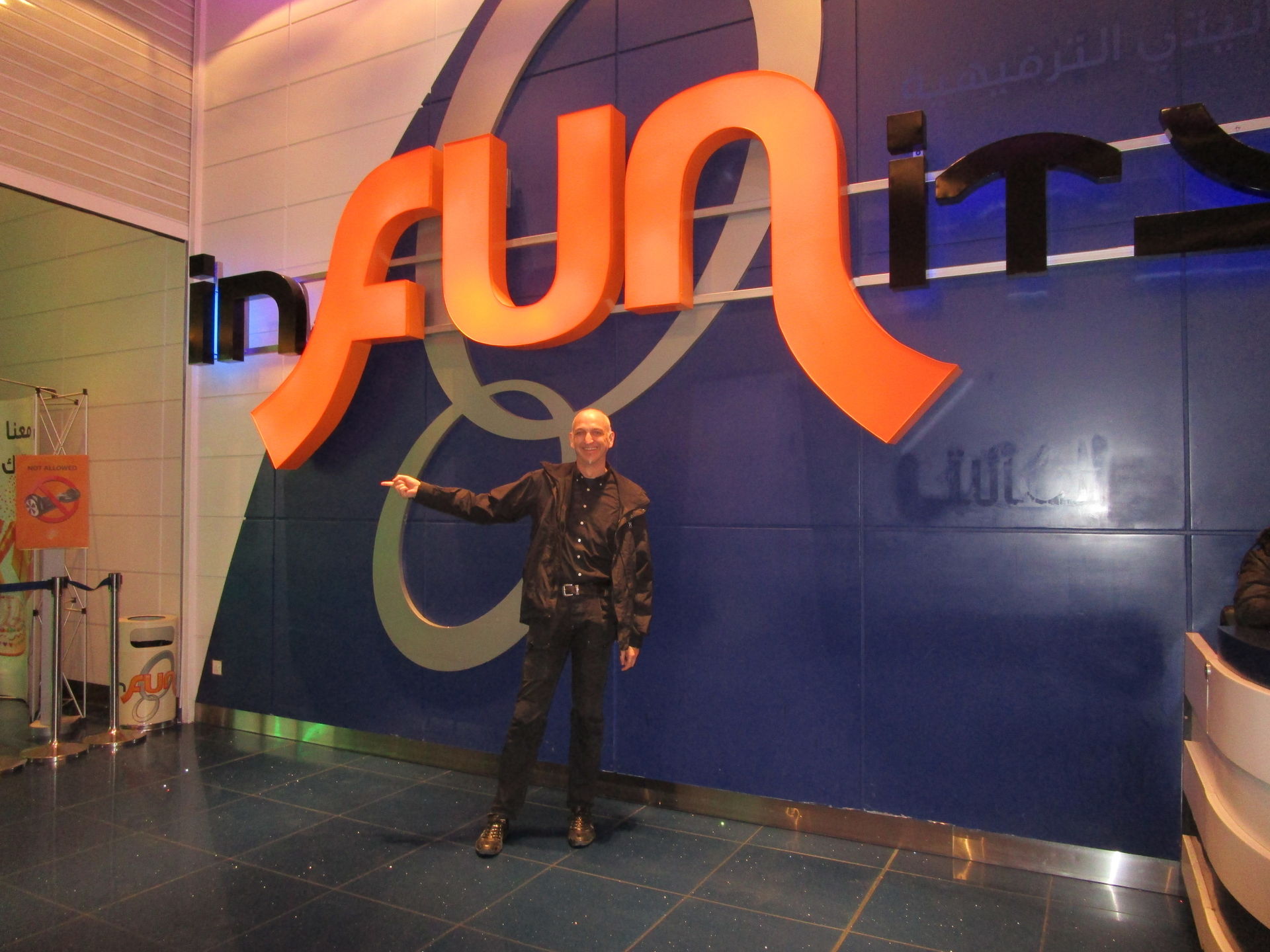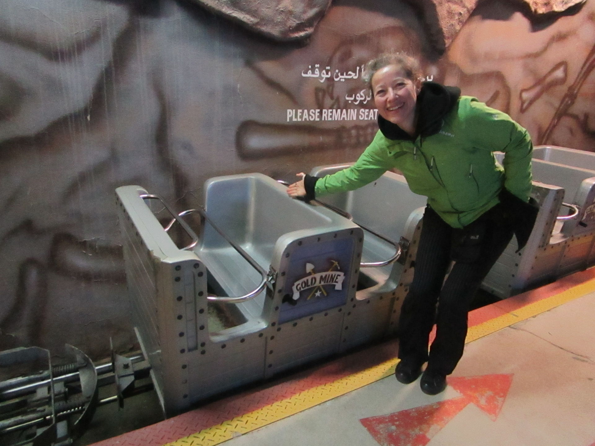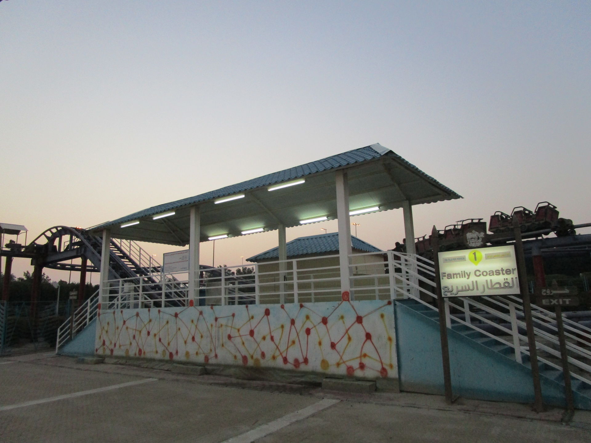 Die doppelte Schiebetür, die uns noch von unserer ersten kuwaitischen Achterbahnfahrt trennt, ist nur von innen zu öffnen und draußen steht niemand, der uns Zutritt verschaffen kann. Glücklicherweise kann der Papa seiner beiden Nachkömmlinge durch lautes Rufen jemanden im Inneren zum Entriegeln der Türen bewegen. Wir erfahren, bzw. deuten die Ansprache so, dass heute ein geschlossenes Kinderevent im Park stattfindet, dass man uns aber Zutritt gewährt. Wir nehmen das Angebot gerne an, wollen wir ja sowieso nur die Achterbahn fahren und dann wieder unseres Coasterweges gehen.