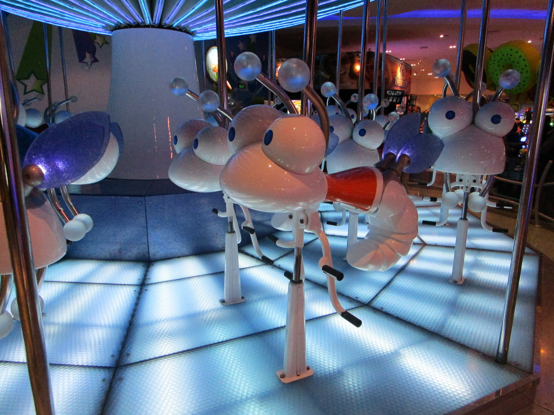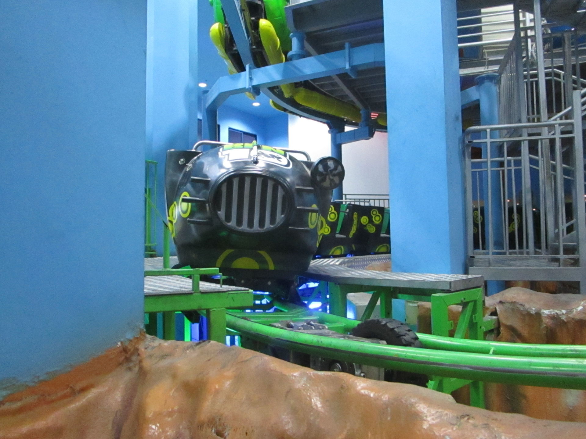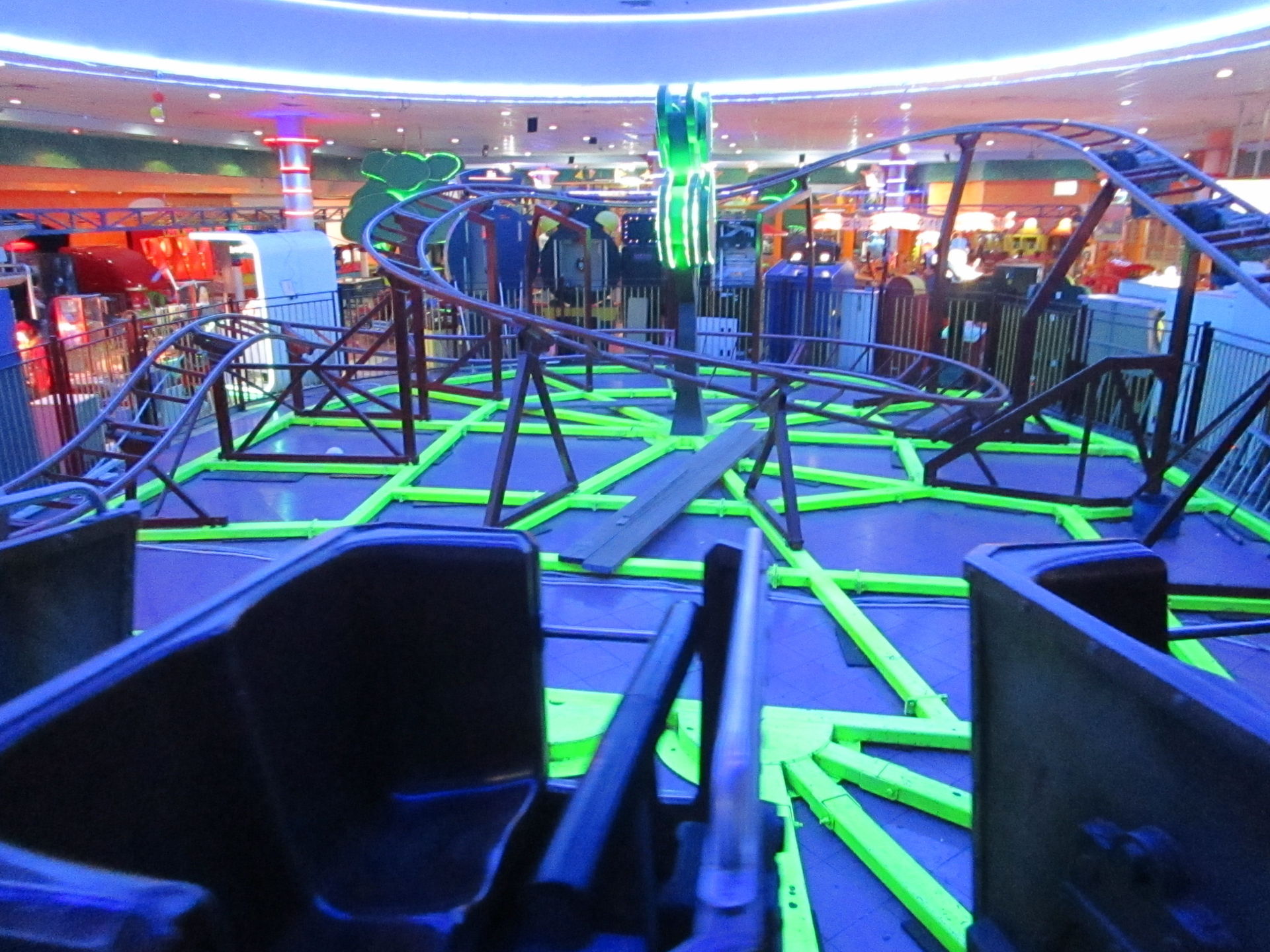 Wie in allen Parks, die wir die zwei Tage besucht haben, benötigen wir auch hier eine mit dem für die gewünschten Fahrten entsprechenden Gegenwert aufgeladene Magnetkarte. Der Family Coaster ist von seinen Fahreigenschaften unauffällig, seine Stützkonstruktion ist es eher nicht. Eine schwarzlichtverstärkte giftgrüne, spinnennetzartige Sockelkonstruktion lenkt vom eintönigen Gekreisel in der Innenhelix ab.