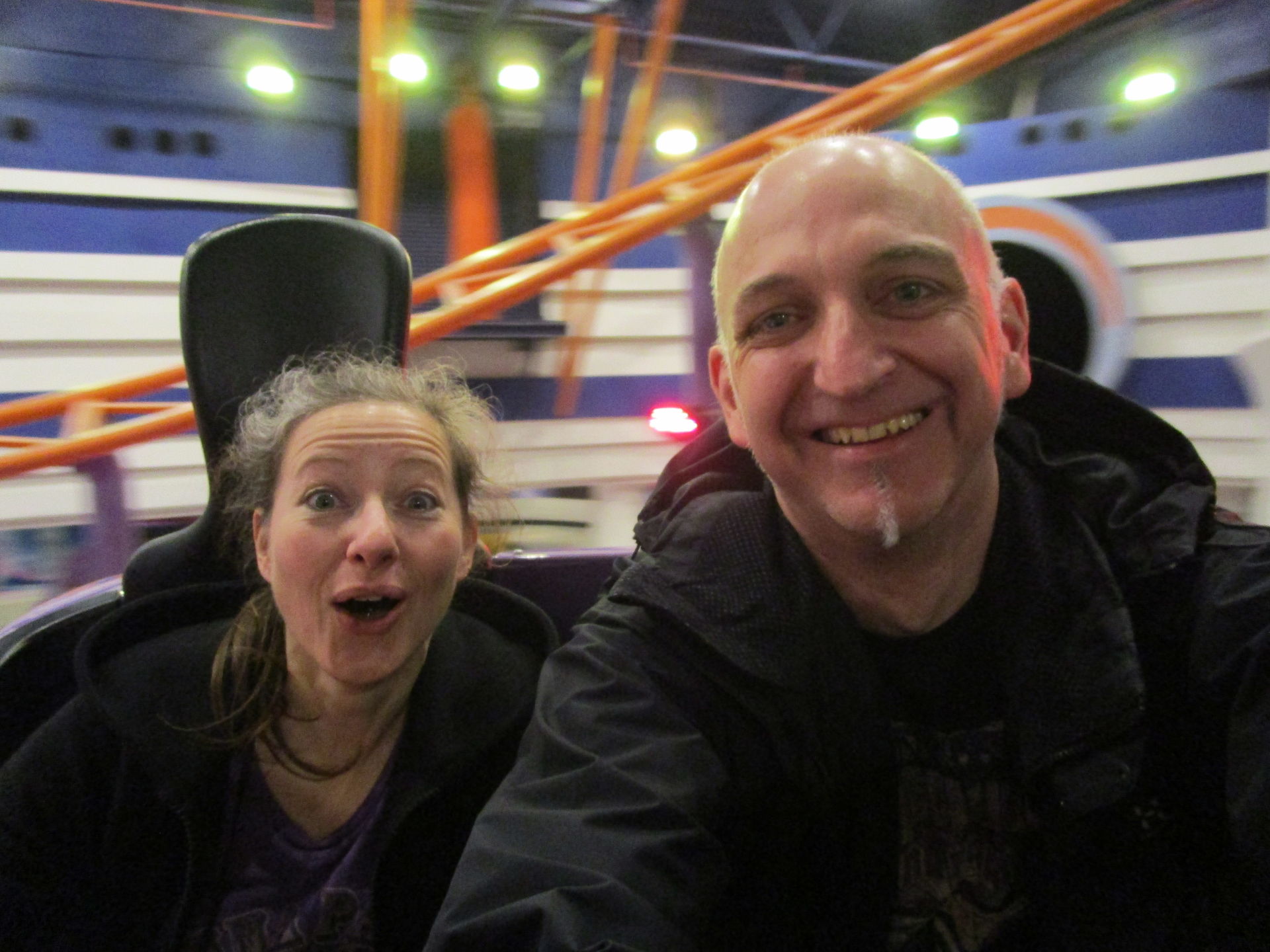 Bei der zweiten, diesmal vorwärts startenden Fahrt scheinen wir den Infunity-Lottogewinn erzielt zu haben. Die Chaise verläßt den Lifthill in einem Winkel, der uns zu einer turbulenten Fahrt mit viel Dreherei verhilft, zumindest auf dem ersten Drittel des Tracks.
