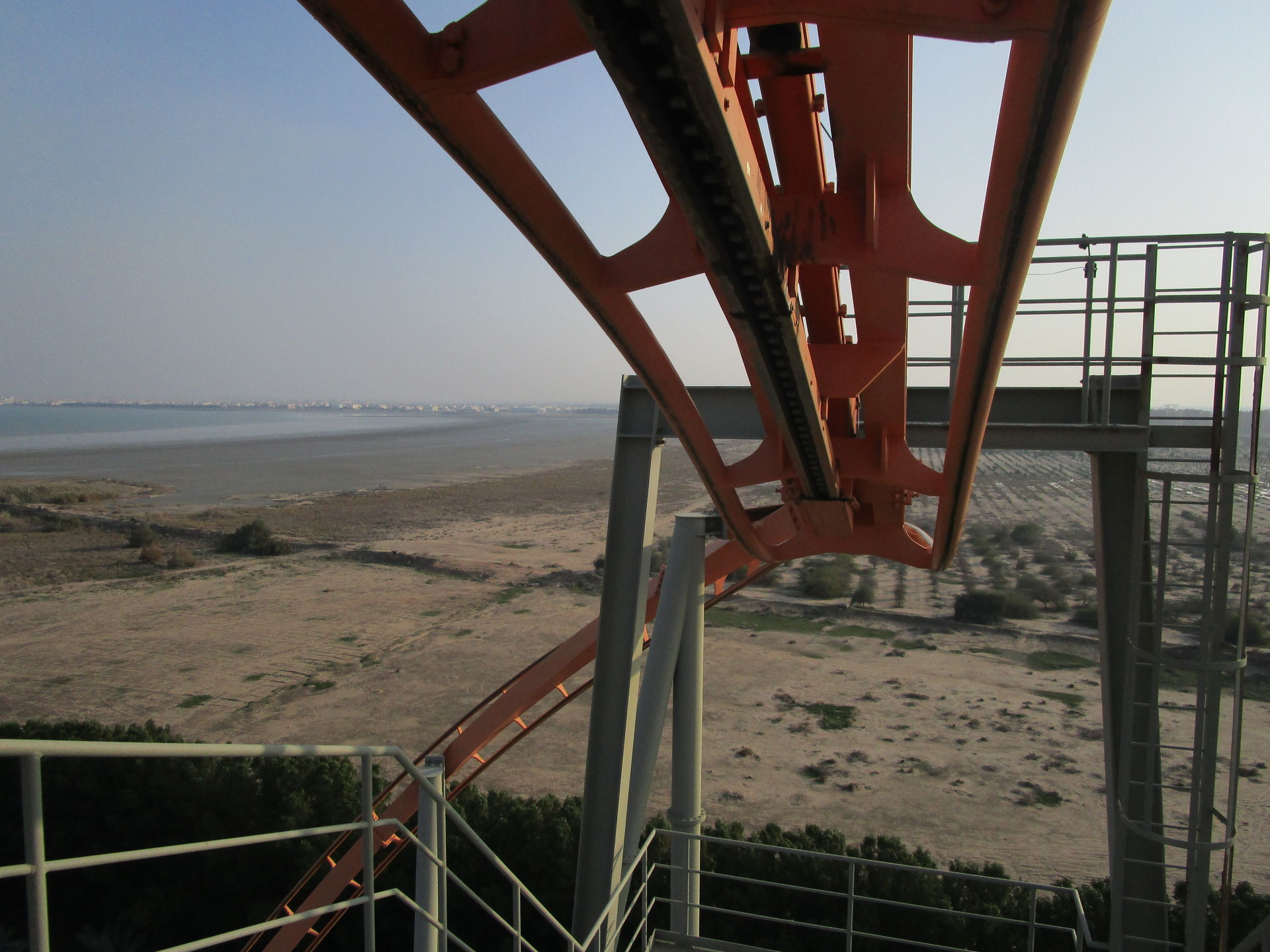 Die letzte Station des Tages ist zugleich der südlichste Park unserer Tour, was aber in einem kleinen Land wie Kuwait nichts heißt. Gerade mal 30 Minuten Fahrtzeit sind nötig, um die Heimat des einzigen außerhalb Japans aufgebauten Ultratwisters von Togo anzufahren. Obwohl der Park noch eineinhalb Stunden geöffnet haben soll, ist hier absolut tote Hose. Und das Schlimme ist, das gilt auch für den Ultra Coaster. Alles duster bei der Zwirbelmaschine! Ein Parkmitarbeiter klärt uns auf, dass die Bahn bereits seit drei Jahren still steht. Aua, das tut weh! Wir hatten uns sehr auf die Bahn gefreut, haben uns seine Brüderchen in Japan doch schon so viel Spaß gemacht!