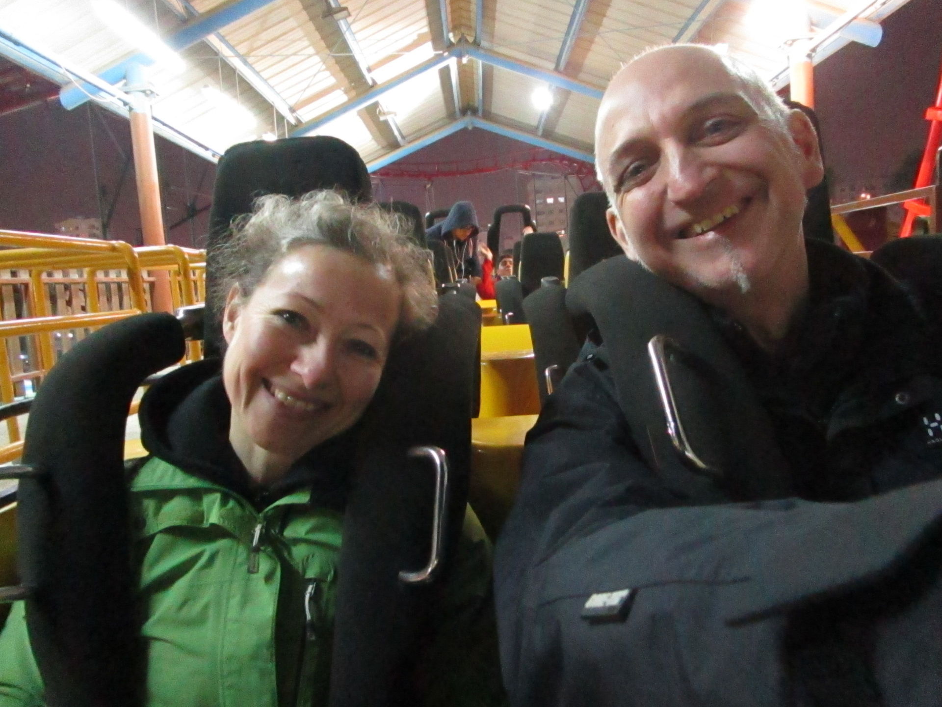 Dass dort zwei verzweifelte Achterbahnfans dem Ride Op mit ihrem Magnetkärtchen zuwinken und es einfach nicht schaffen, die Station zu erreichen, da die Jungkuwaitis sich immer wieder nach vorne schieben und jegliches Vorankommen für Menschen über 1,20m Körpergröße unmöglich machen, scheinen sie nicht zu bemerken. Erst ein massives Intervenieren des Bedienpersonals öffnet eine Gasse für uns, so dass wir drei Runden auf diesem besonders kleinen Oval mit Single