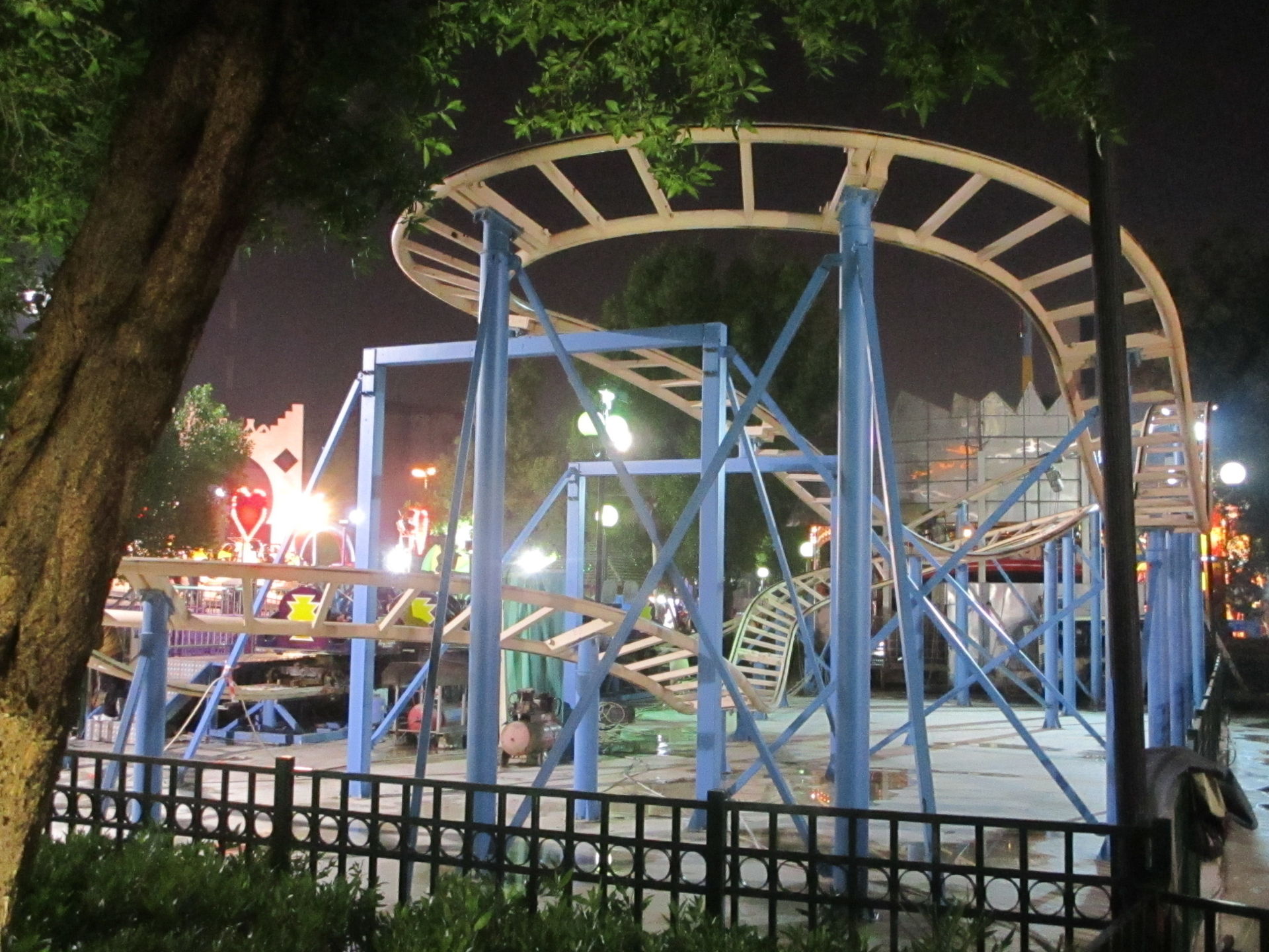 Hammer, die erste Attraktion, die wir entdecken, ist eine Achterbahn! Leider ist beim Fruit Worm Coaster, so die Modellbezeichnung des Golden Horse Ovals, alles dunkel. Ein Parkmitarbeiter klärt uns auf: „Wheel problems!“ Schade, wenn der Fruchtschädling nicht rollen kann, können wir ihn auch nicht fahren. Nicht, dass wir jetzt ein unglaubliches Fahrerlebnis erwartet hätten, aber in solch einer Flachschleifenbahn haben wir noch nicht gesessen und irgendwie steht uns doch auch das Recht der Erstabhakung zu, wenn wir die paar Kilo Stahl schon entdeckt haben, oder?