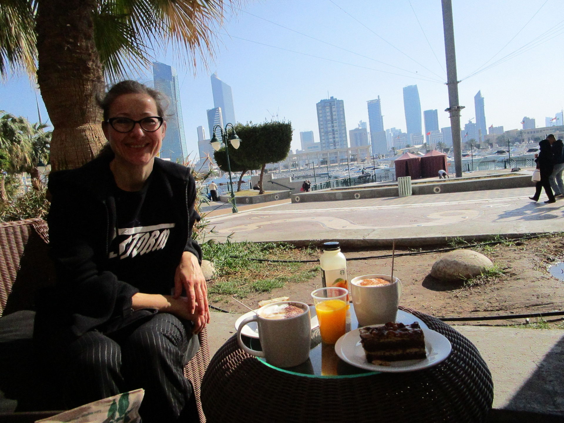 Gleich um die Ecke liegt die Souq Sharq Mall, in der wir den Starbucks mit unserer Anwesenheit beehren und uns ein leckeres Frühstück bestehend aus einem Cappuccino und zweierlei klebrige Kalorienbombenvariation bestellen, die wir draußen in der Sonne zu uns nehmen wollen. Die Temperaturen sind hier aktuell auch mittags nicht deutlich höher als in Deutschland, aber die Sonne hat deutlich mehr Strahlkraft und so läßt es sich unmittelbar am Wasser des Persischen Golfs zur ersten Mahlzeit des Tages prima aushalten.