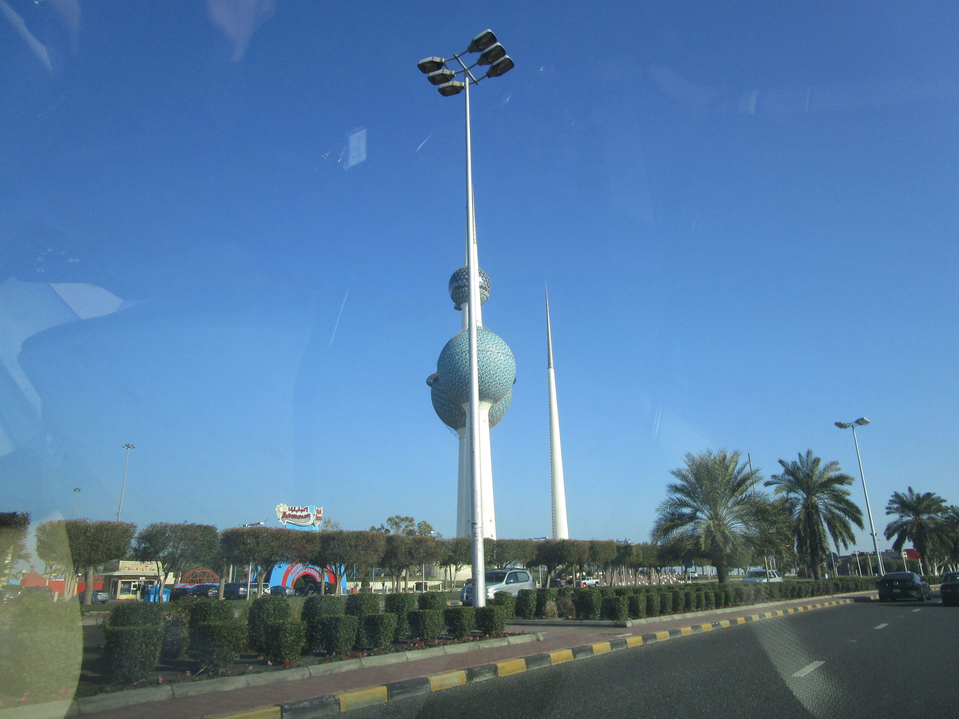 Dies ist der Beweis, dass wir zu doof für Sightseeing sind. Anita hat versucht, die kuwaitischen Wassertürme zu fotografieren. Sie ist gescheitert, dies ist schon das bessere Bild. Beim nicht hochgeladenen Bild substituiere der Leser die Straßenlaterne durch eine Palme, welche die Türme komplett verdeckt.