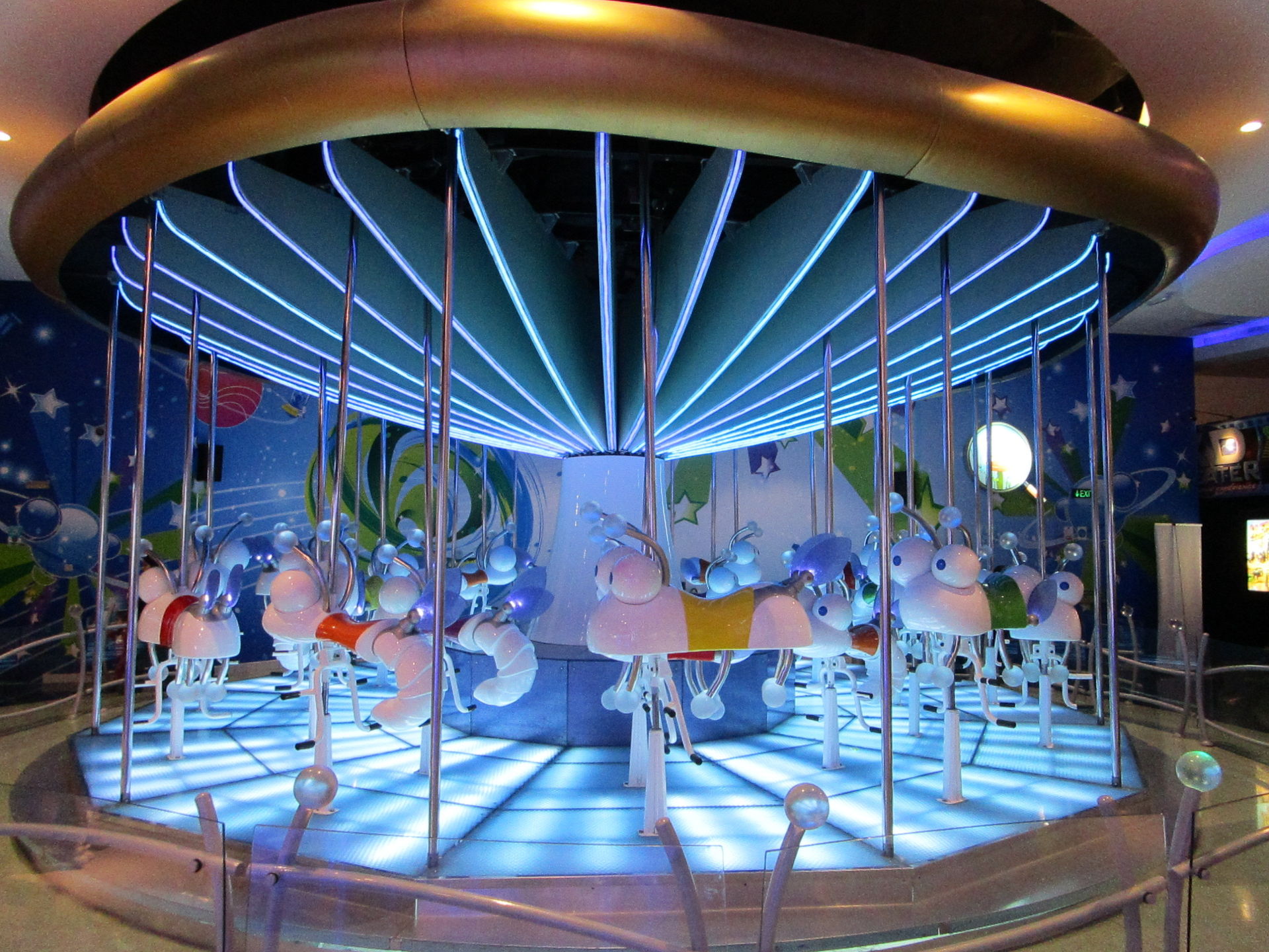 Fündig werden wir in einem der vielen Seitengänge, wo sich nicht nur eine gigantische KidZania Anlage befindet, sondern auch, ein kleines Stückchen weiter, Magic Planet Kuwait. Wie eigentlich immer in diesem Lande ist auch dieses FEC hauptsächlich für die Kleinen gedacht und eine Achterbahn finden wir leider auch nicht, aber dennoch beeindruckt uns der Park. Die Fahrgeschäfte hier glänzen durch Abwesenheit von Farbe, sie sind alle weiß! Da sie aber vom Design her so unglaublich witzig und knuffig gestaltet sind, wirkt die Form-Weiß-Kombination unheimlich stylisch. Schick, schick!