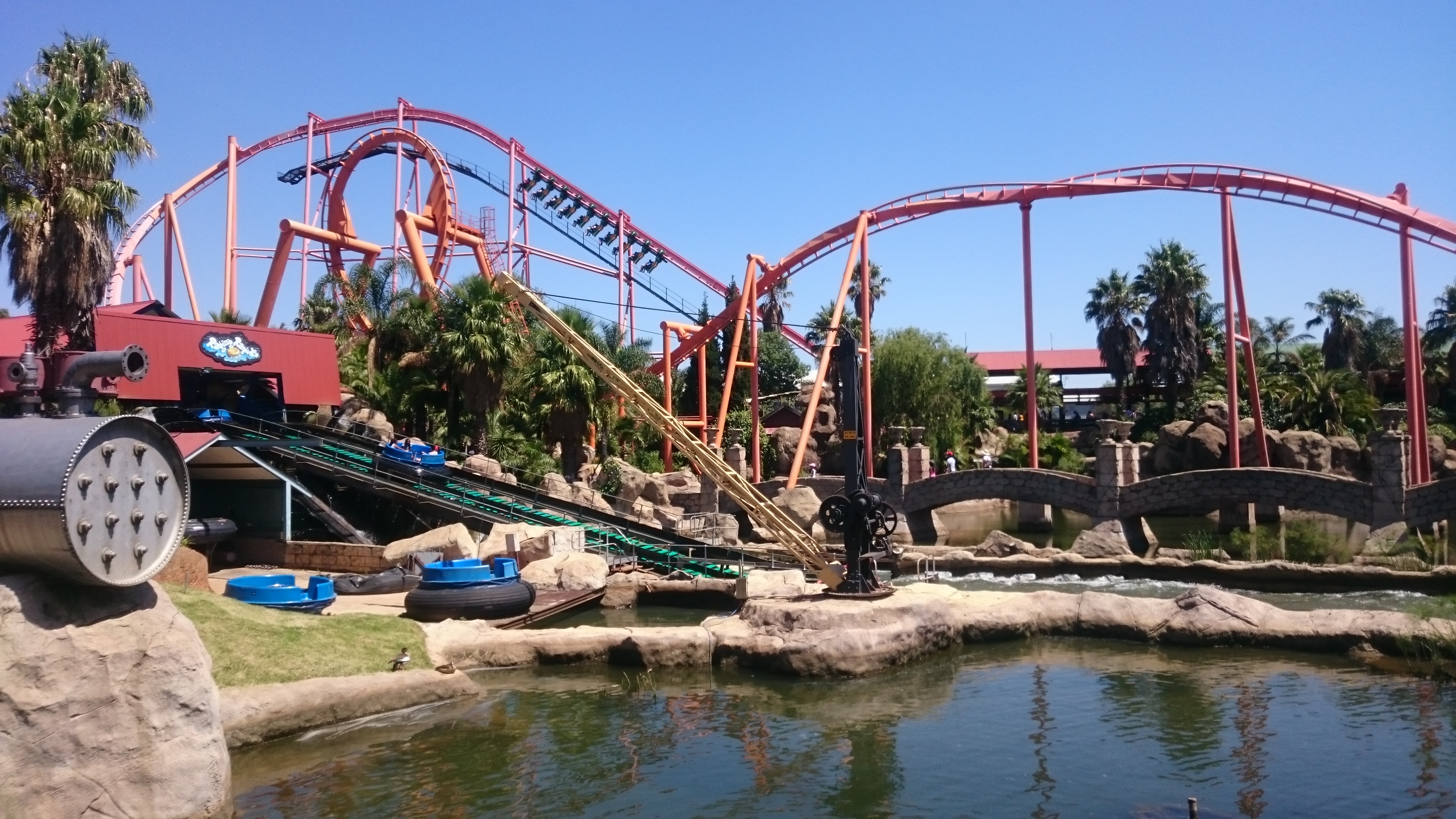 Da ich zuerst meine absoluten 'most-do' Attraktionen abhaken wollte bin ich danach direkt ans andere Ende des Parks gelaufen um den Tower of Terror, einen unter Eigenregie erbauten Divecoaster, zu fahren. Wie sich spaeter herrausstellte war das eine sehr gute Entscheidung, denn die Bahn hat eine sehr geringe Kapazitaet und die Abfertigung war in 'African time'. Obwohl ich nur vier Fahrten warten musste stand ich gut 20 Minuten. Die Warteschlange hat sich im Laufe des Tages mehr als verdoppelt so das es leider nur bei der einen Fahrt blieb.