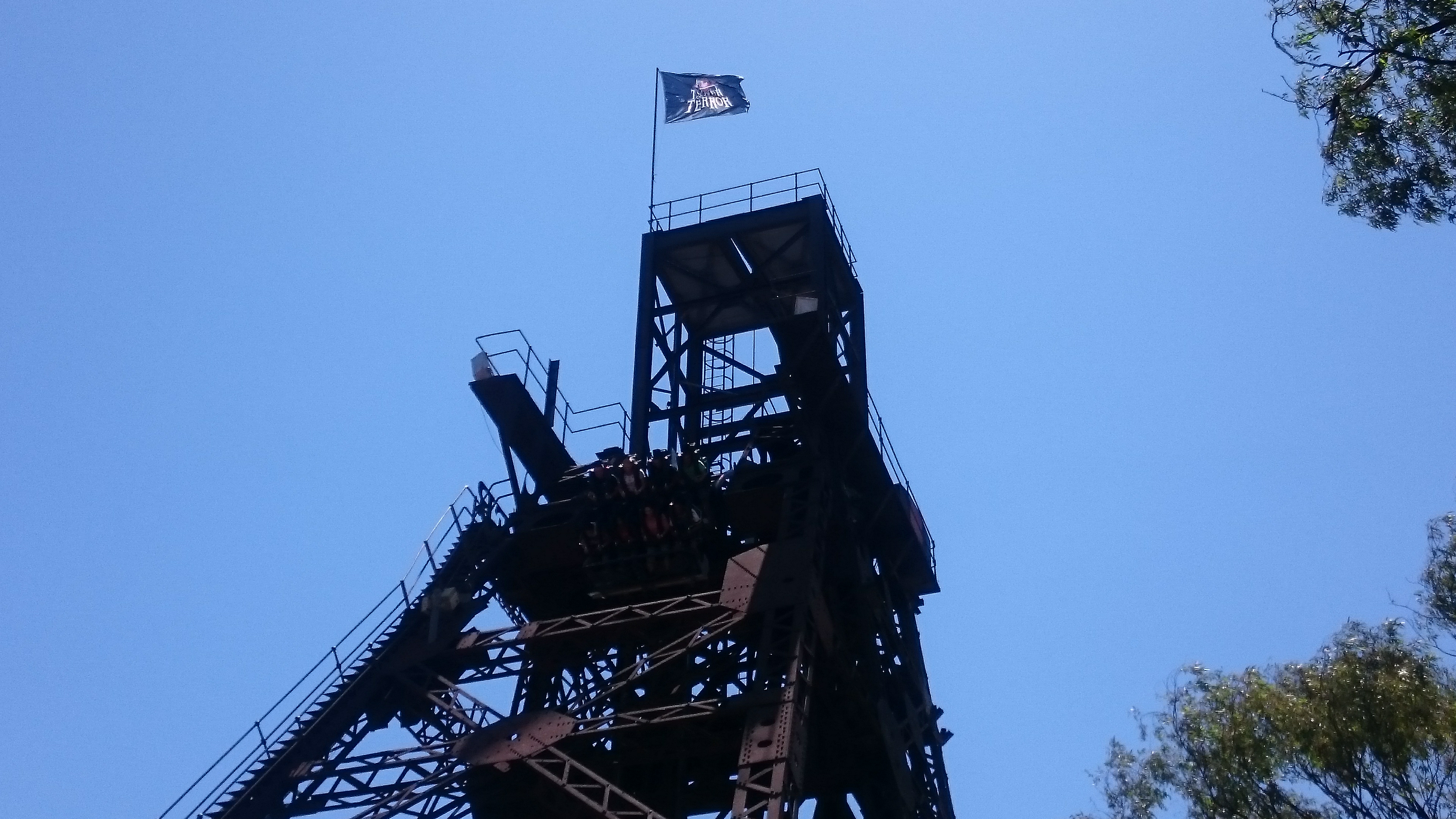 First Drop sind an einen orginal Goldmienenturm gebaut, was fuer eine tolle Optik sorgt und sich quasi von alleine thematisiert. Laut RCDB hat die Bahn 6,3