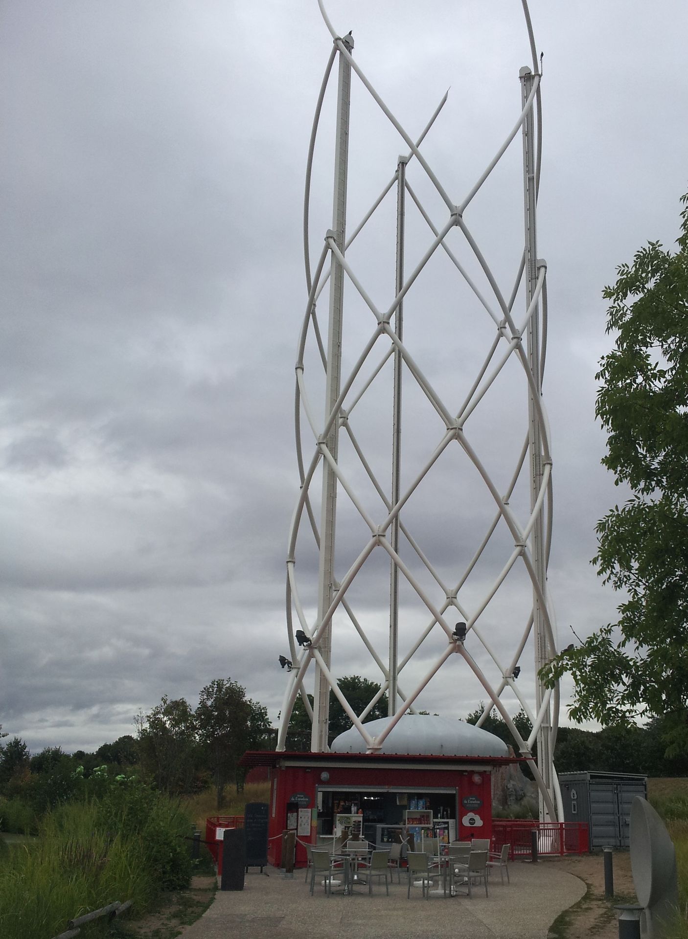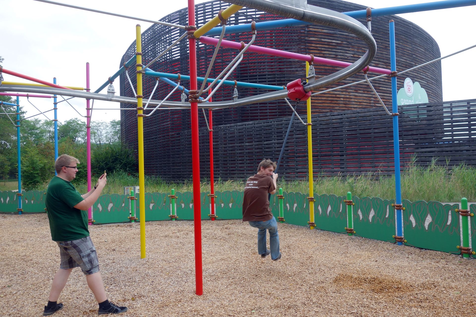 In 35 Metern Höhe kann man dann ein bisschen die Aussicht und sein Getränk genießen. Bilder habe ich davon leider nicht gemacht, ich hatte irgendwie Angst, dass mir das Handy beim aus der Hose ziehen runterfallen könnte. Zumal wir uns strategisch ungünstig mit dem Rücken zum Park gesetzt hatten. Drehen kann sich der Aussichtsturm nämlich nicht. Außerdem steht der Mitarbeiter für Fragen zur Verfügung. Leider sprach er nur wenig Englisch und wir nur wenig Französisch. Das machte die Kommunikation ein wenig schwierig. Aber wir konnten immerhin herausfinden, dass die Besucherzahlen ganz gut sein sollen - auch wenn wir uns an dem Tag kurz vor Schließung doch ziemlich einsam vorkamen. Besonders an warmen Tagen soll es aber auch mal voll werden können. Demnach war die Umgestaltung wohl ein Erfolg. Eine festgelegte Fahrtdauer gibt es auch nicht. Zumindest solange unten keine weiteren Fahrgäste warten. So blieben wir eine gute Viertelstunde oben, bis es dann doch langsam frisch wurde und wir den Auftrag zur Abfahrt gaben. Danach wurde es auch schon langsam Zeit, in Richtung Ausgang zu gehen.