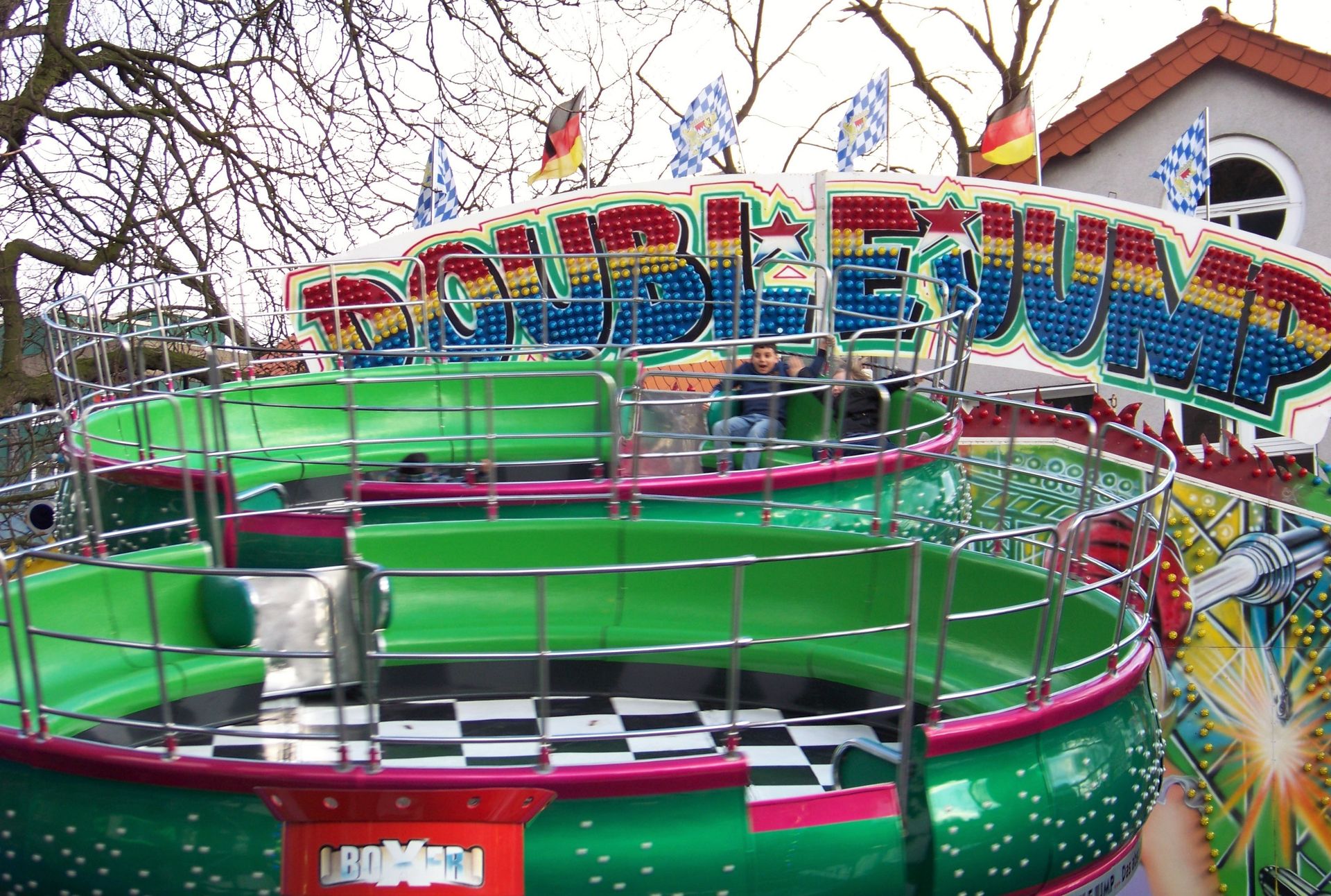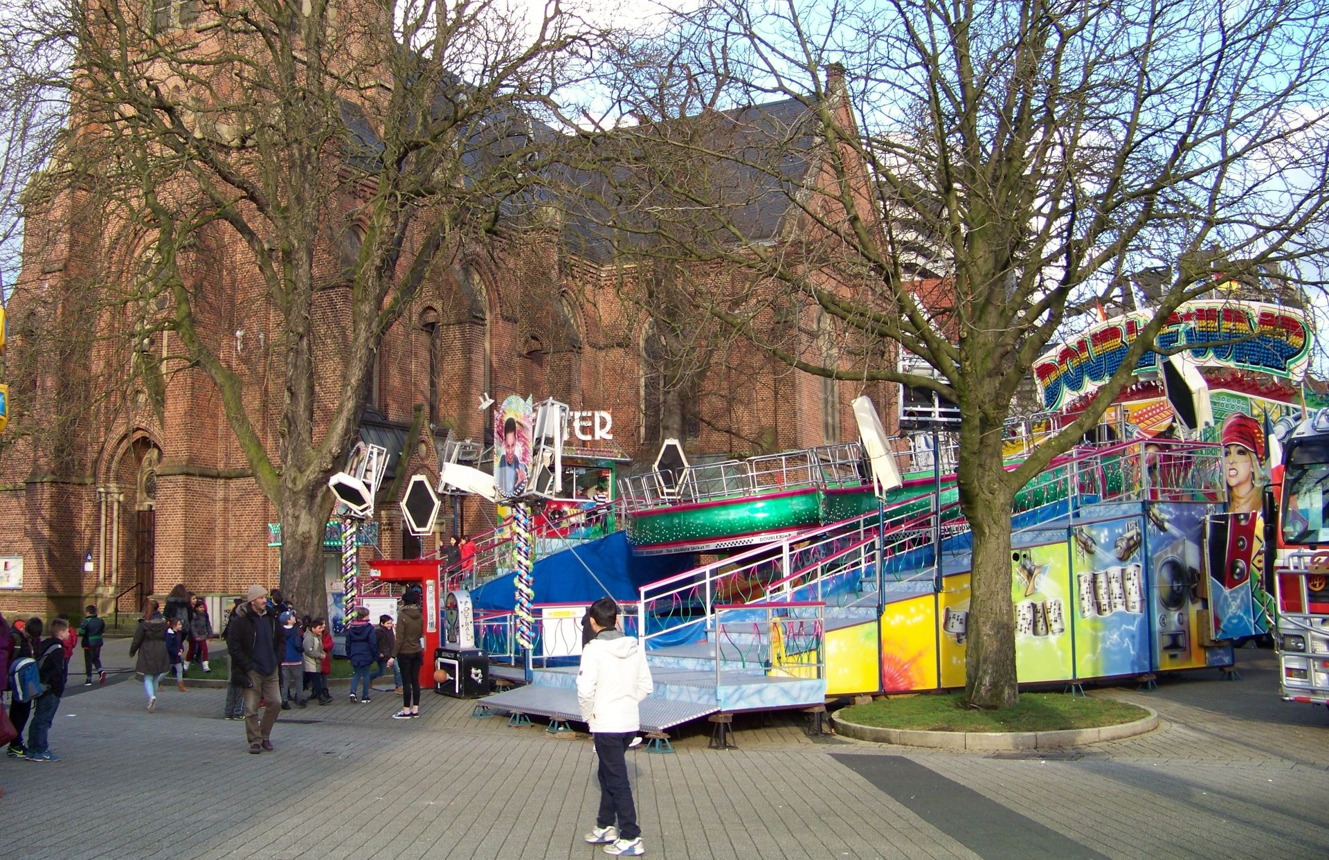 Am südlichen Ende der Kirmes fand man auf dem Platz zwischen Kreuzkirche und Archäologiemuseum das Laufgeschäft Time Factory und Petters Double Jump vor, der hier während meines Besuchs Mühe hatte, sein Publikum zu finden.