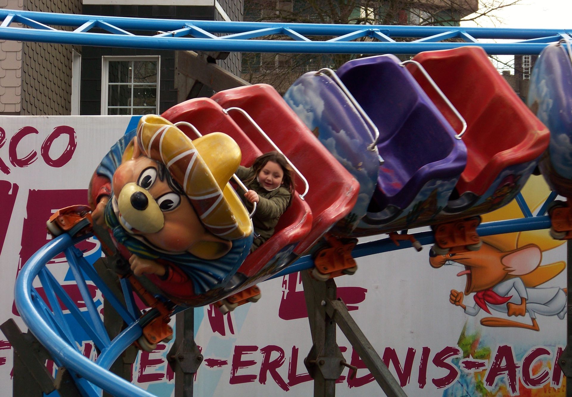 Zwei Schilder in der Fußgängerzone weisen daraufhin, dass es noch einen weiteren Kirmesplatz gibt, der jedoch vom restlichen Geschehen der City-Kirmes abgetrennt ist. Hier standen ziemlich dicht beieinander der Musik Express von Reminder, der kleine Break Dance von Bonner und die Kinderachterbahn Speedy von Welte, bei der die Schienen über die Winterpause den nächsten Farbwechsel gemacht haben.