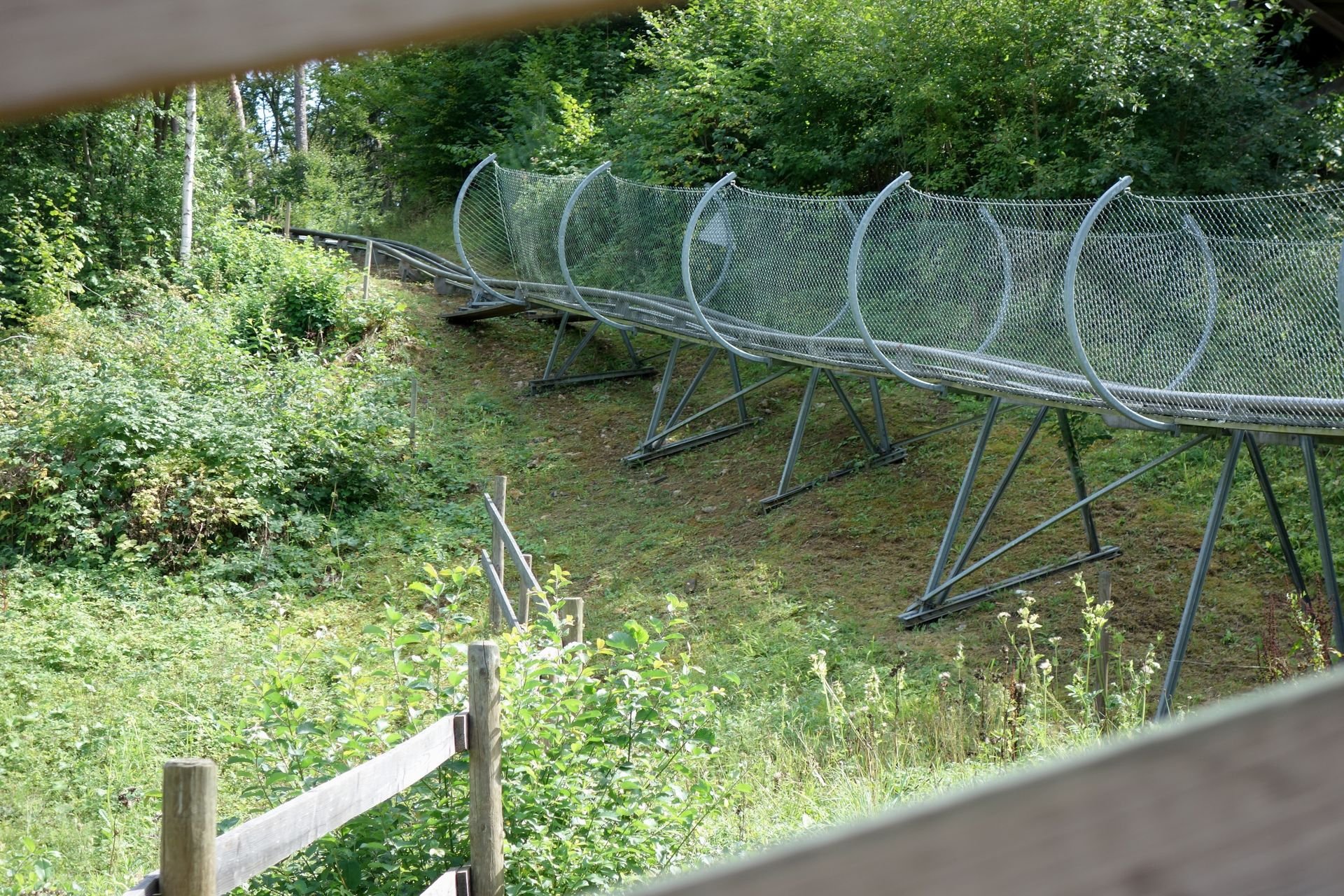 Ihr könnt euch sicher denken, dass eins zum anderen kam und ich natürlich direkt hinter einer Bremserin auf die Strecke gehen musste. Und wenn ich Bremserin sage, dann meine ich auch Bremserin. Beim 50m-Schild, also schon in der ersten richtigen Kurve hing ich ihr bereits direkt im Nacken. Markus folgte wenig später. Auf der Homepage wird die Abfahrtsdauer mit 2-5 Minuten angegeben. Tatsächlich dürften wir die angegeben 5 Minuten für die 1000 Meter lange Fahrt über 70 Höhenmeter gebraucht haben. Gefühlt waren es aber mindestens 20 Minuten in Schleichfahrt...