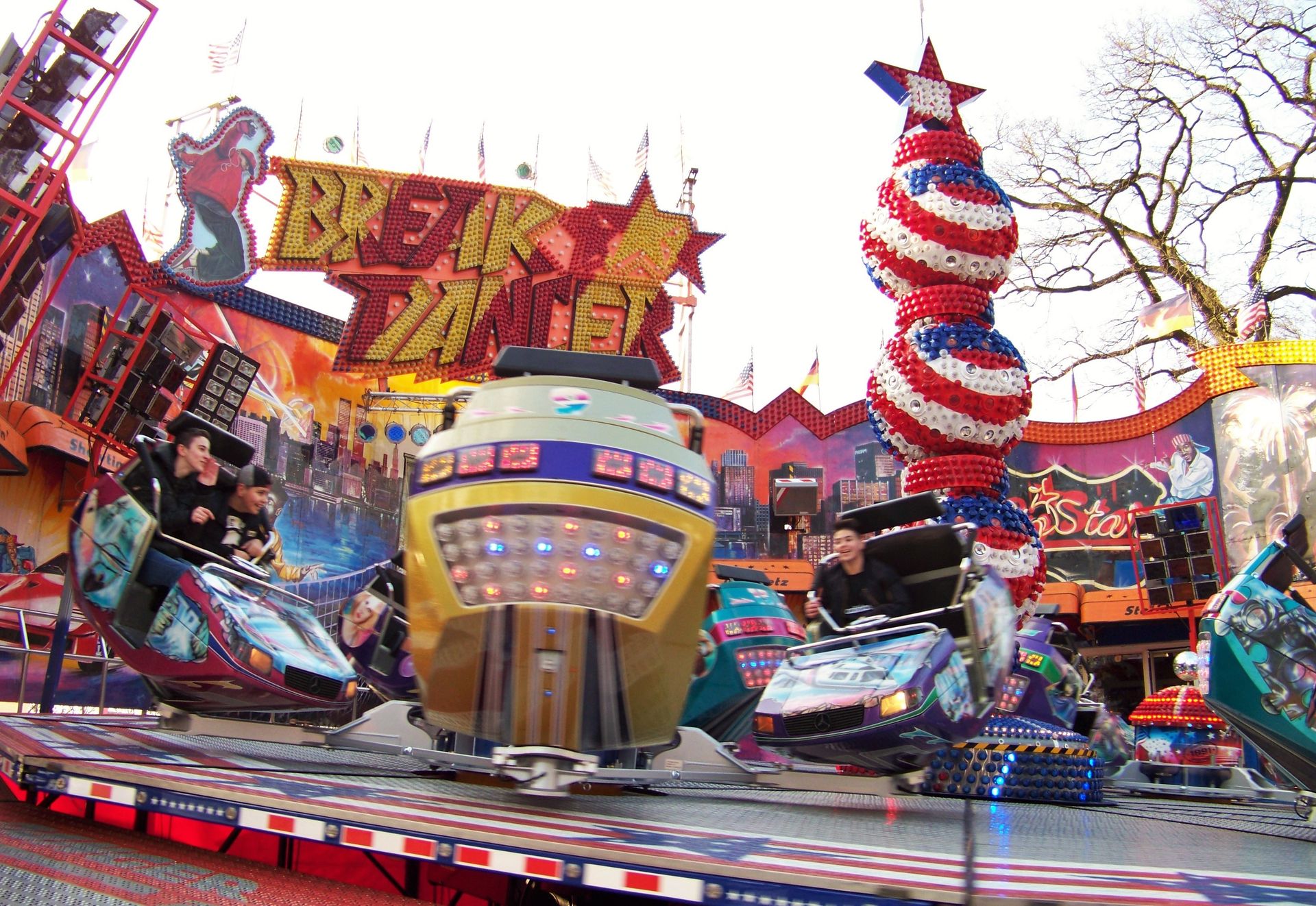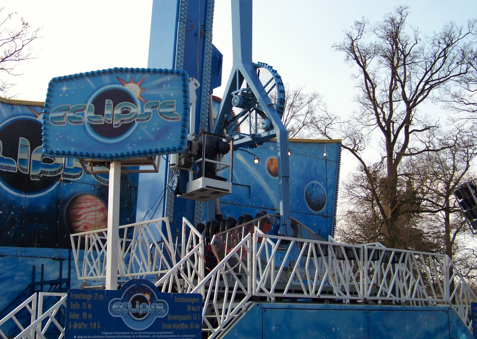 Genug gejammert, denn die Besetzung der diesjährigen Ausgabe der Kirmes, die ziemlich direkt neben dem Ikea-Möbelhaus statt findet (allerdings von dort aus durch den Bahndamm kaum sichtbar ist. Warum wirbt man nicht genau dort für die Veranstaltung? Es würde sicher so mancher der zahlreichen Kunden des Möbelhauses spontan nebenan bei der Kirmes vorbeischauen. Die Hauptzielgruppe von Möbelhaus und Kirmes überschneidet sich schließlich schon...), ist in diesem Jahr verhältnismäßig stark. Neben den üblichen Verdächtigen wie Musik Express und Flying Swing von Krause, Engelbrecht-Breaker (jetzt ebenfalls mit neuen SAD-Kreuzen ausgestattet) und Autscooter von Schneider, sind außerdem das Laufgeschäft Crazy Outback von Hofmann-Jehn und Kortens Eclipse vor Ort. Letzterer ging gestern Abend allerdings erst um halb sieben in Betrieb. Vorher hatte man scheinbar noch mit technischen Schwierigkeiten zu kämpfen.