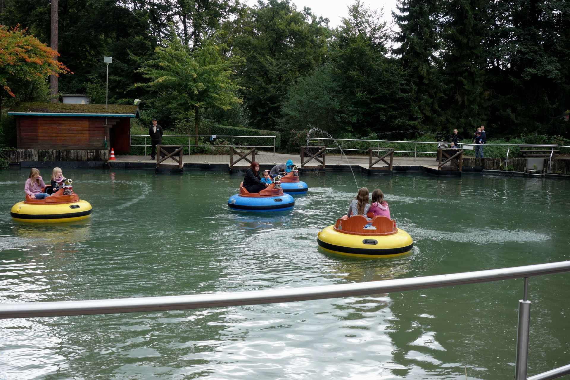 Auf dem See an der Talstation fahren nur noch Bumper Boats mit Spritzkanonen. Die Tretboote mussten umziehen.