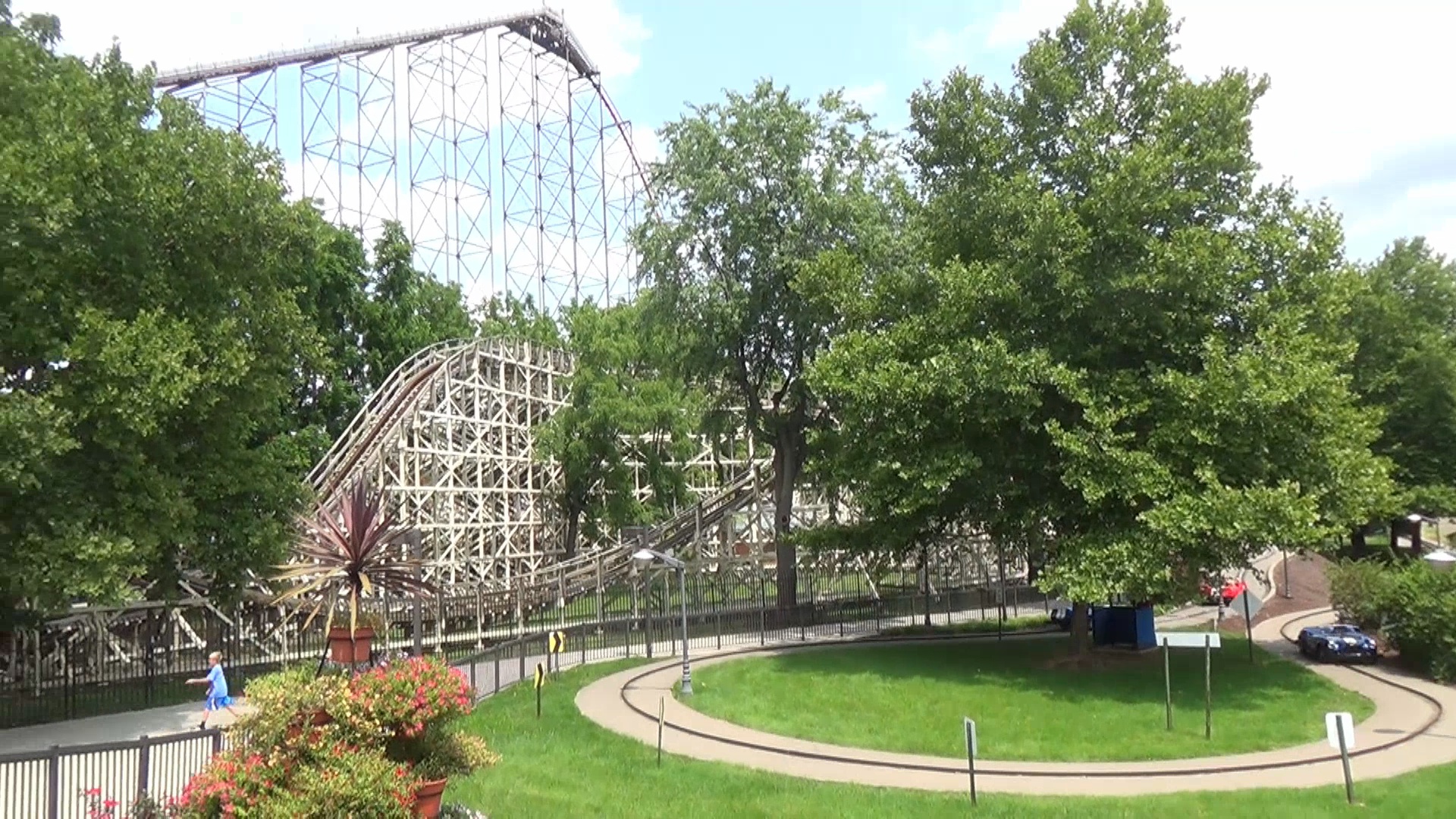 First Drop und den ersten Hügel von Steel Force abzulichten. Die Fahrt auf dem Altholz führt durch den unteren, mit mächtigen Bäumen bepflanzten Innenbereich des Parks und beschreibt ein recht simples Out-And-Back Layout.