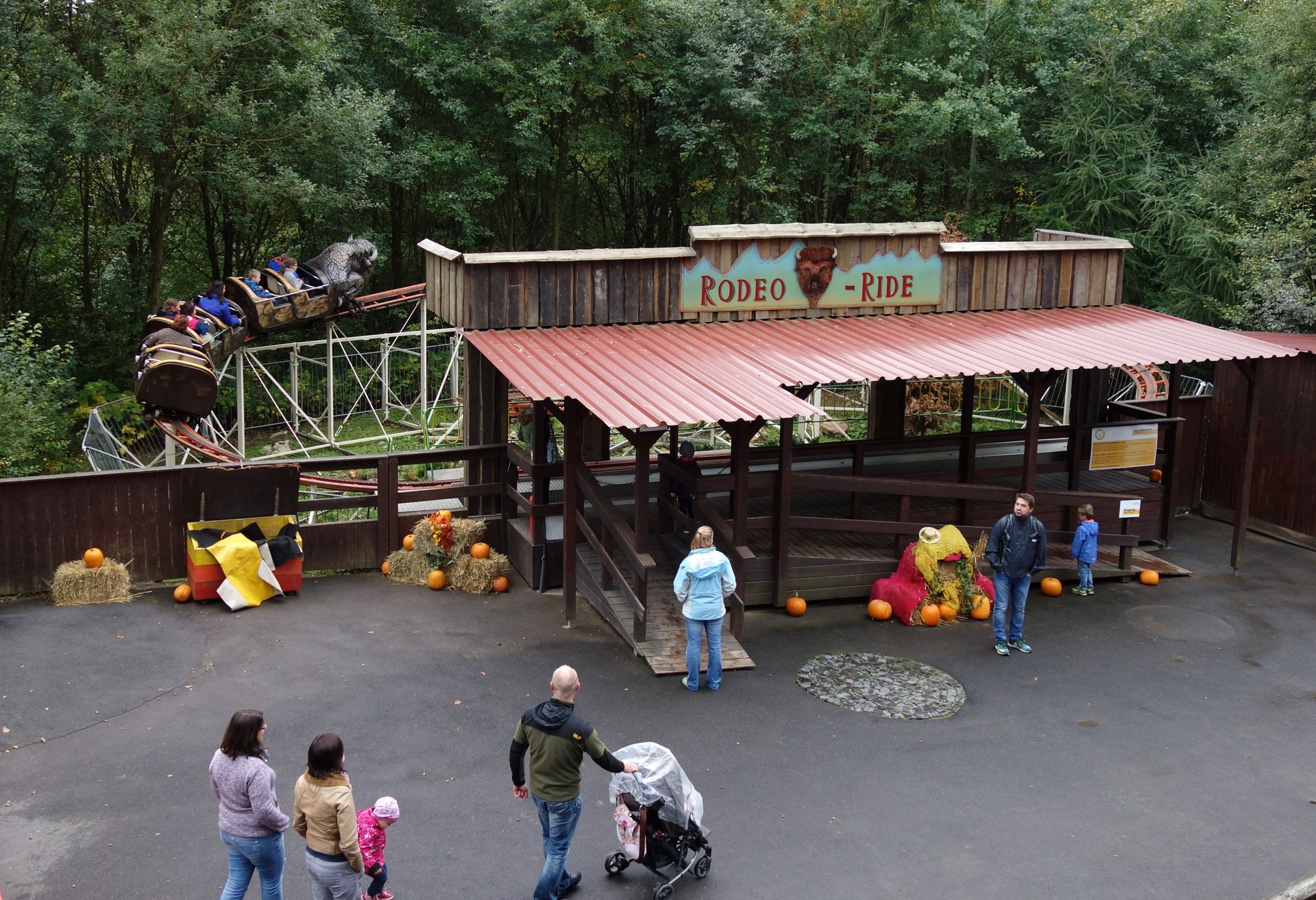 Bis 2014 hieß die Anlage noch Drachenbahn und hatte einen entsprechend gestalteten Zug. Für die Saison 2015 wurde der Zug aber zu einem Büffel umgestaltet und die Station ein wenig im Wild-West-Stil gestaltet. Nun dreht die Bahn als Rodeo Ride ihre Runden. In unserem Fall waren es glaube ich vier am Stück.