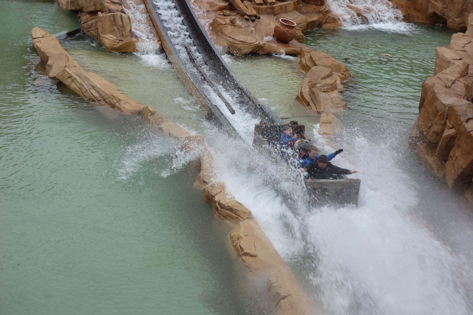 Zunächst liefen wir vor dem ersten Drop auf ein leeres Boot auf. Dann standen wir längere Zeit auf der ersten Weiche. Auch vor dem Rückwärts-Drop hatte sich eine kleine Bootsschlange gebildet. Wir hatten also genug Zeit, die Fiesta Cave mit dem nicht trommelnden Trommler zu genießen. Am Beginn des letzten Lifthills blieben wir dann ein letztes Mal kurz stehen, ehe wir endlich zum finalen Drop übergehen konnten.