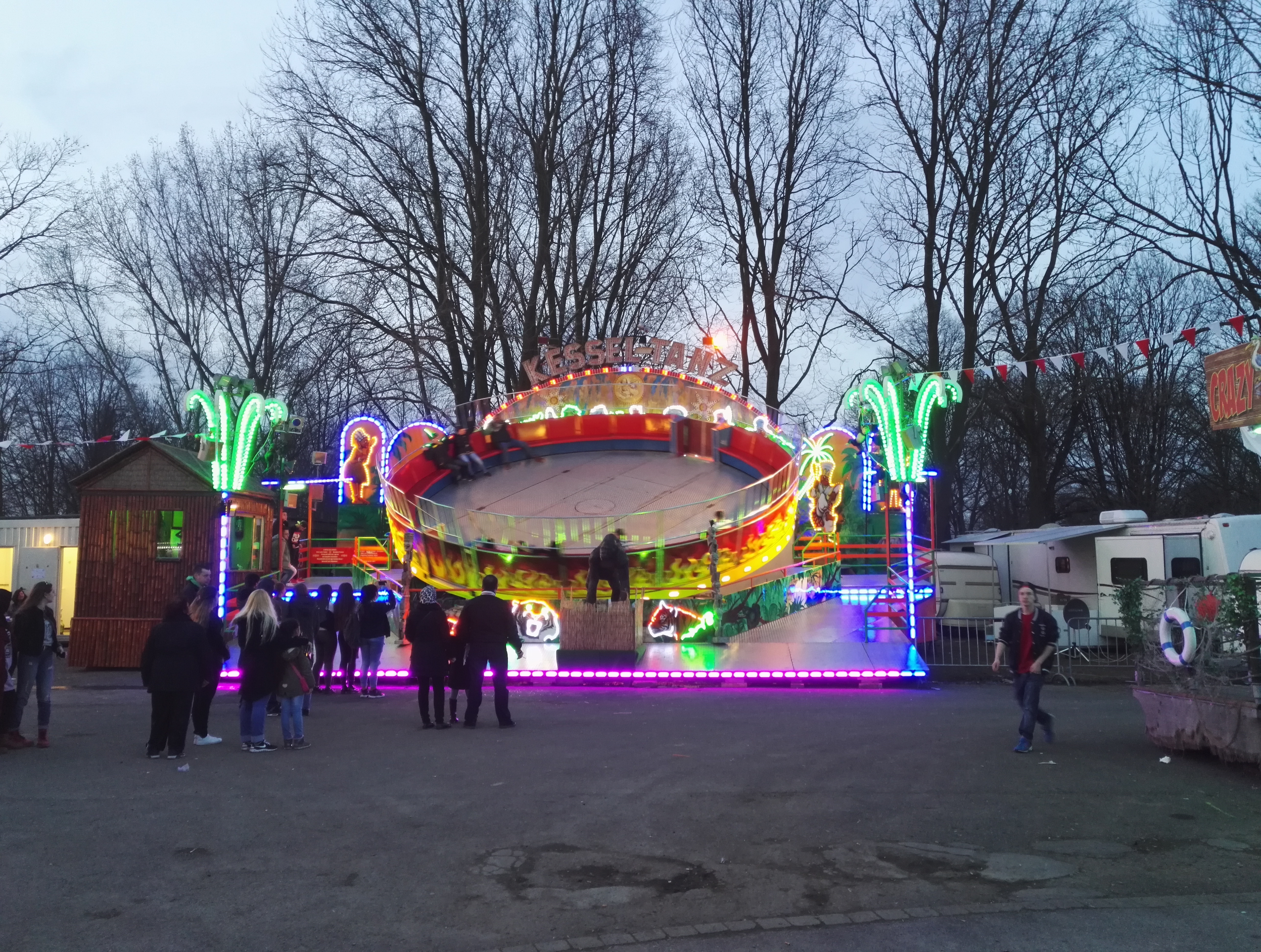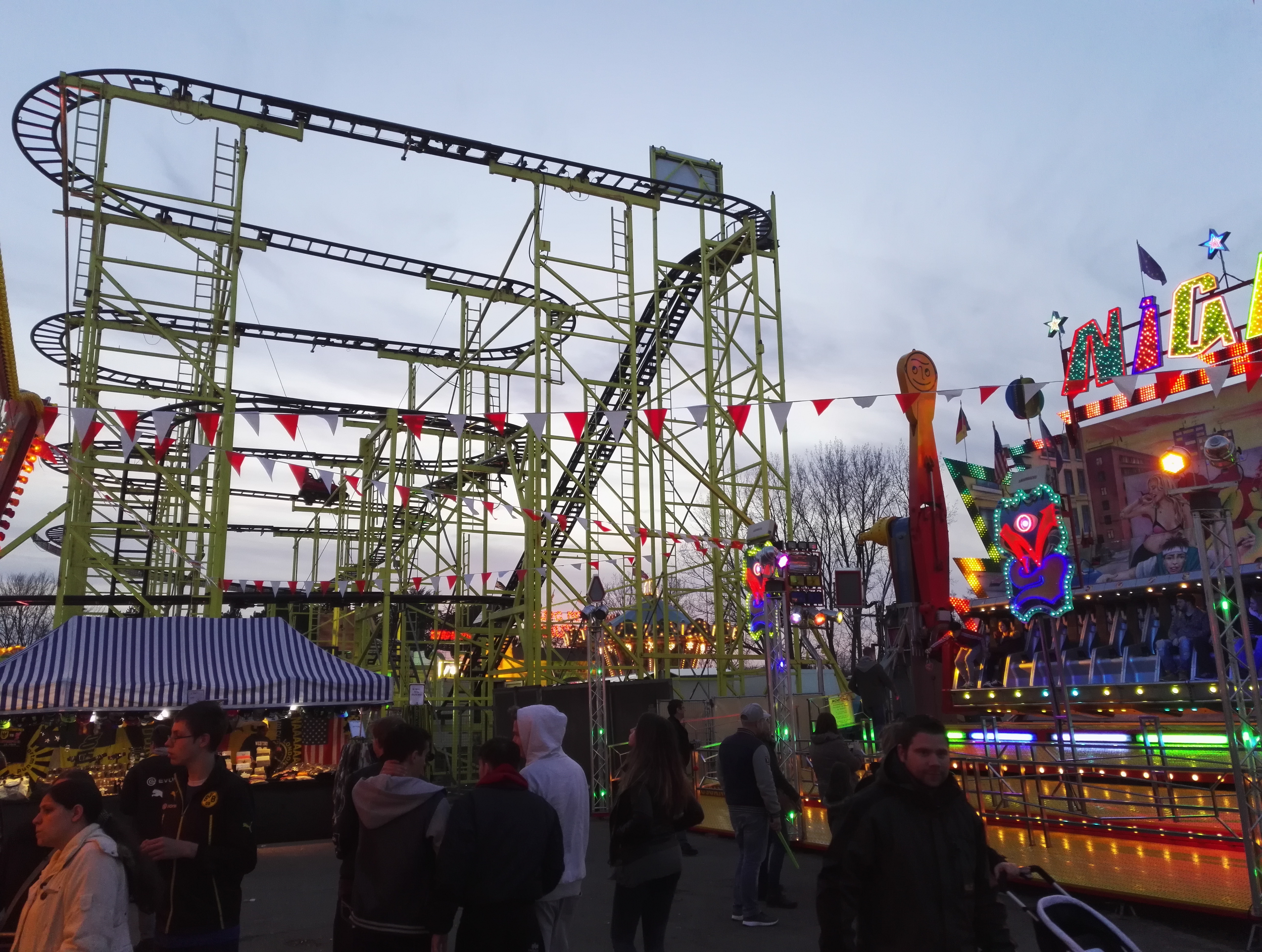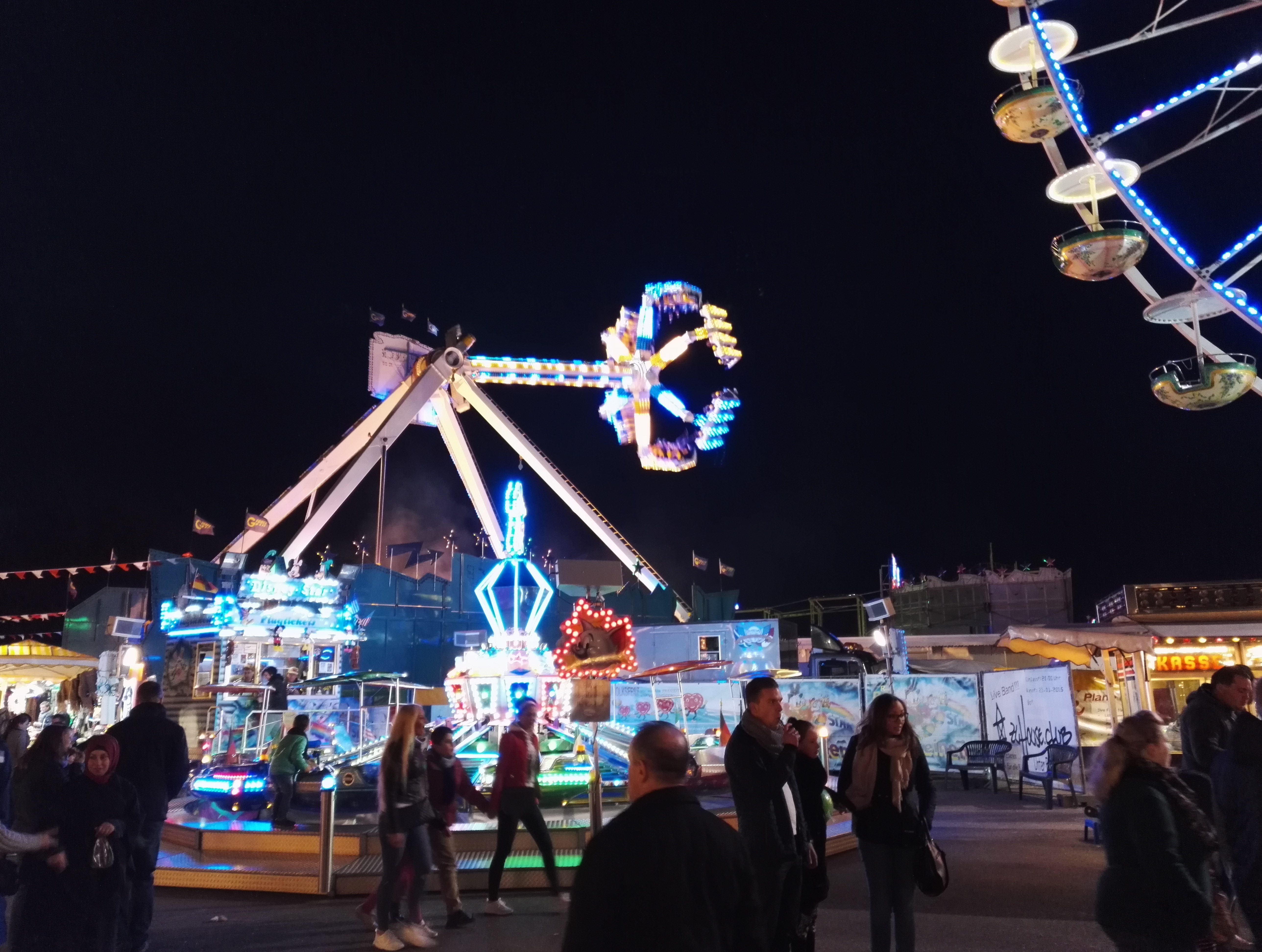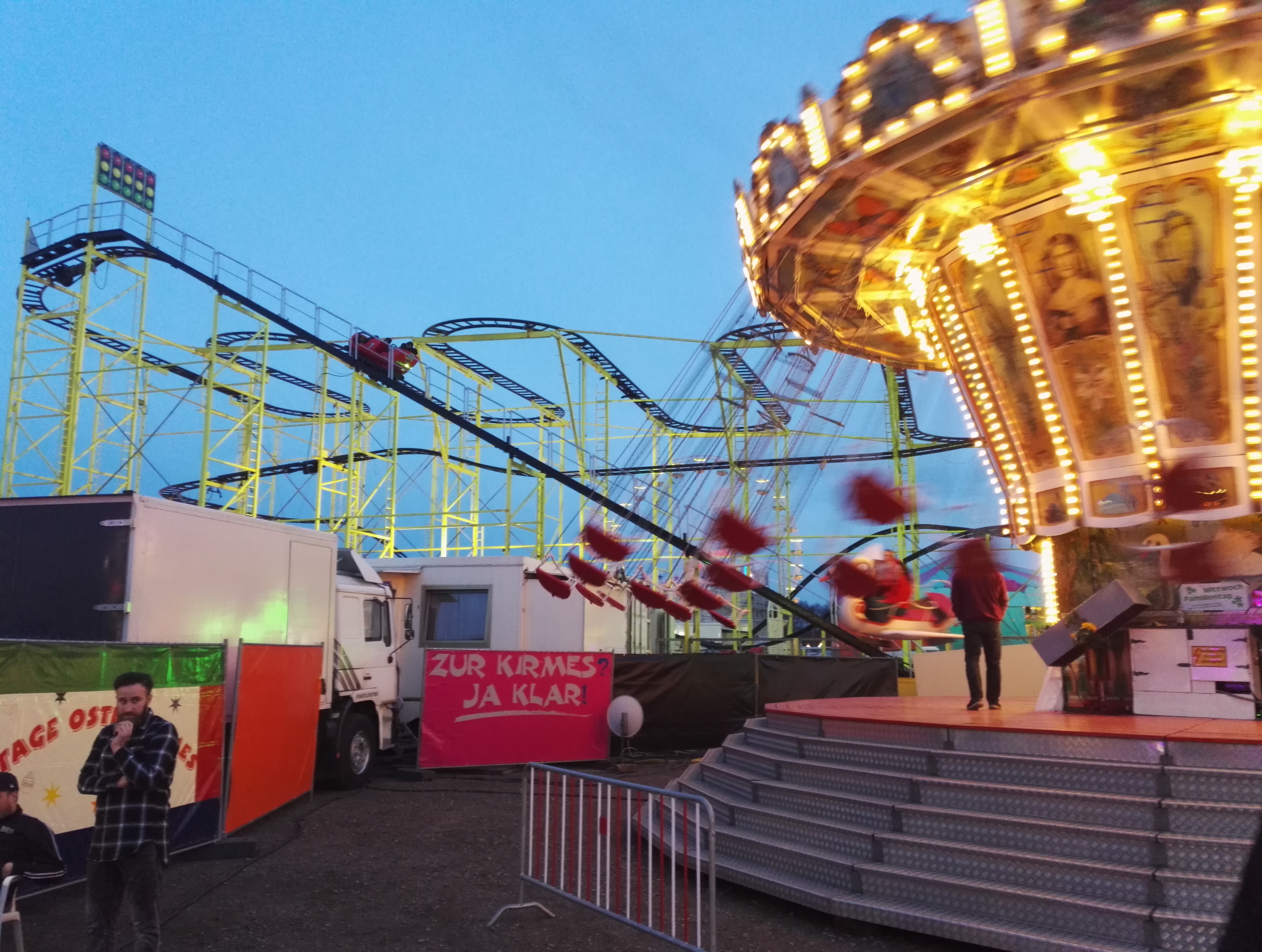 Die drei Autoscooter sollen verschiedene Geschmäcker ansprechen und zur Entzerrung auf dem Festplatz beitragen. So verkündet zumindest der gastgebende Schaustellerverein Rote Erde e.V. auf seiner Facebook-Seite das drei Scooter-Konzept. Bei Isken bildet sich bei meinem Besuch jedoch eine Traube um einen Hahnenkampf. Die übergewichtigen Sicherheitskräfte sind jedoch rasch zur Stelle und versuchen den Konflikt zu schlichten.