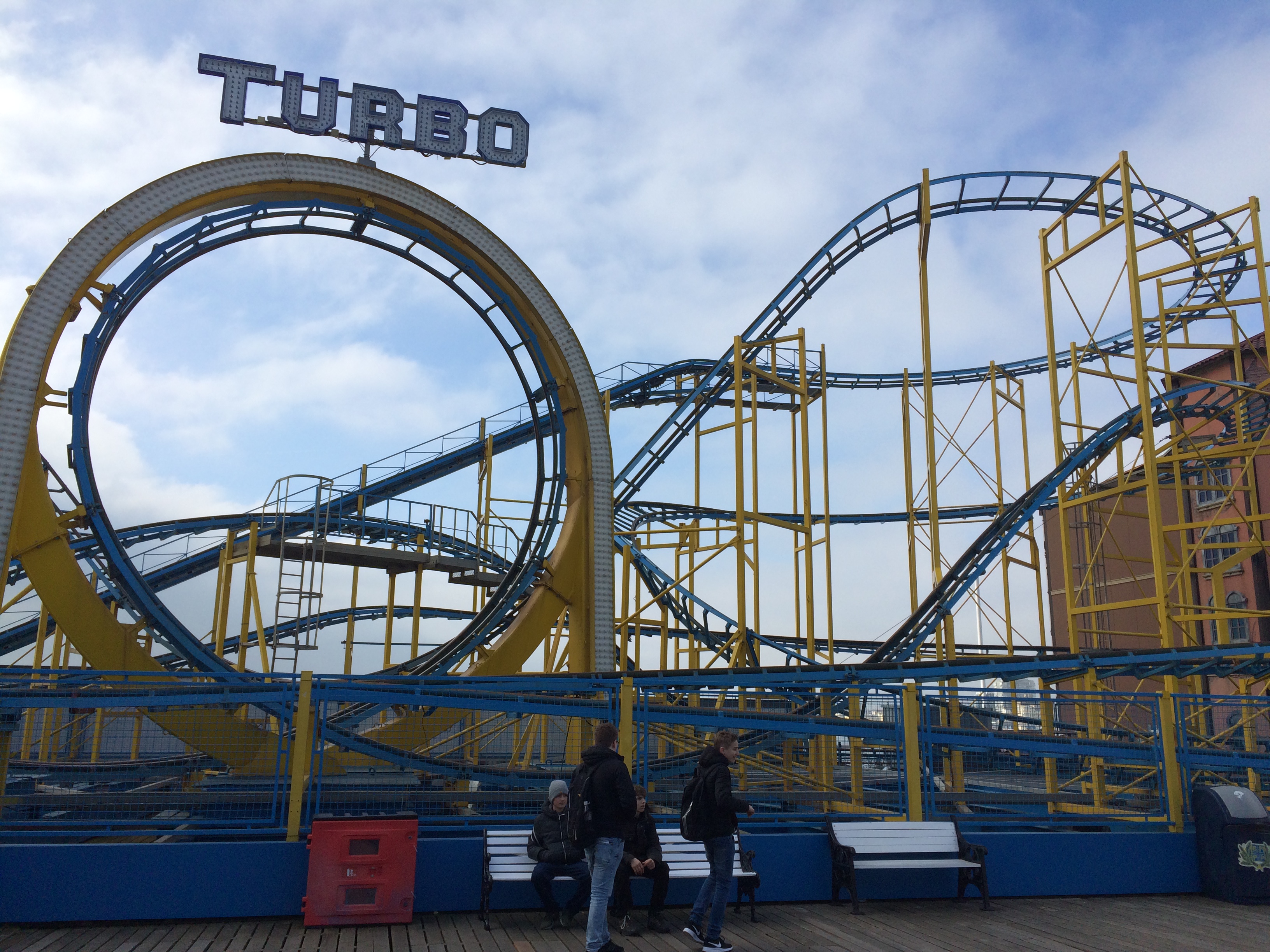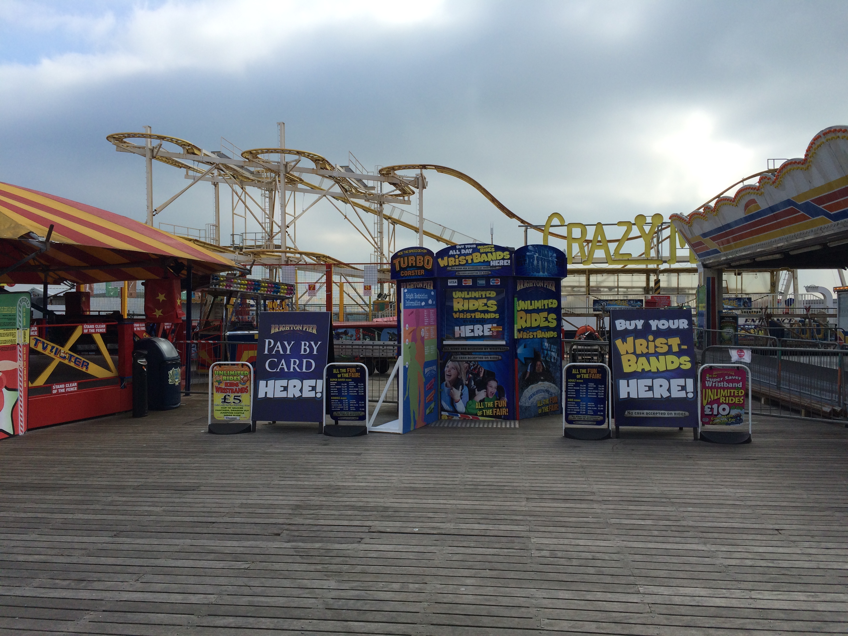 Brighton Pier? Jetzt kommt es mir in den Sinn, das habe ich doch schon öfter gehört und gelesen. Aber das hat Mitte März doch sicher noch geschlossen... oder? Die erste echte Aufgabe für meinen Roaming-Tarif, die dieser mit Bravour meistert: Heute ist es schon zu spät, aber am nächsten Tag ab 12 Uhr warten die Fahrgeschäfte auf Touristen. Schnell noch das Lineup gecheckt: Ein Pinfari Looper - ich war tatsächlich noch nie auf einem - und eine Spinning Mouse - warum nicht!
