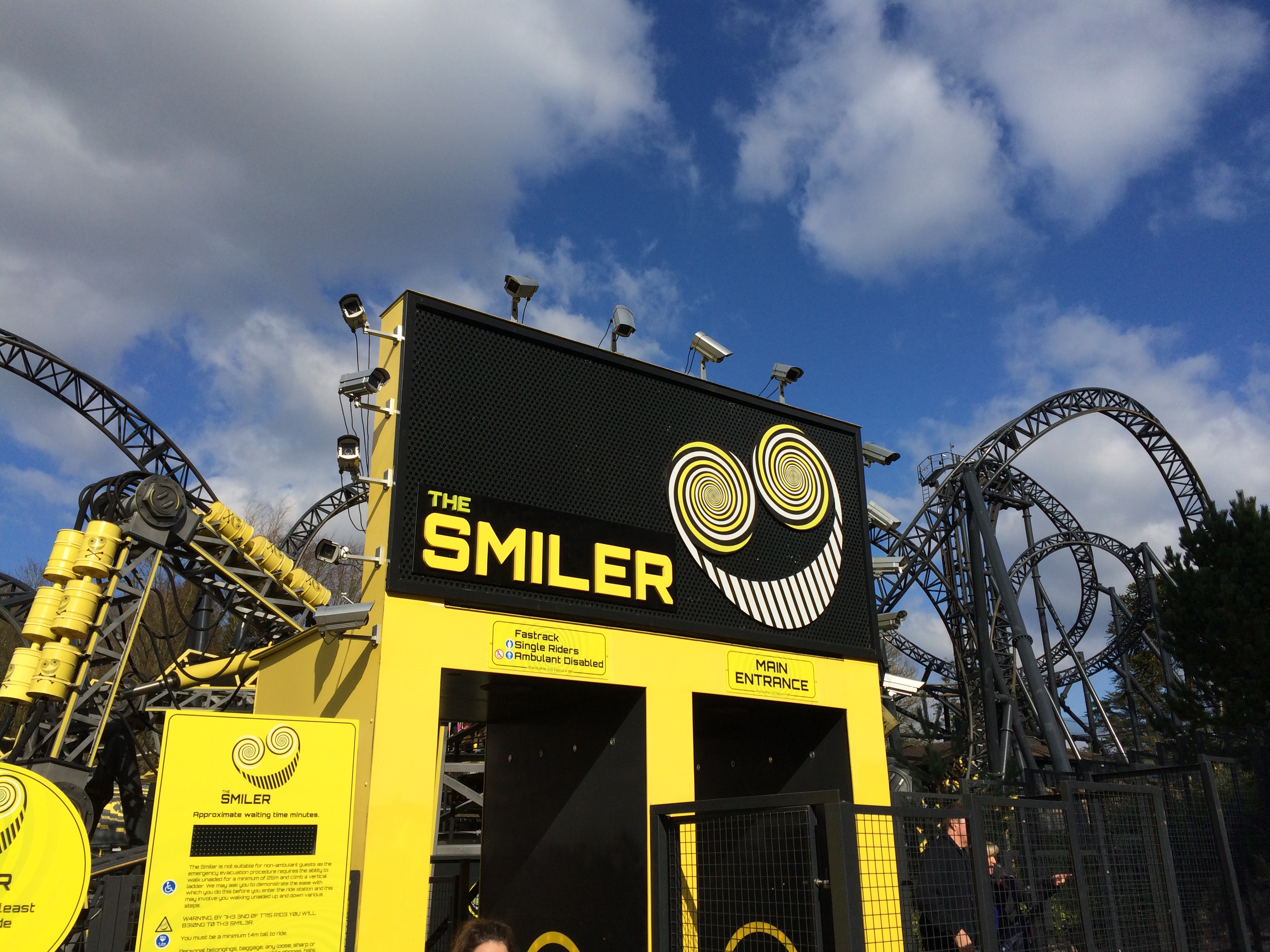 The Smiler, die Weltrekord-Überschlagsachterbahn mit dem Grinsegesicht und der umso traurigeren jüngeren Vergangenheit wartete. Schnell in die Single-Rider-Queue geschlüpft war ich erstmal beeindruckt von diesem wirklich dichten Schienengewirr, durch das die Warteschlange sich - ja - schlängelt. Die ersten kurzen Züge waren unterwegs und ich hatte Bock.