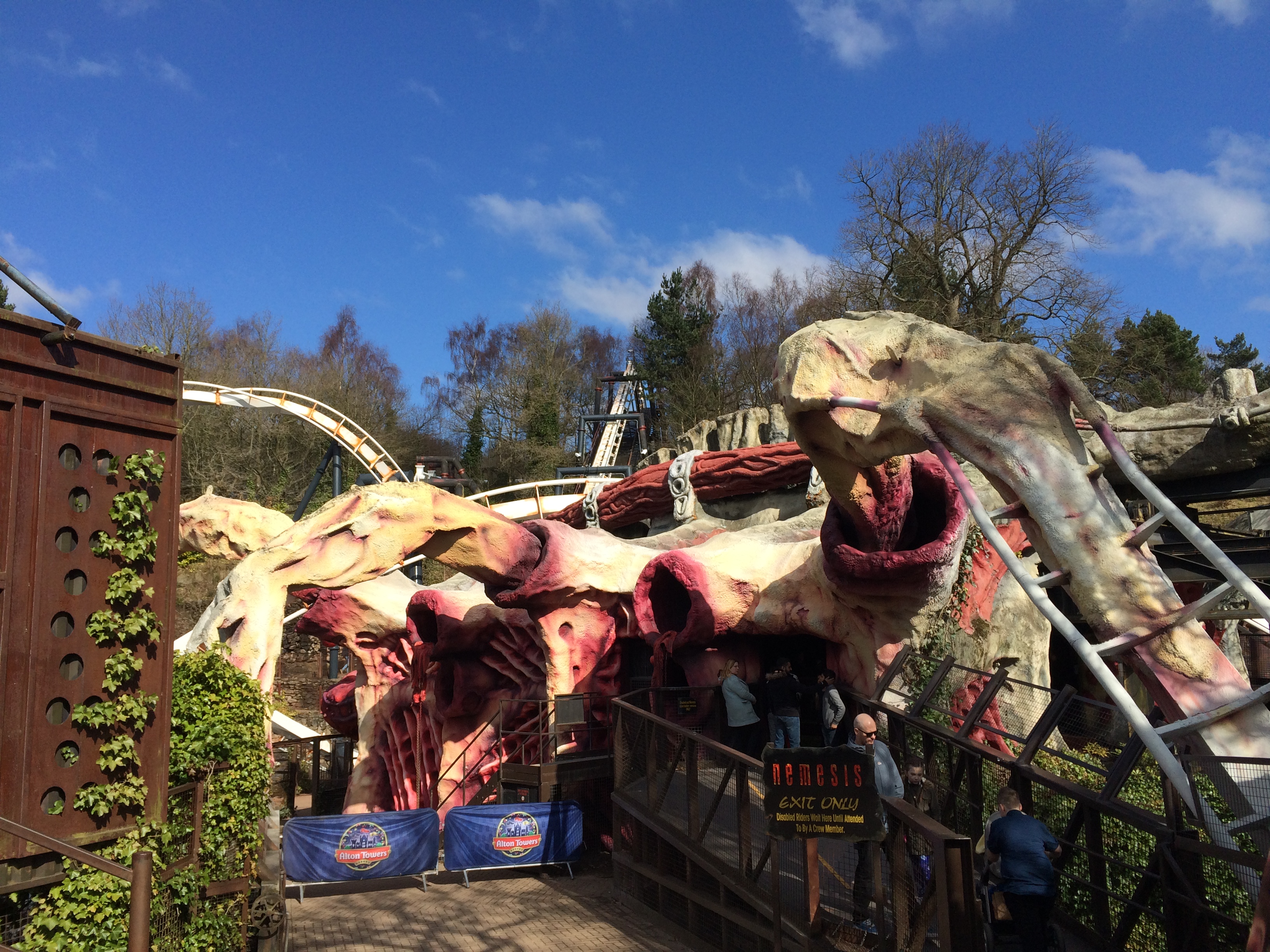 Das lag zum Einen am genialen weil besonderen Layout, zum Anderen an der unvergleichlichen Inszenierung samt echtem Terraforming. Kunstfelsen kann jeder, bei Nemesis sind die Felsspalten echt. Blutrote Wasserläufe und seltsame halb-biologisch wirkende Gebilde runden das einzigartige Thema um eine durch Bauarbeiten aufgeweckte und per Achterbahn gefesselte uralte Lebensform gekonnt ab. Leider waren die Wasserläufe diesmal noch nicht in Betrieb und die Bahn befand ich inmitten eines neuen Anstrichs, damit sie wieder schön alt aussehen kann - geairbrushter Rost und alles inklusive, im unfertigen Zustand aber hier und da etwas zu sauber. Außerdem war das Tal abgesehen von den Warteschlangen ohne ersichtlichen Grund abgesperrt - doof.