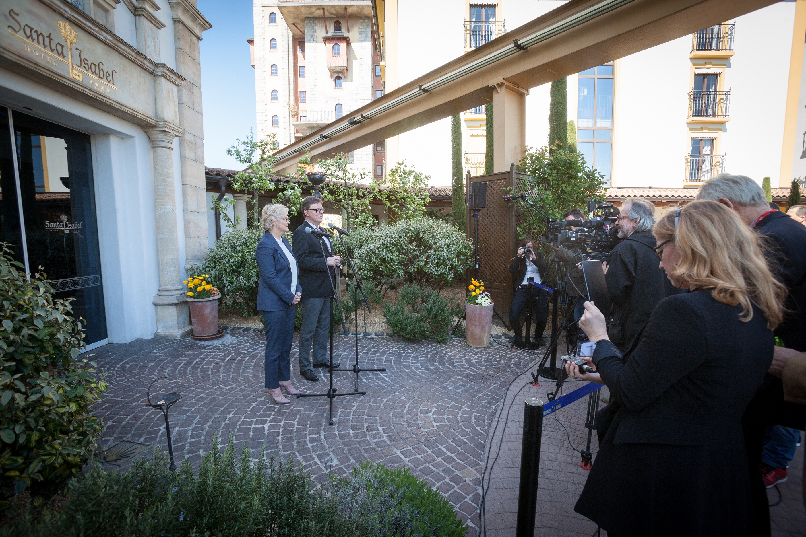 Die parlamentarischen Geschäftsführer Christine Lambrecht (SPD) und Michael Grosse-Brömer (CDU/CSU) beim Presseauftakt vorm 4-Sterne Superior Hotel „Santa Isabel“